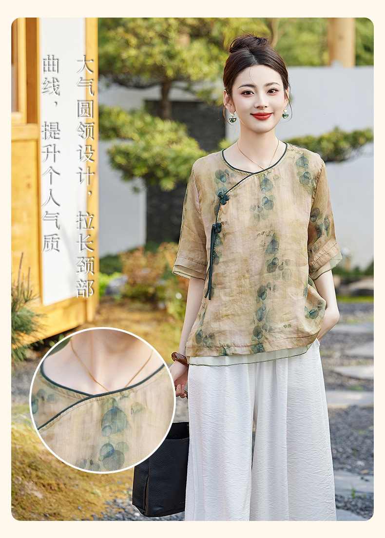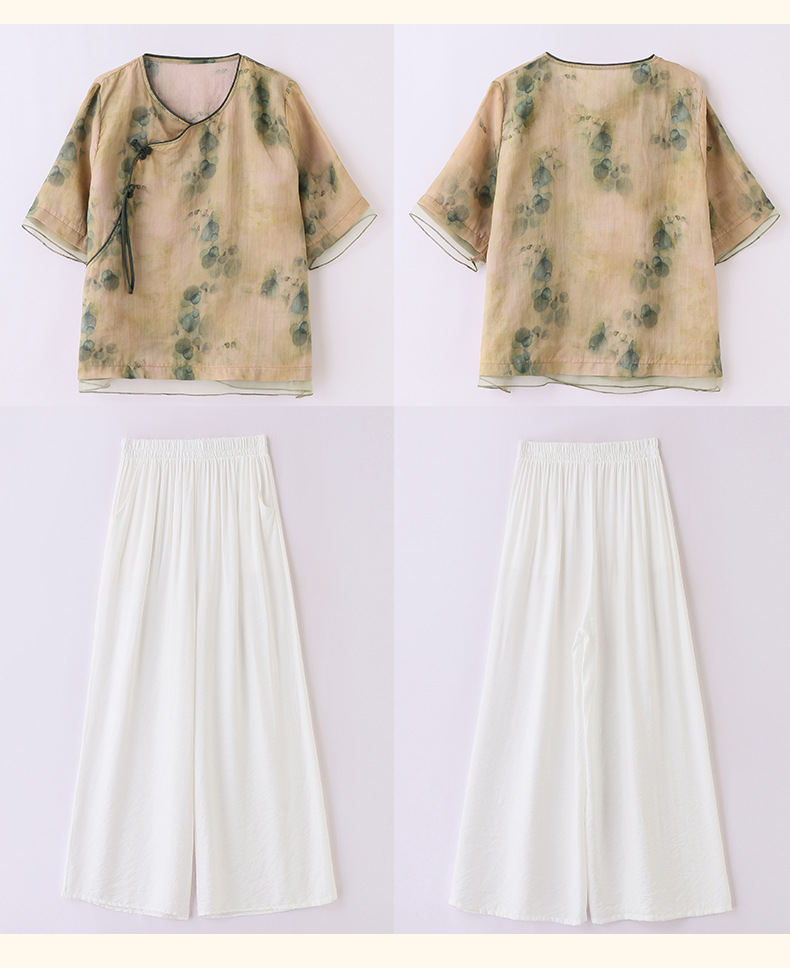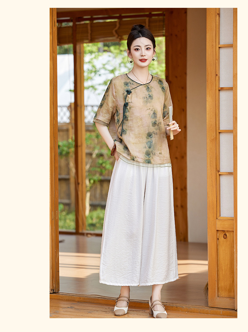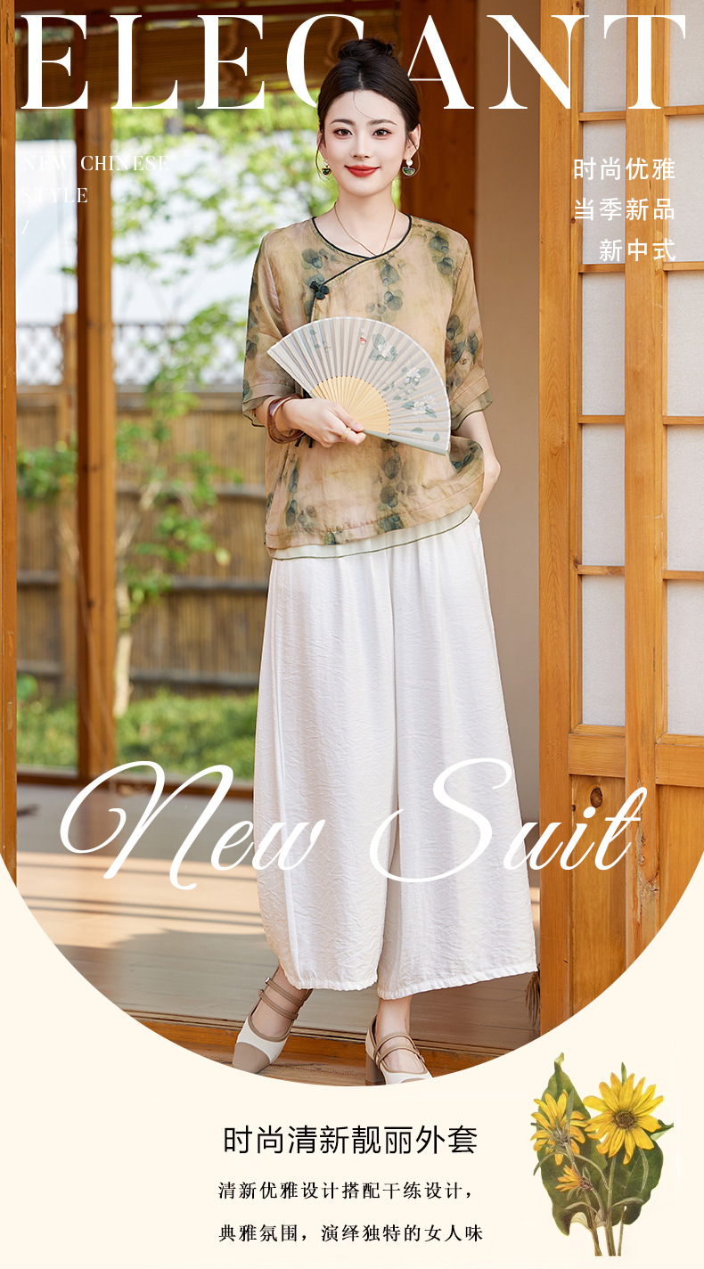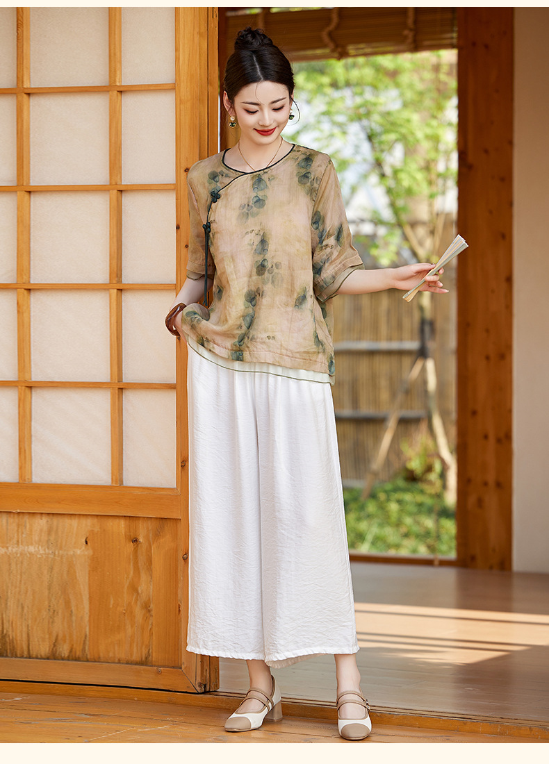 丁摩 高端碎花上衣苎麻【套装】亚麻女装夏季时尚两件套棉麻阔腿裤5ZF-86122