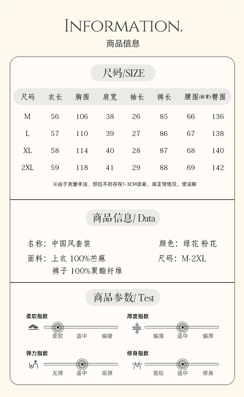 面料:上衣100%苎麻 裤子100%聚酯纤维