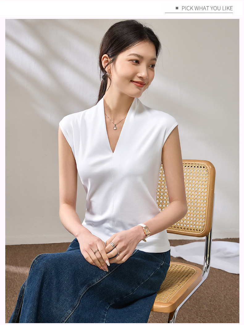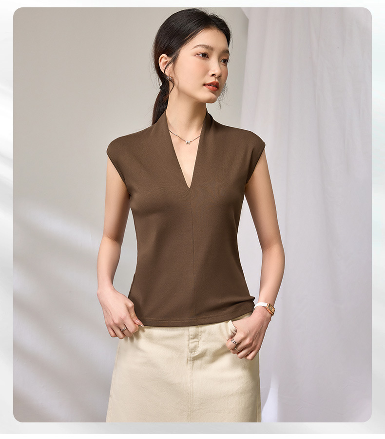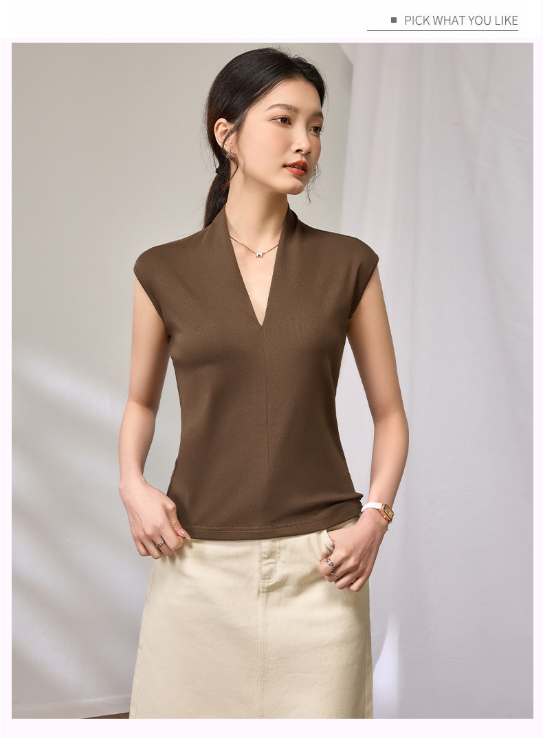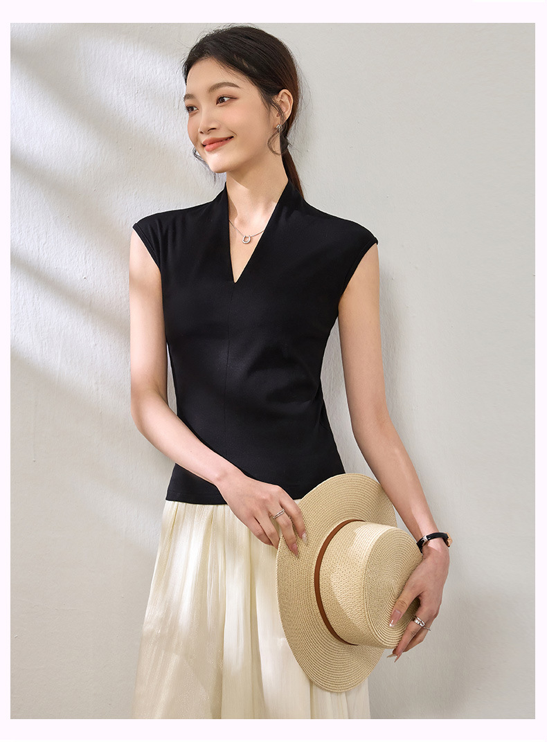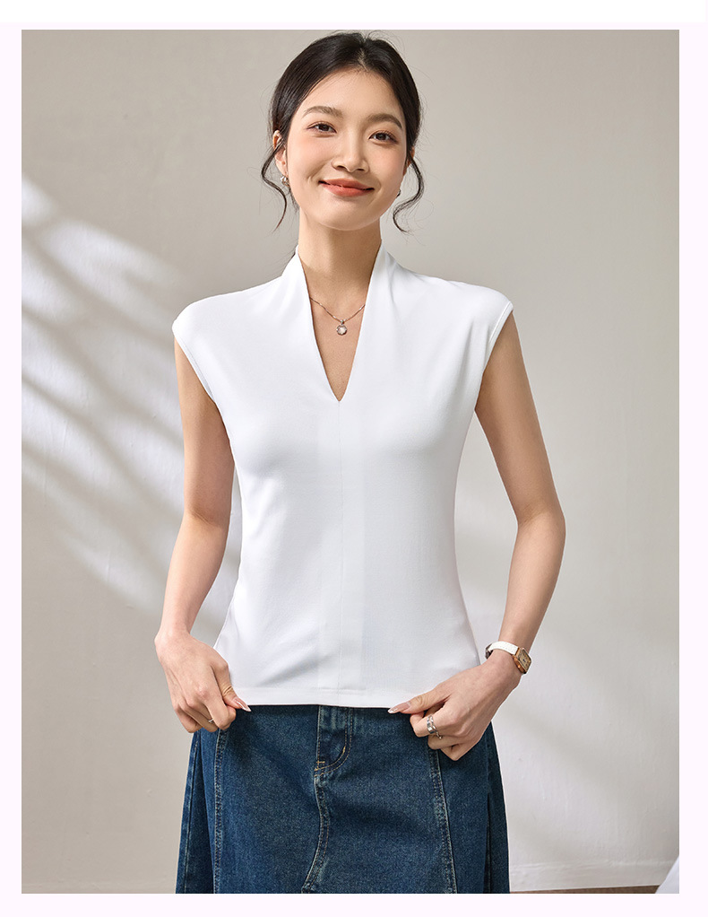 百媚生 棉质气质v领无袖t恤女16851