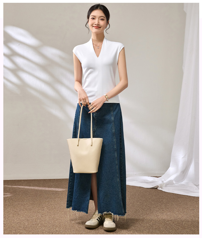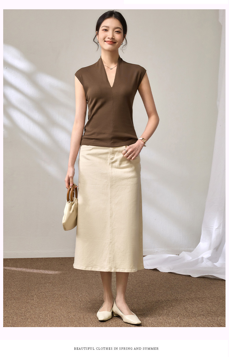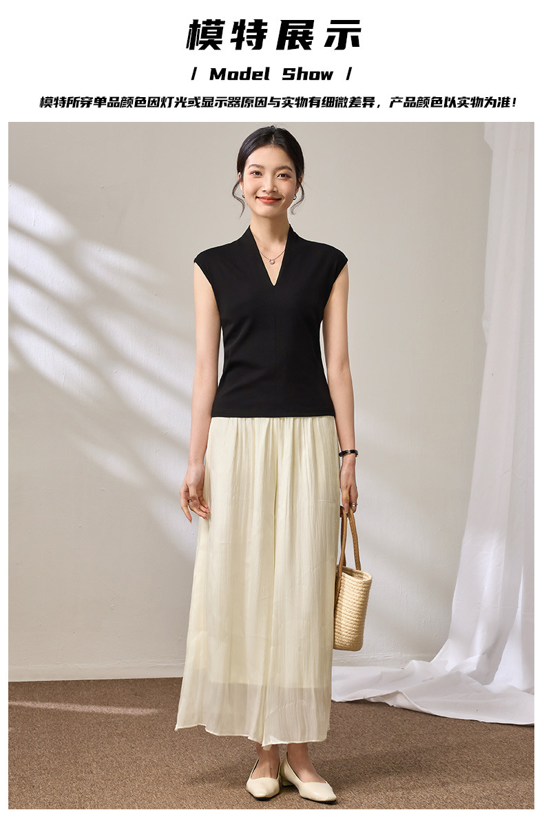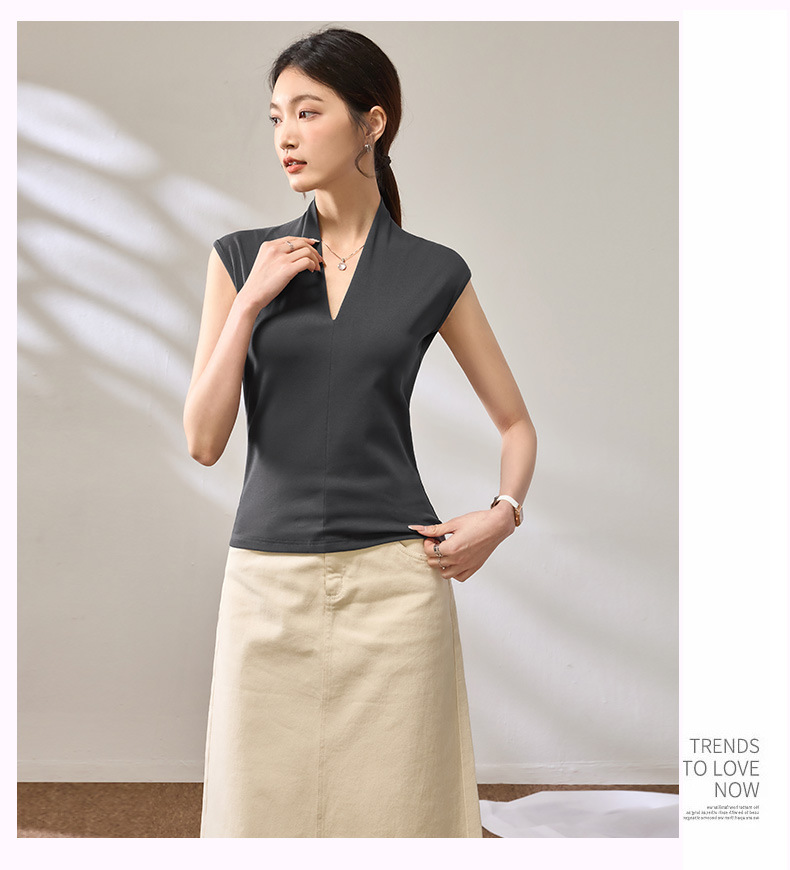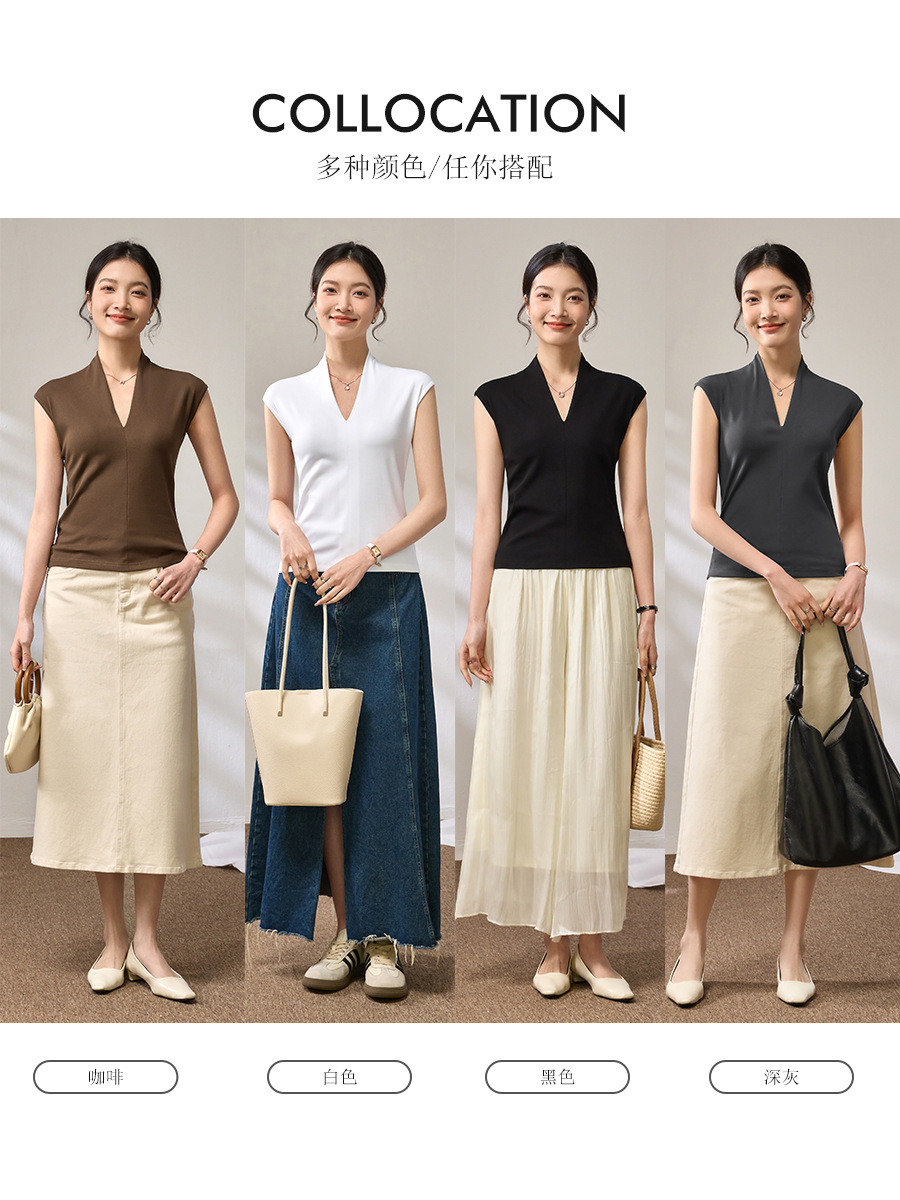百媚生 棉质气质v领无袖t恤女16851