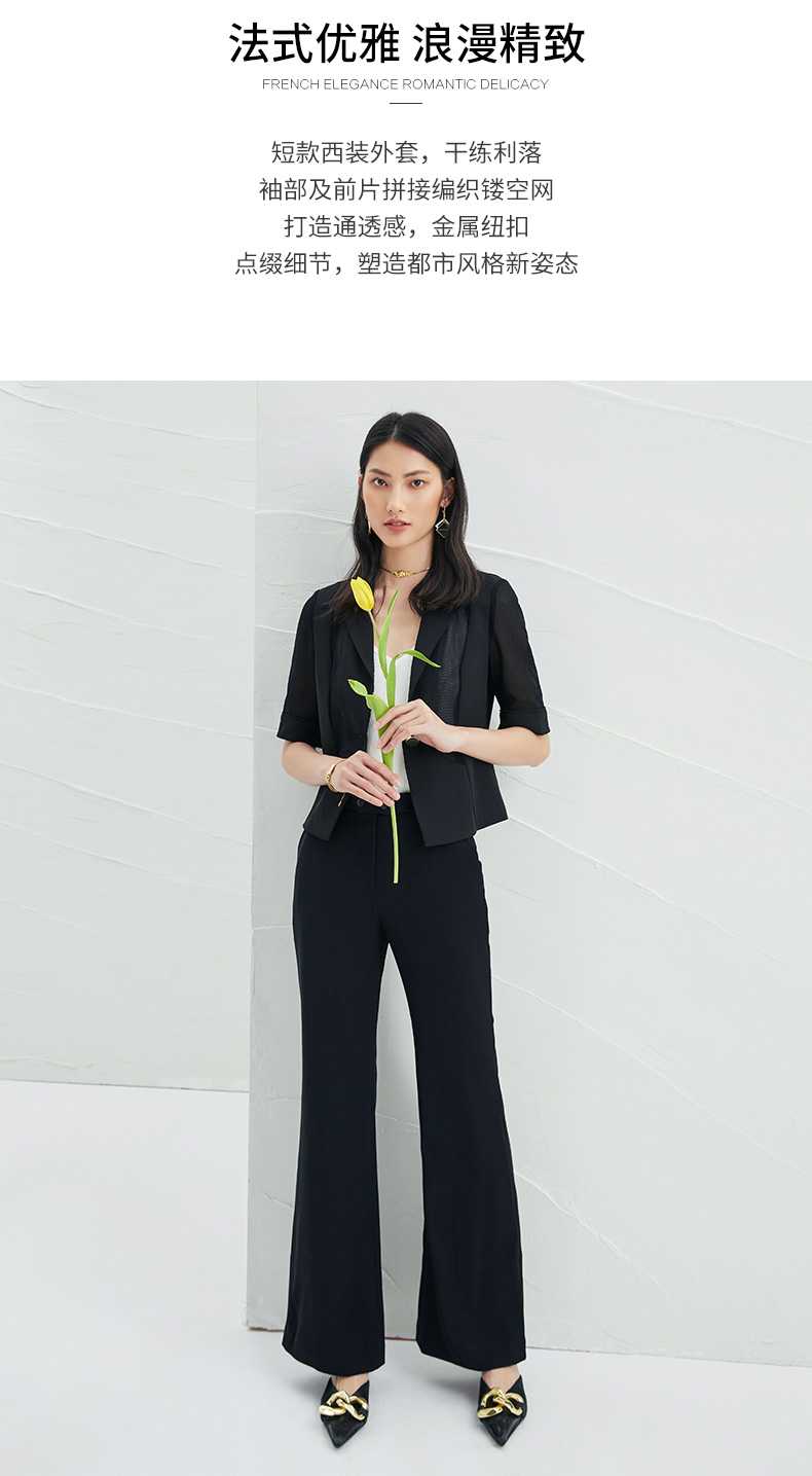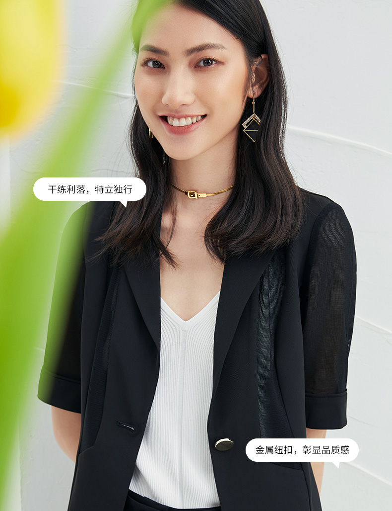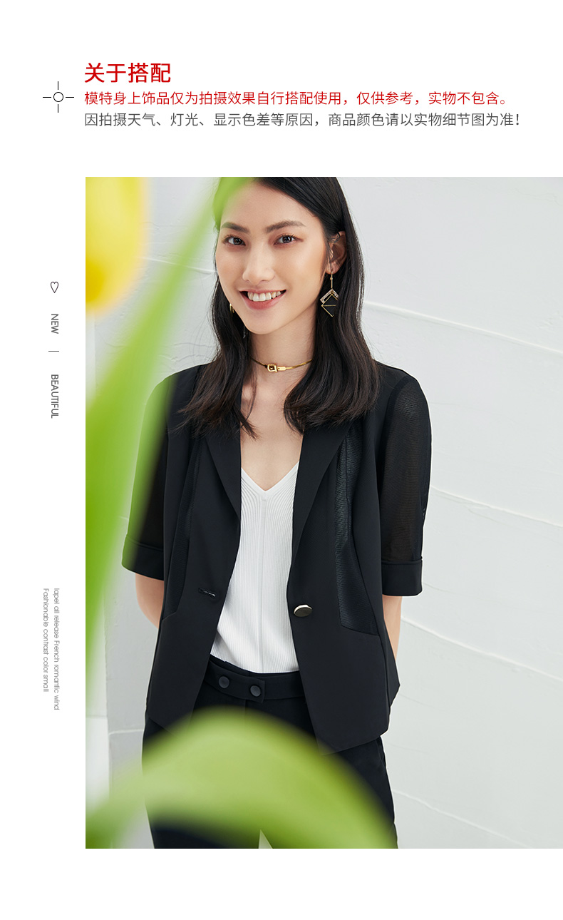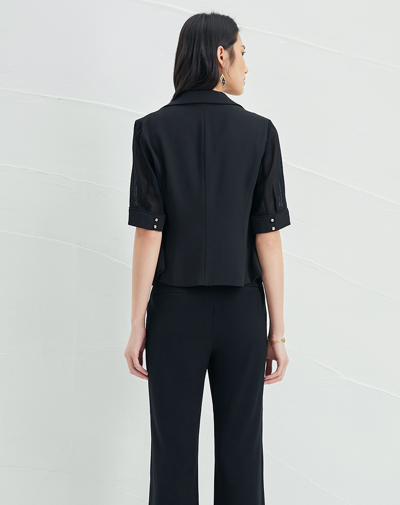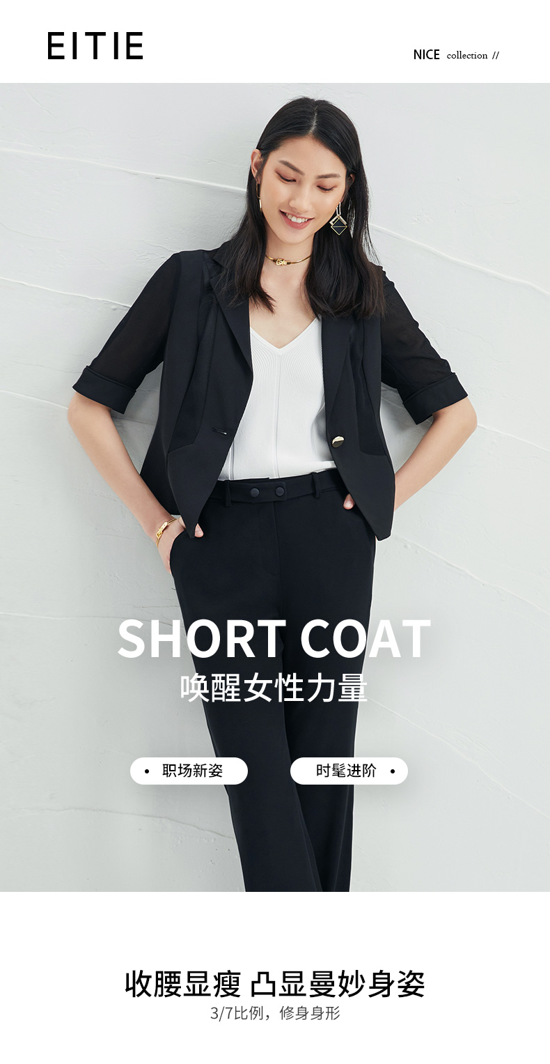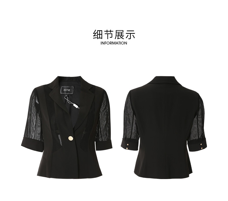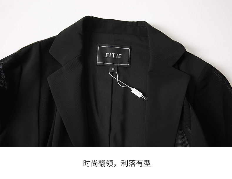 EITIE爱特爱春季新款黑色西装领时尚通勤显瘦网纱拼接短外套6603304