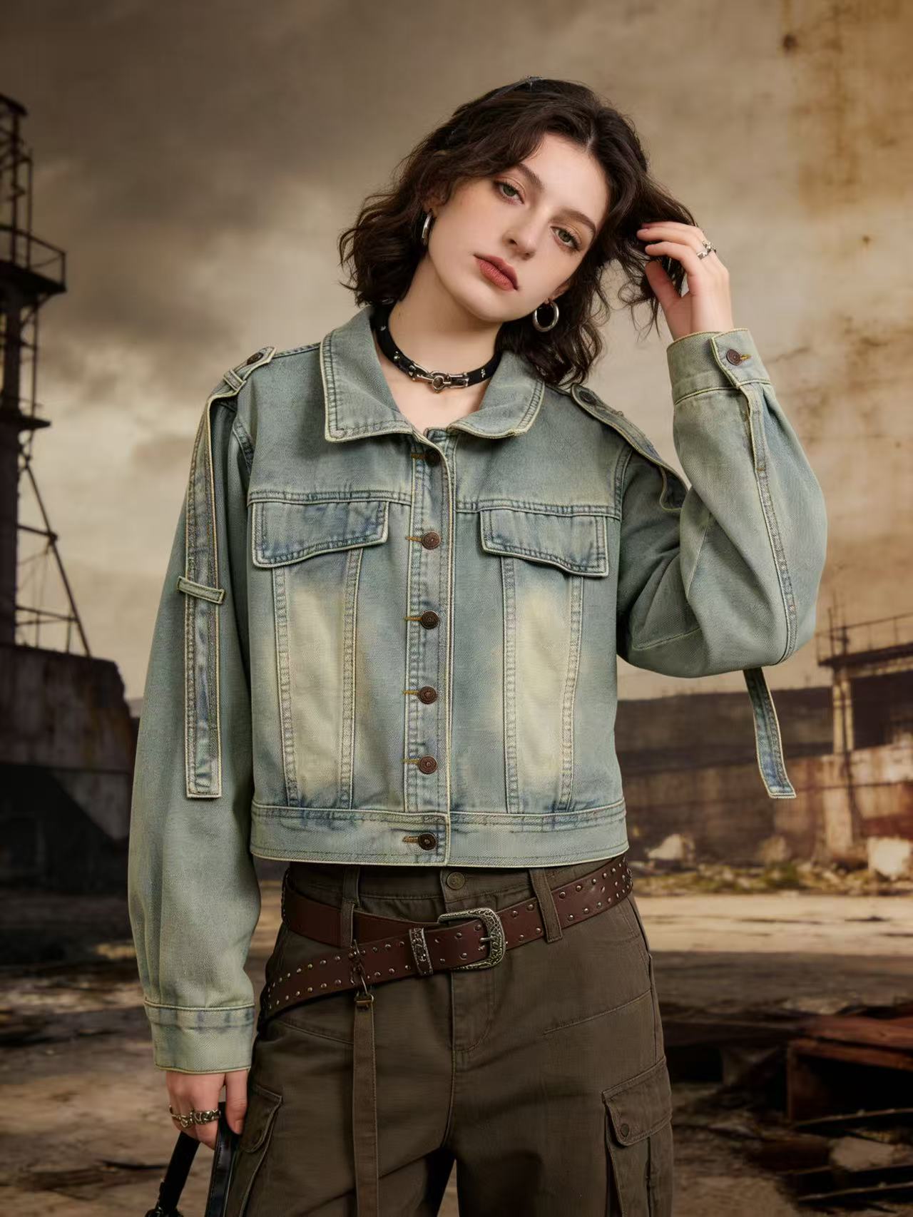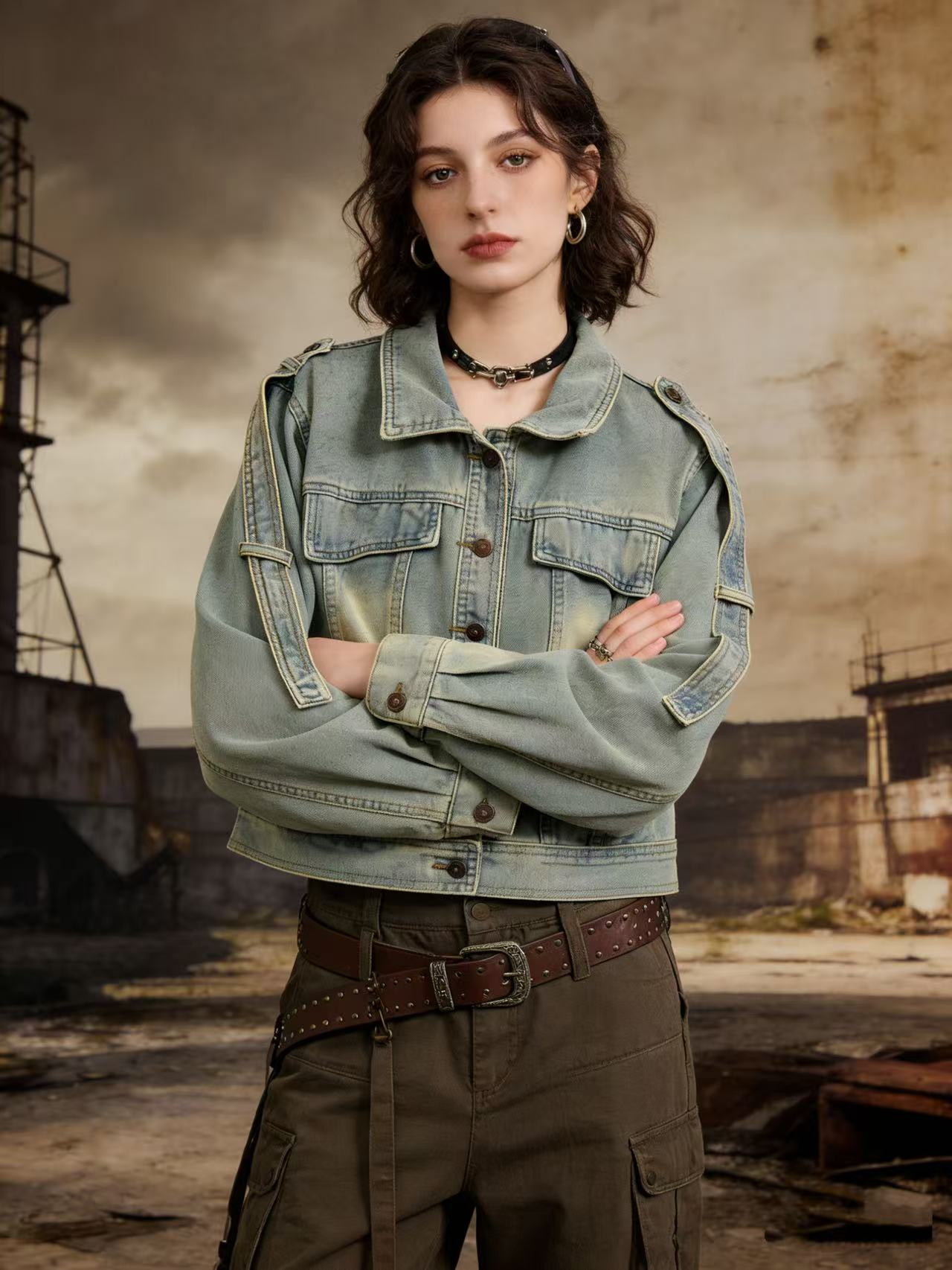 活动爆款【自营】衣周期~226飘带款做旧风复古牛仔外套-喜出