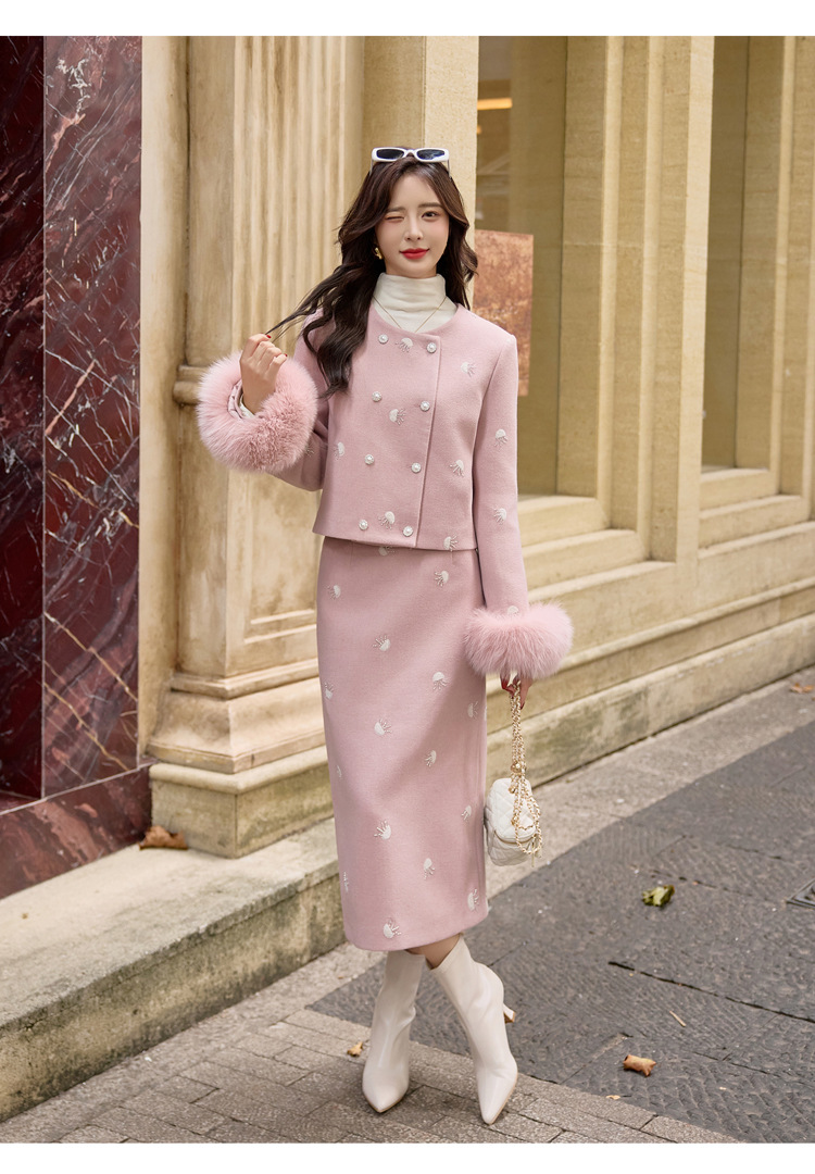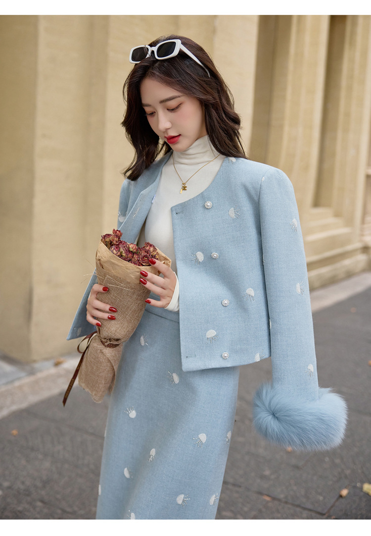 HR YJLY8699小香风套装水母钉珠刺绣90白鸭绒外套长裙两件套狐狸毛 商品图0