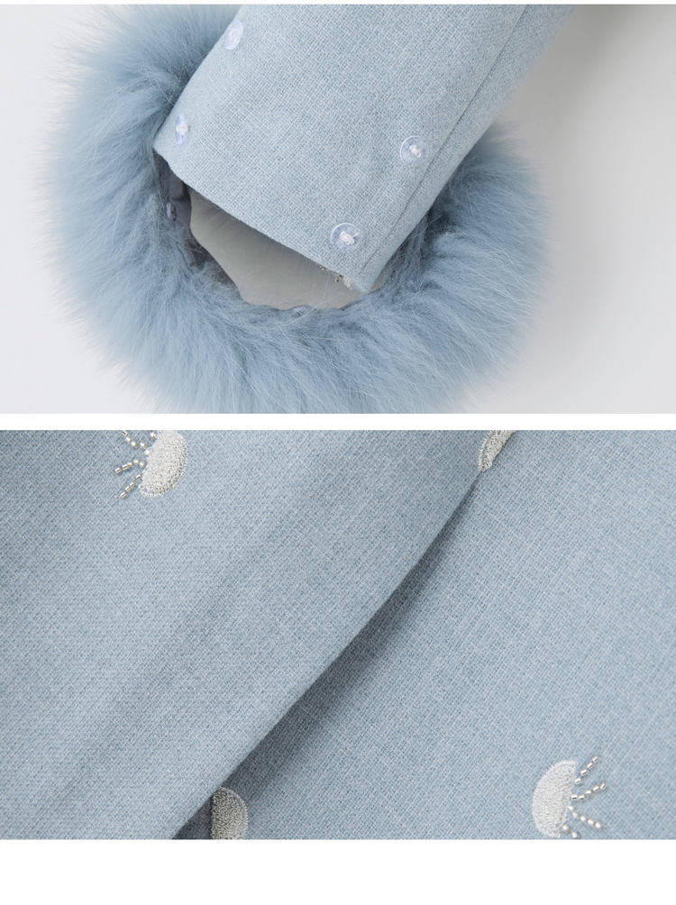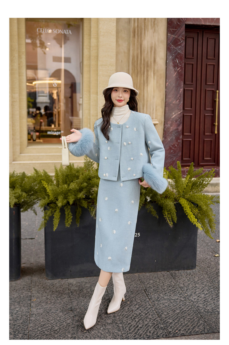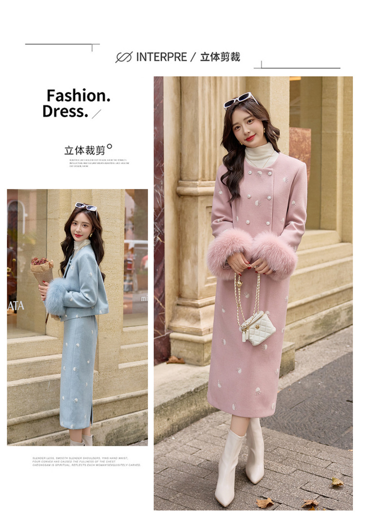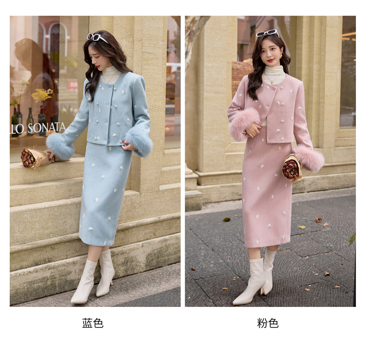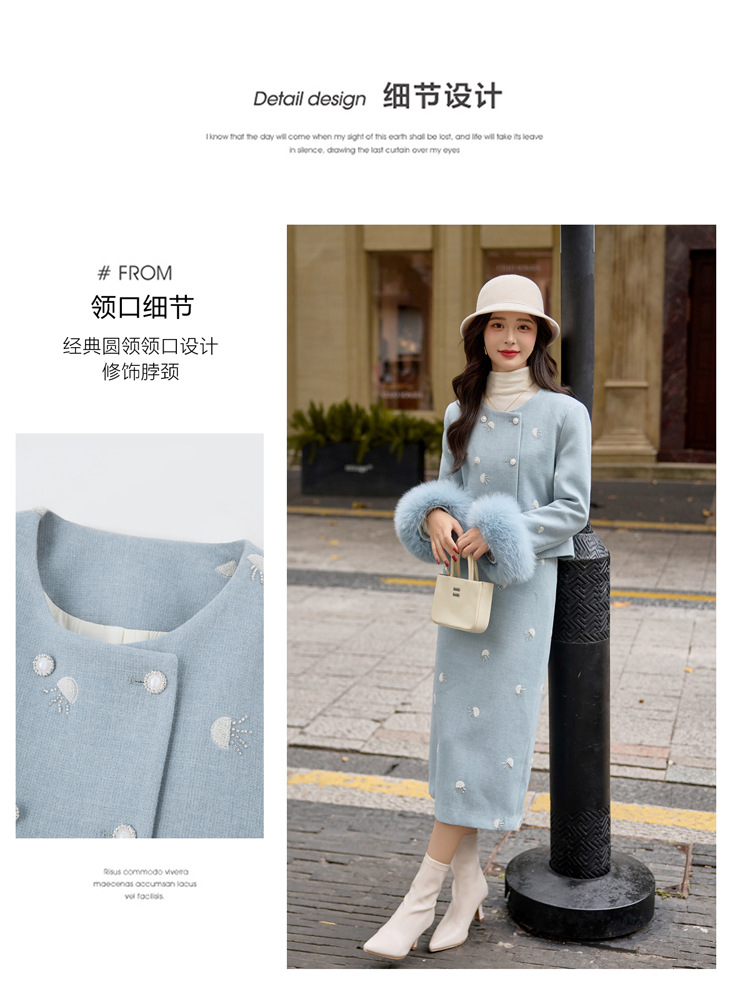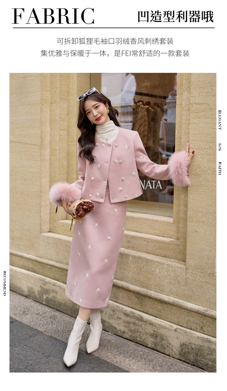 HR YJLY8699小香风套装水母钉珠刺绣90白鸭绒外套长裙两件套狐狸毛 商品图4