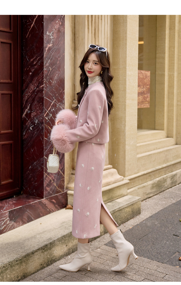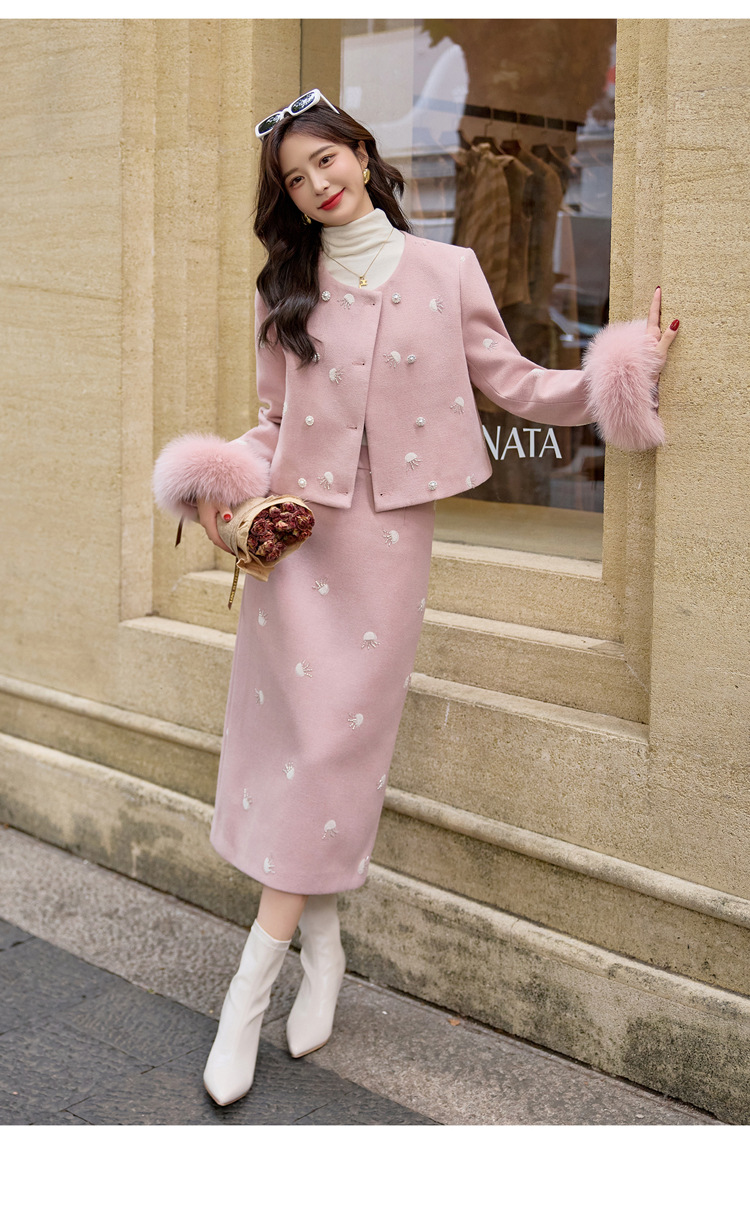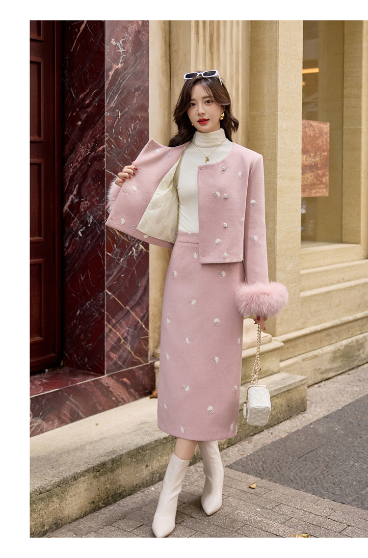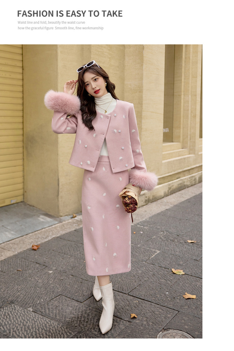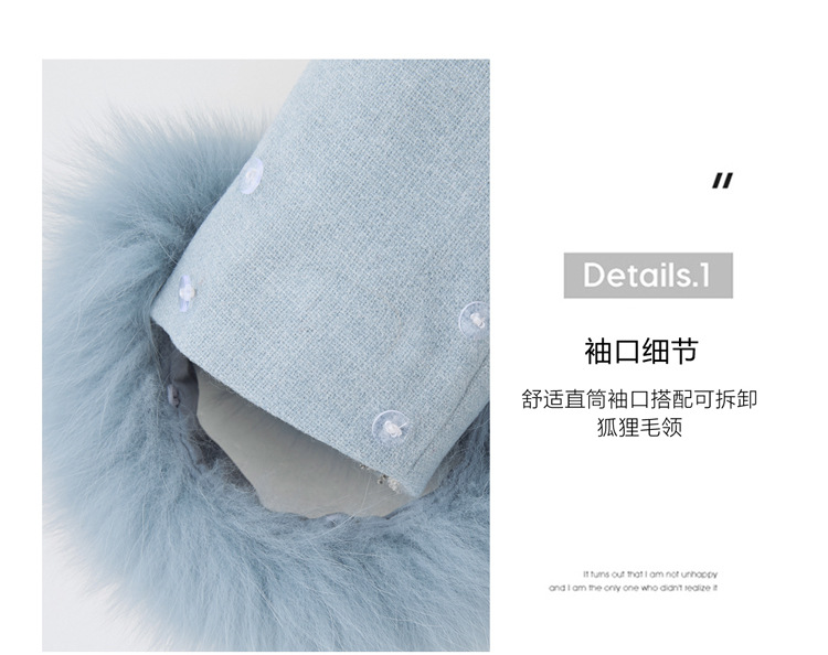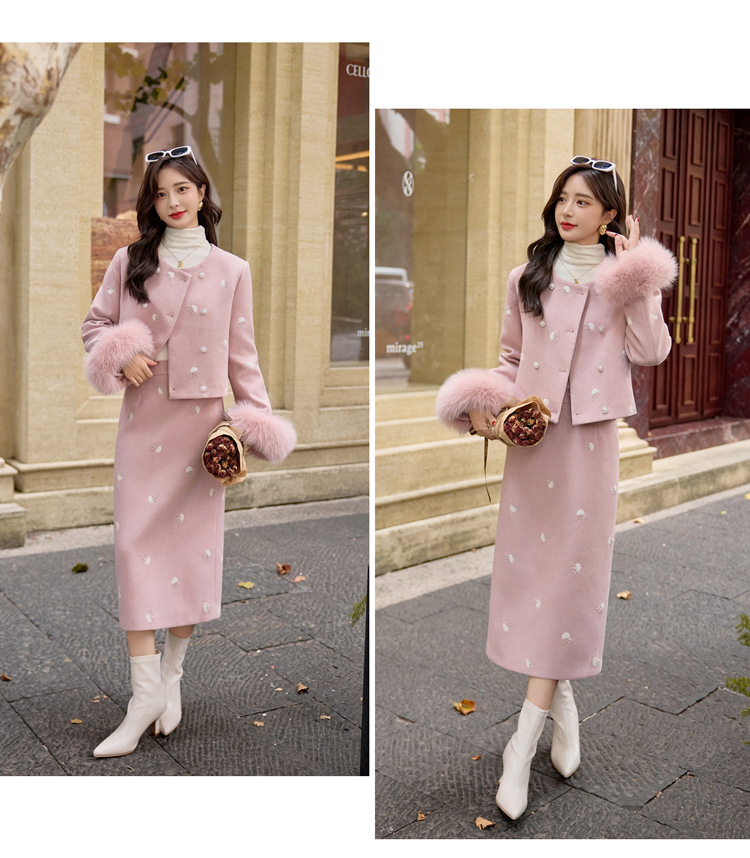 HR YJLY8699小香风套装水母钉珠刺绣90白鸭绒外套长裙两件套狐狸毛 商品图4