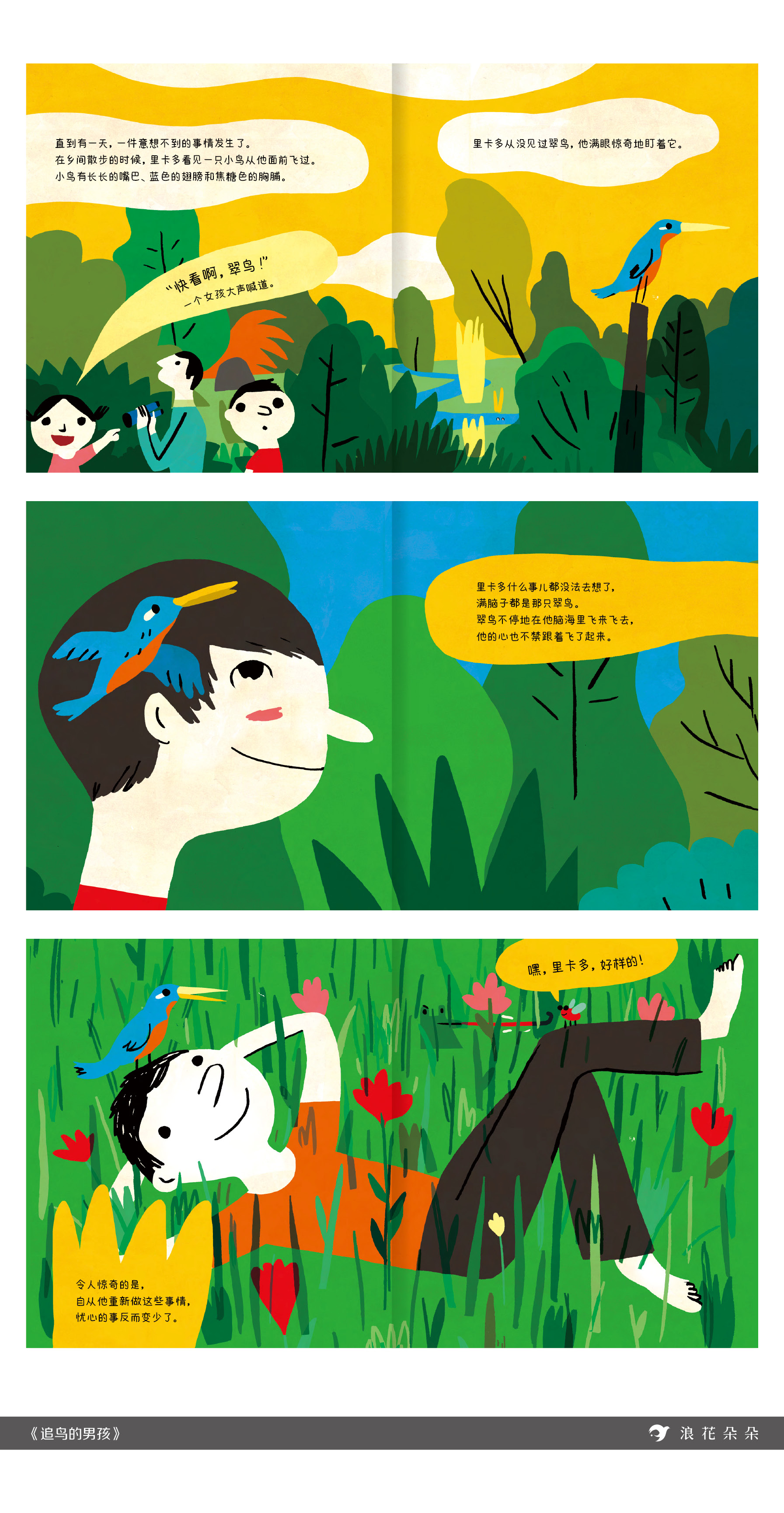 小男孩对美丽的翠鸟产生了浓厚的兴趣,他一路追踪,对它有了更深入的了解。他了解到翠鸟多达90种,生活在不同的地方,它们有的吃鱼、吃昆虫,甚至老鼠,它们在地上和树上筑巢……他逐渐意识到人类、鸟、河流、森林等所有存在于地球上的事物都是紧密相连的,形成了一个完美的生态链。只有了解了自然,才能真正懂得保护它。