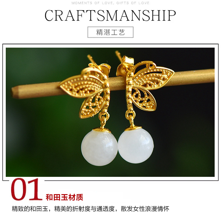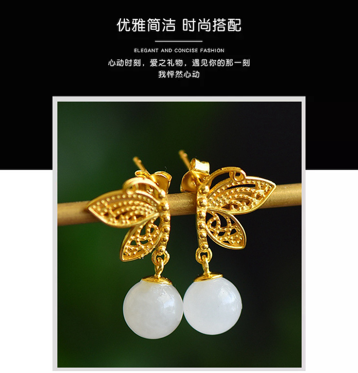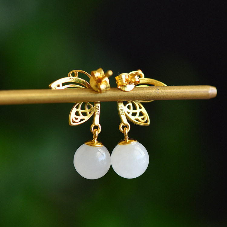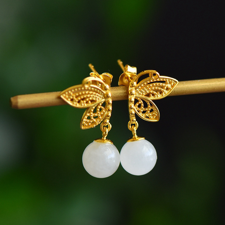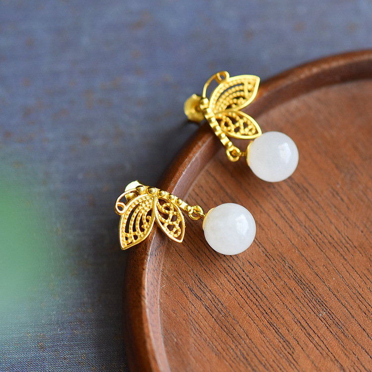 925银镀金蝴蝶镶嵌和田玉耳环古风8mm圆珠玉石耳坠 JX2571-2