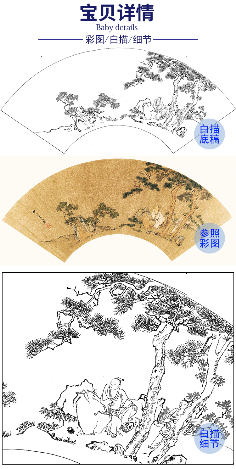 工笔画白描底稿 山水人物扇面小品 明 仇英-《携琴听松图》-多种白描尺寸可选-SR07