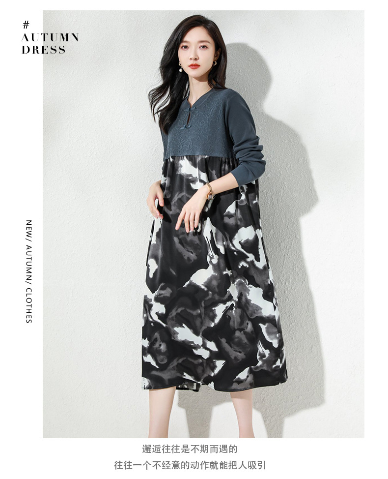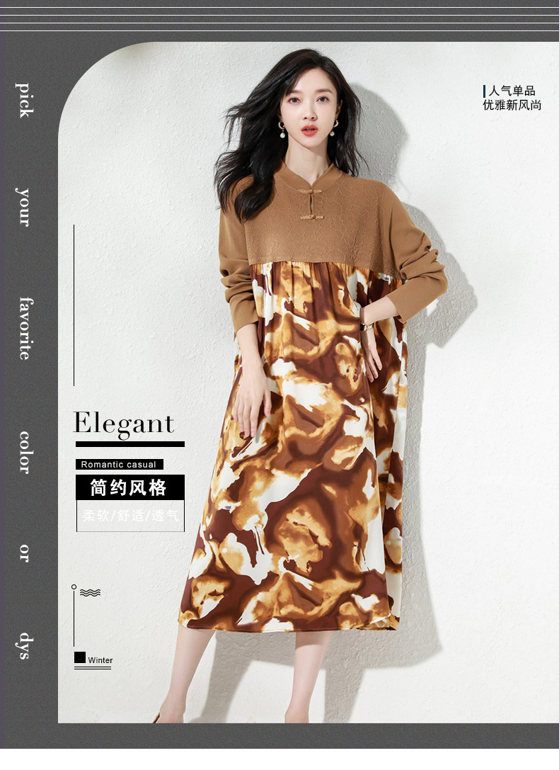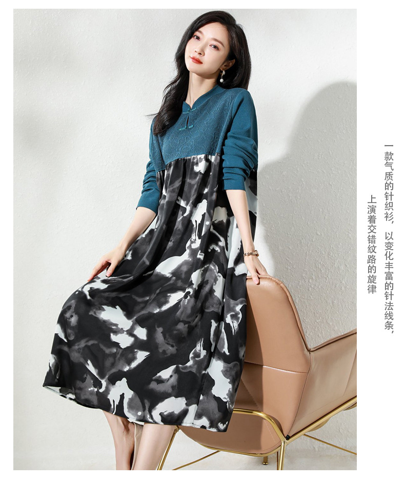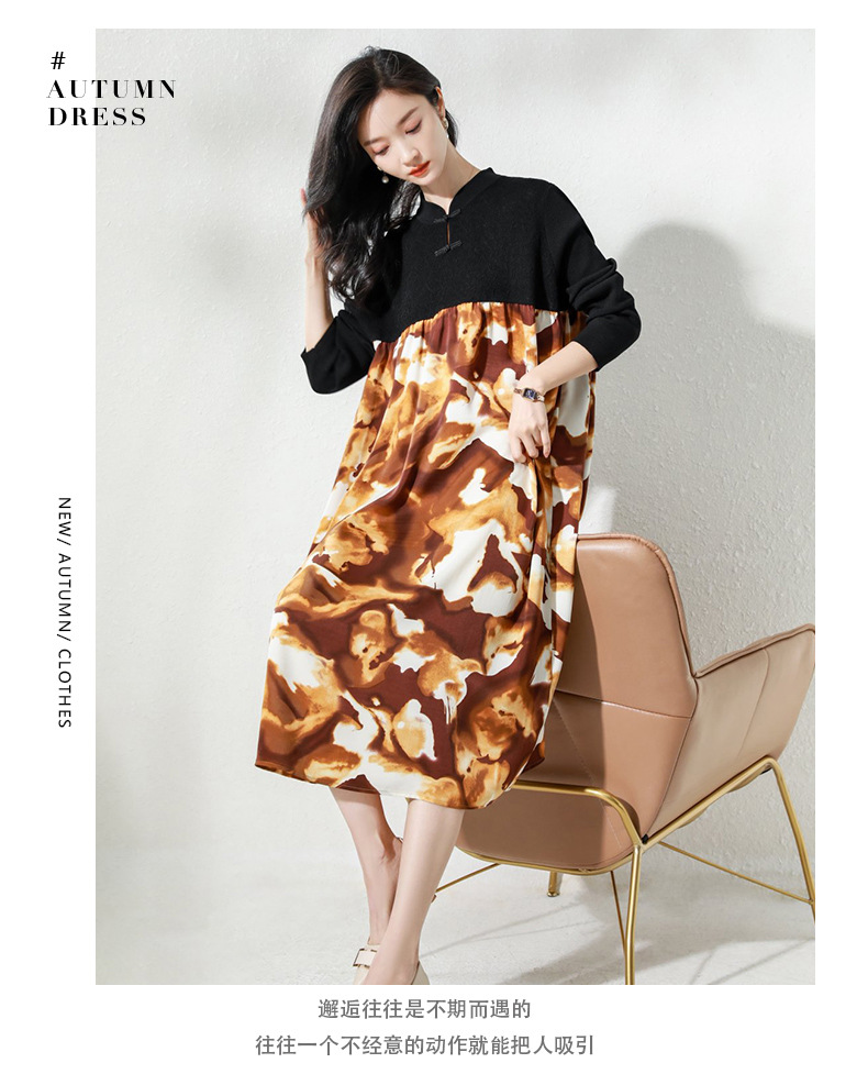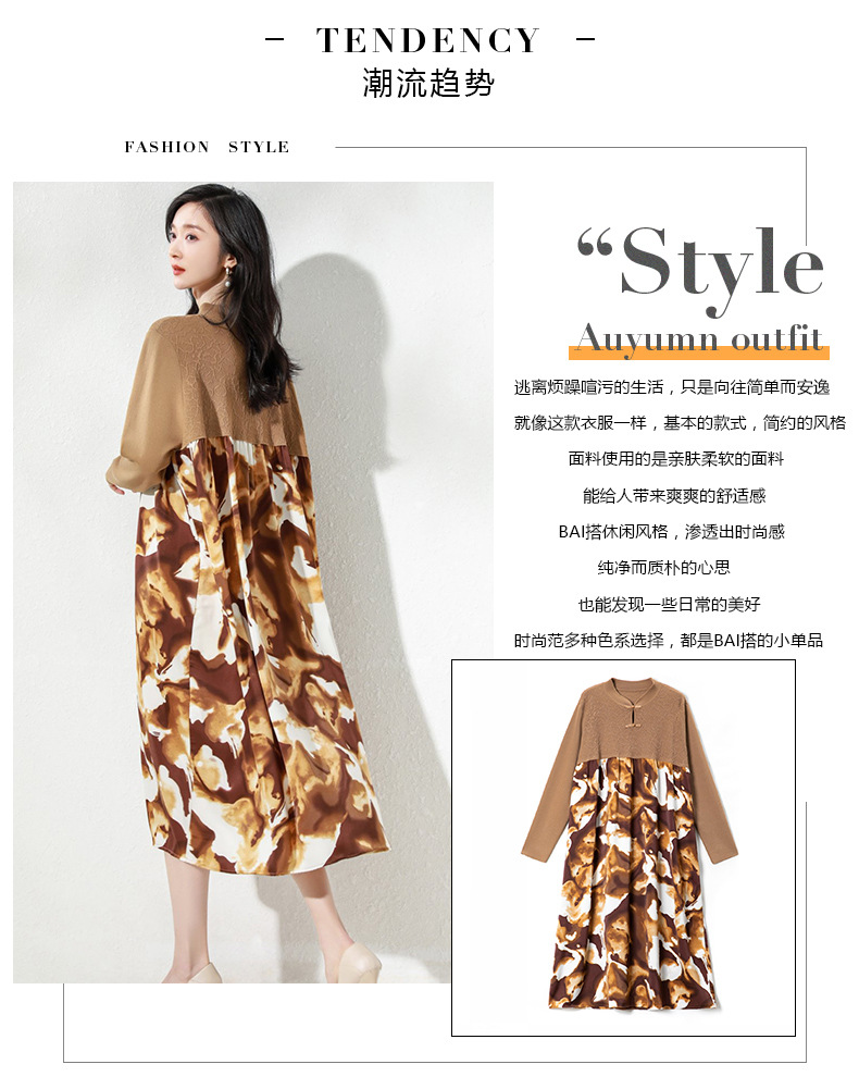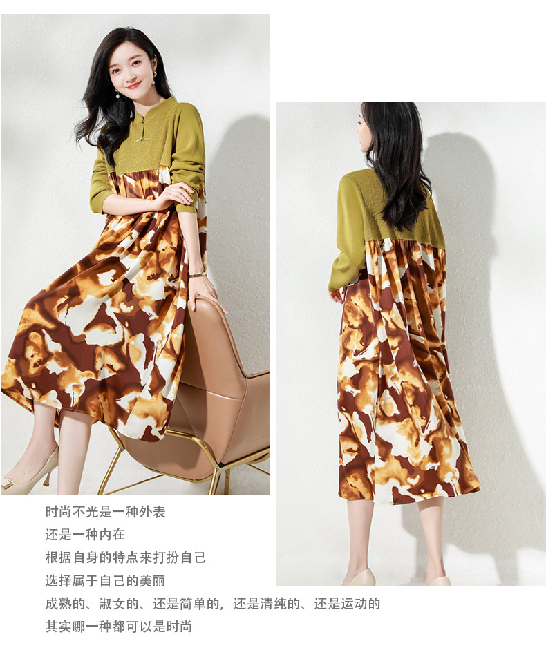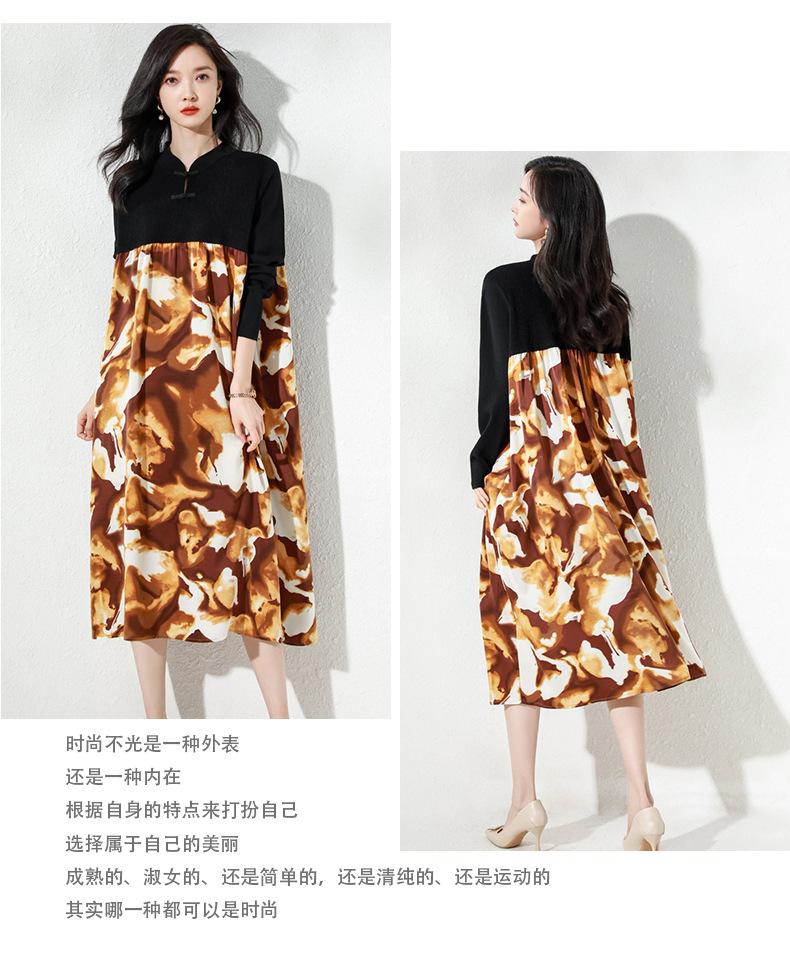 QYZLM58617 长裙子显瘦遮肉微胖针织连衣裙 超长款印花拼接修身显瘦裙子