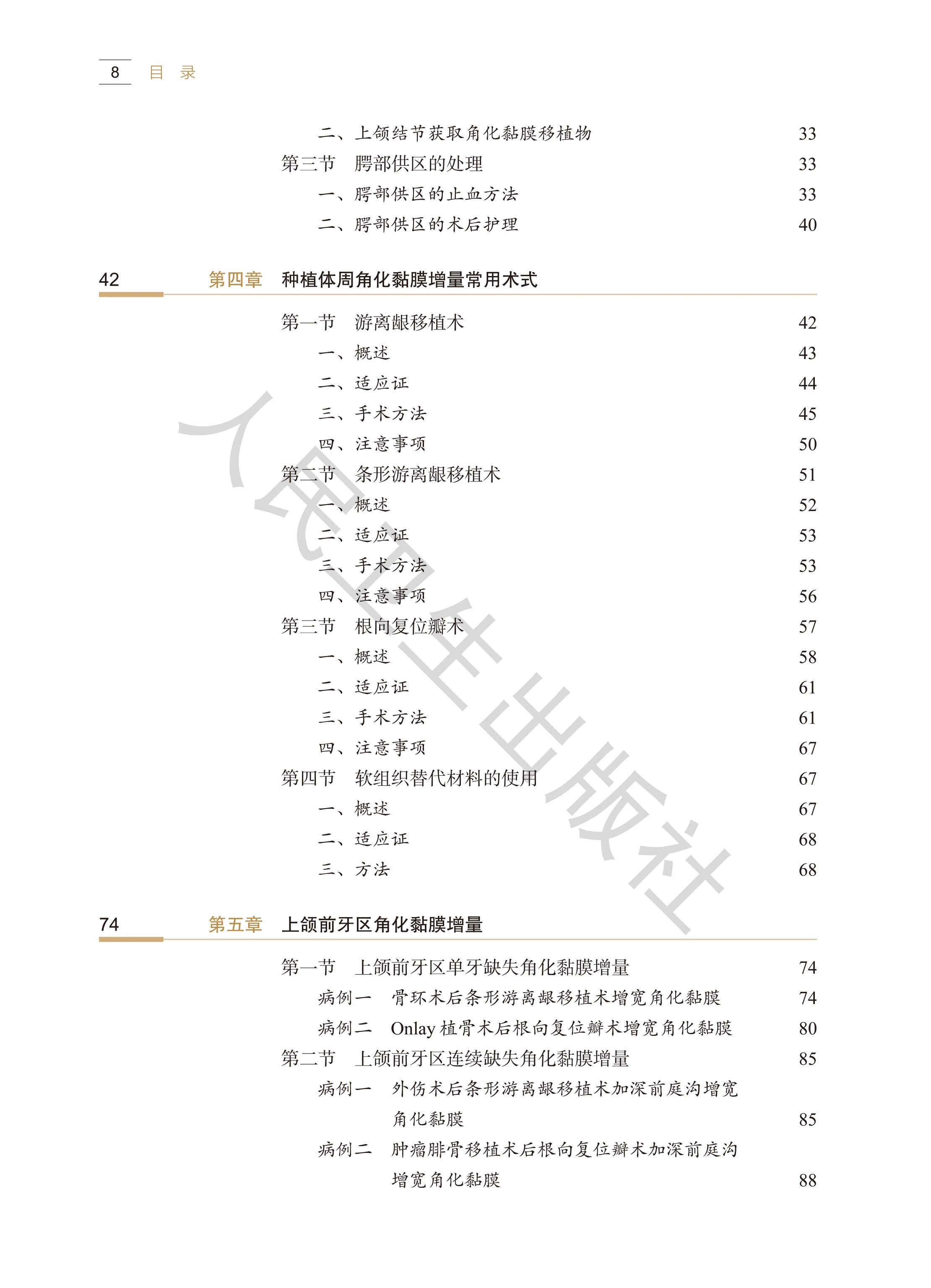 通过系统讲解以及病例展示和解读,关于口腔种植体周角化黏膜增量,让读者直观了解怎么做,也明白为什么要这样做。主要内容包括:概论、手术前的准备、角化黏膜移植物的获取、种植体周角化黏膜增量常用术式、上颌前牙区角化黏膜增量、上颌后牙区角化黏膜增量、下颌角化黏膜增量等。