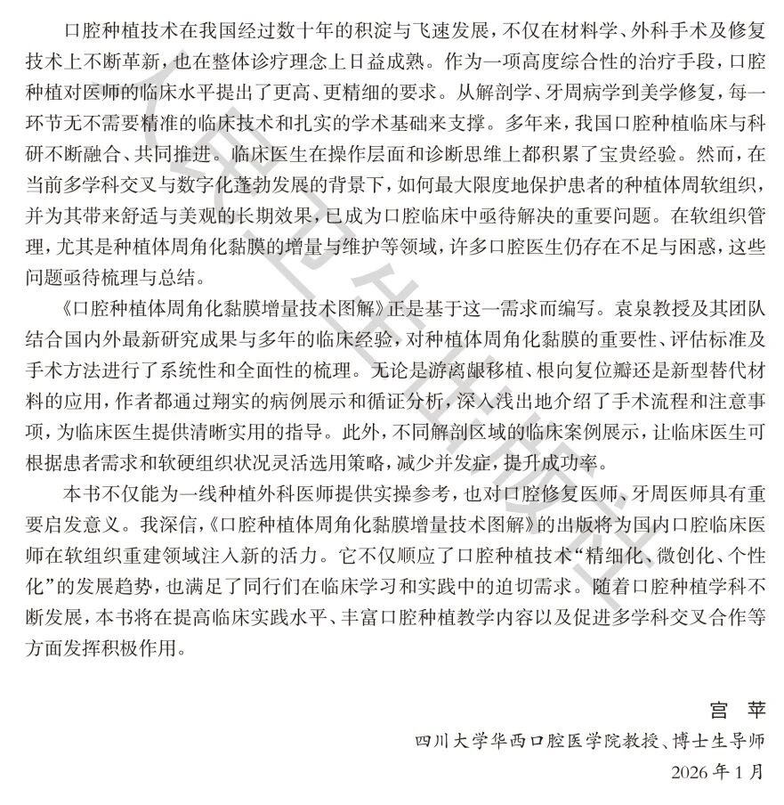 主编袁泉教授,不仅是本科规划教材《口腔种植学》主编,还主编过多本临床专著,保证了本书的科学、严谨及可读性。团队成员除了来自四川大学华西口腔种植科,还有复旦大学附属口腔医学院、安徽医科大学附属口腔医学院等多所国内知名院校。