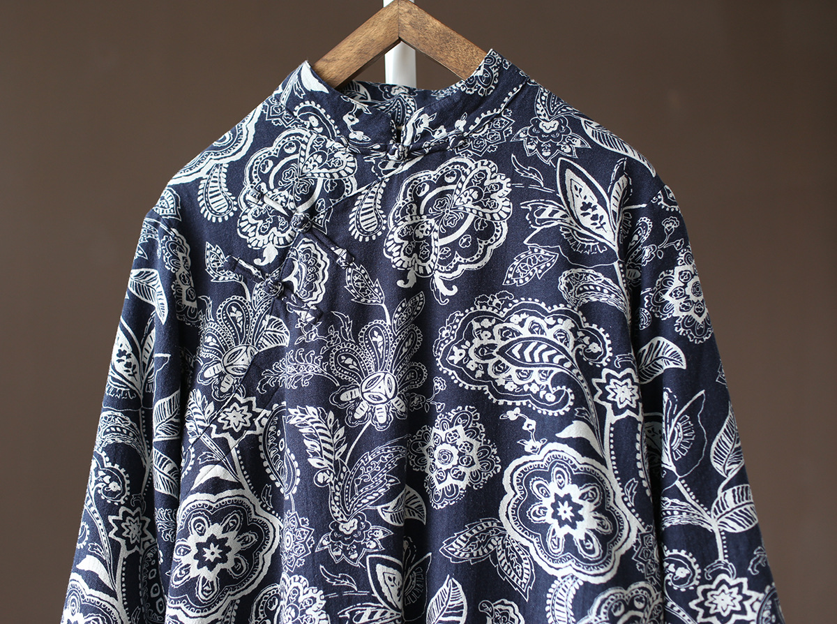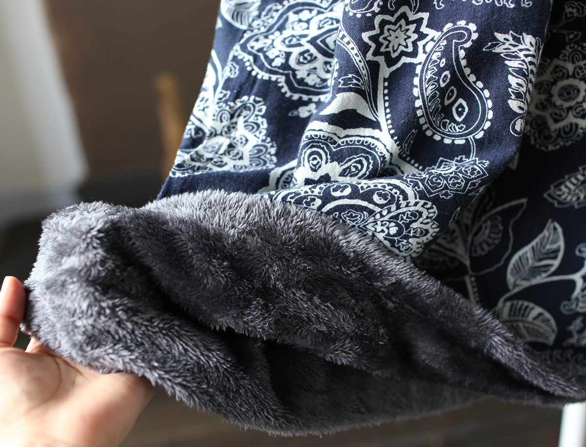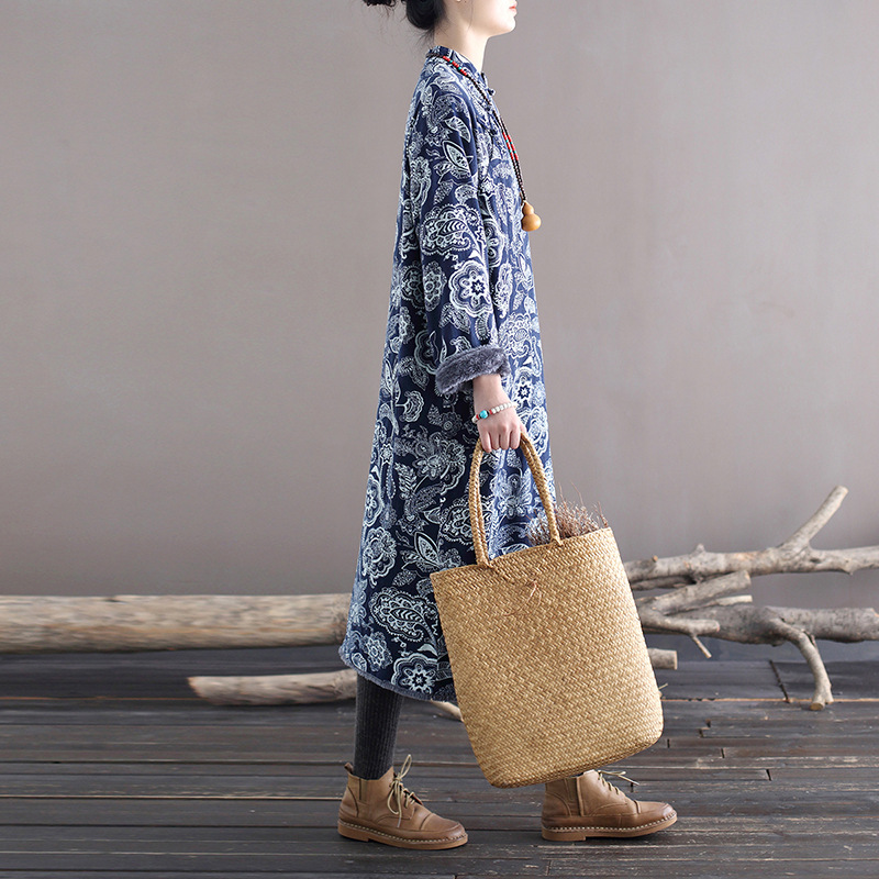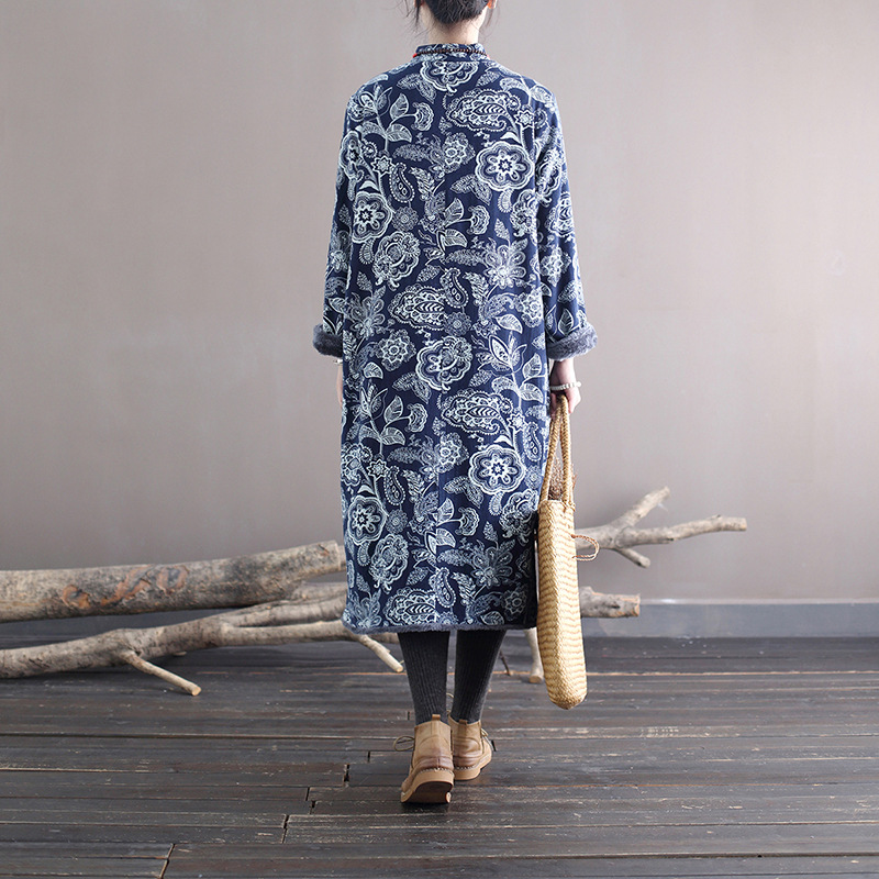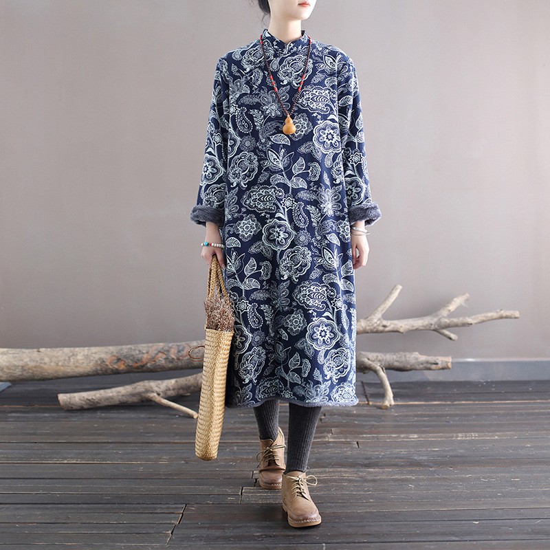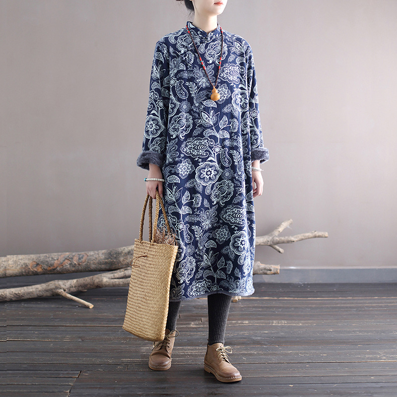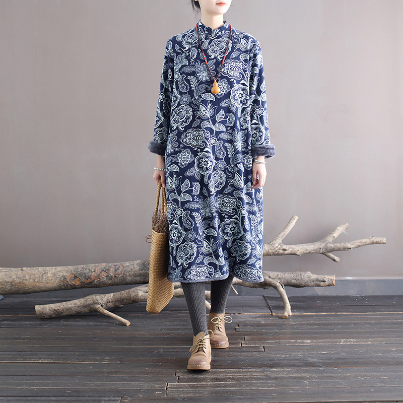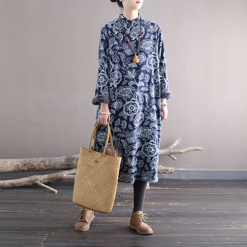 XM-连衣裙青花瓷国风复古秋冬连衣裙加绒加厚印花女装宽松长裙