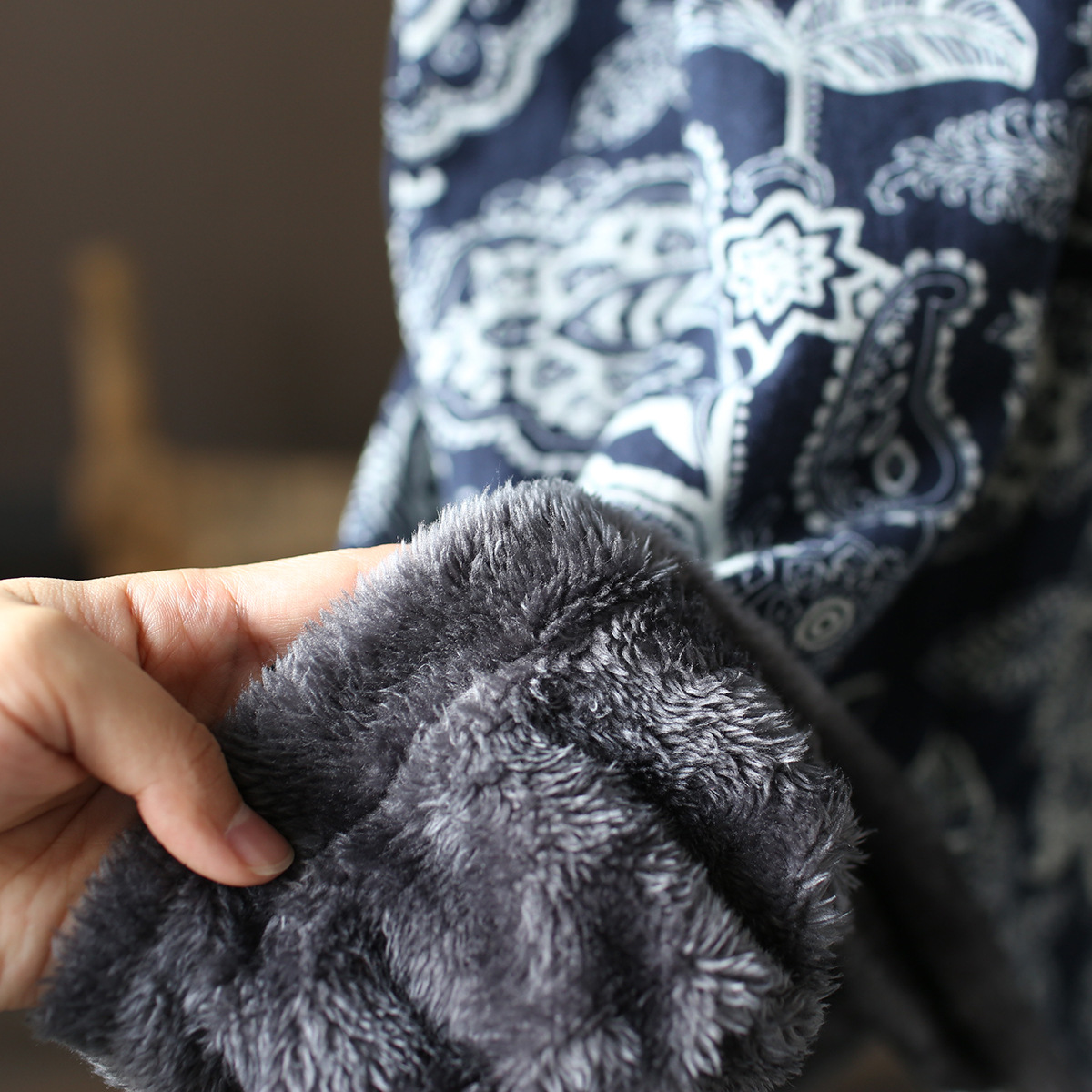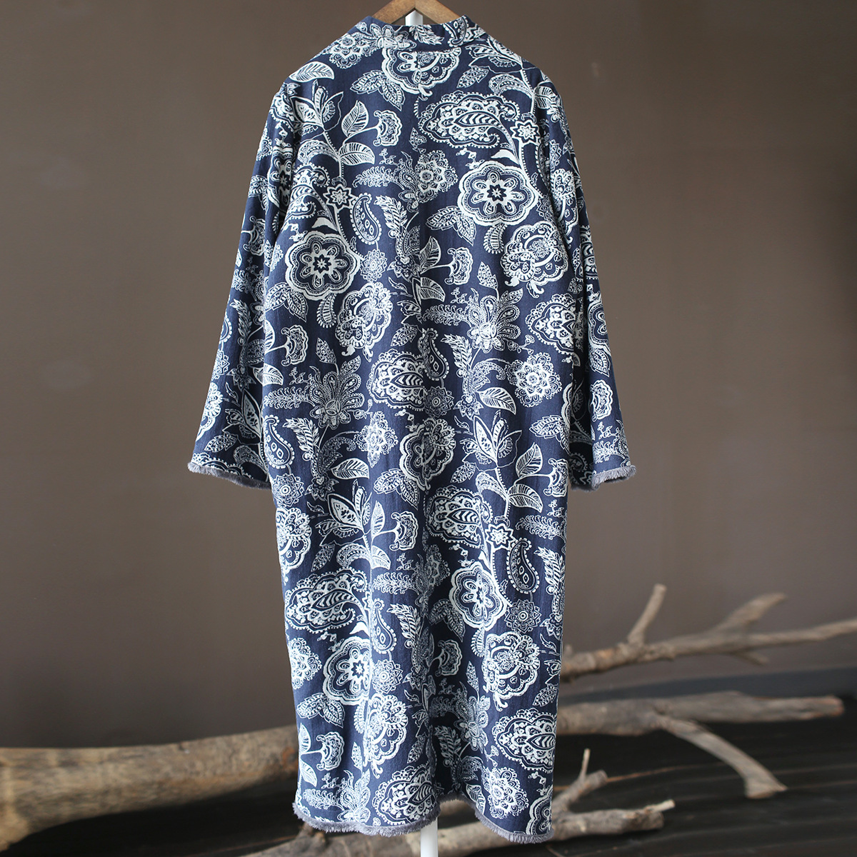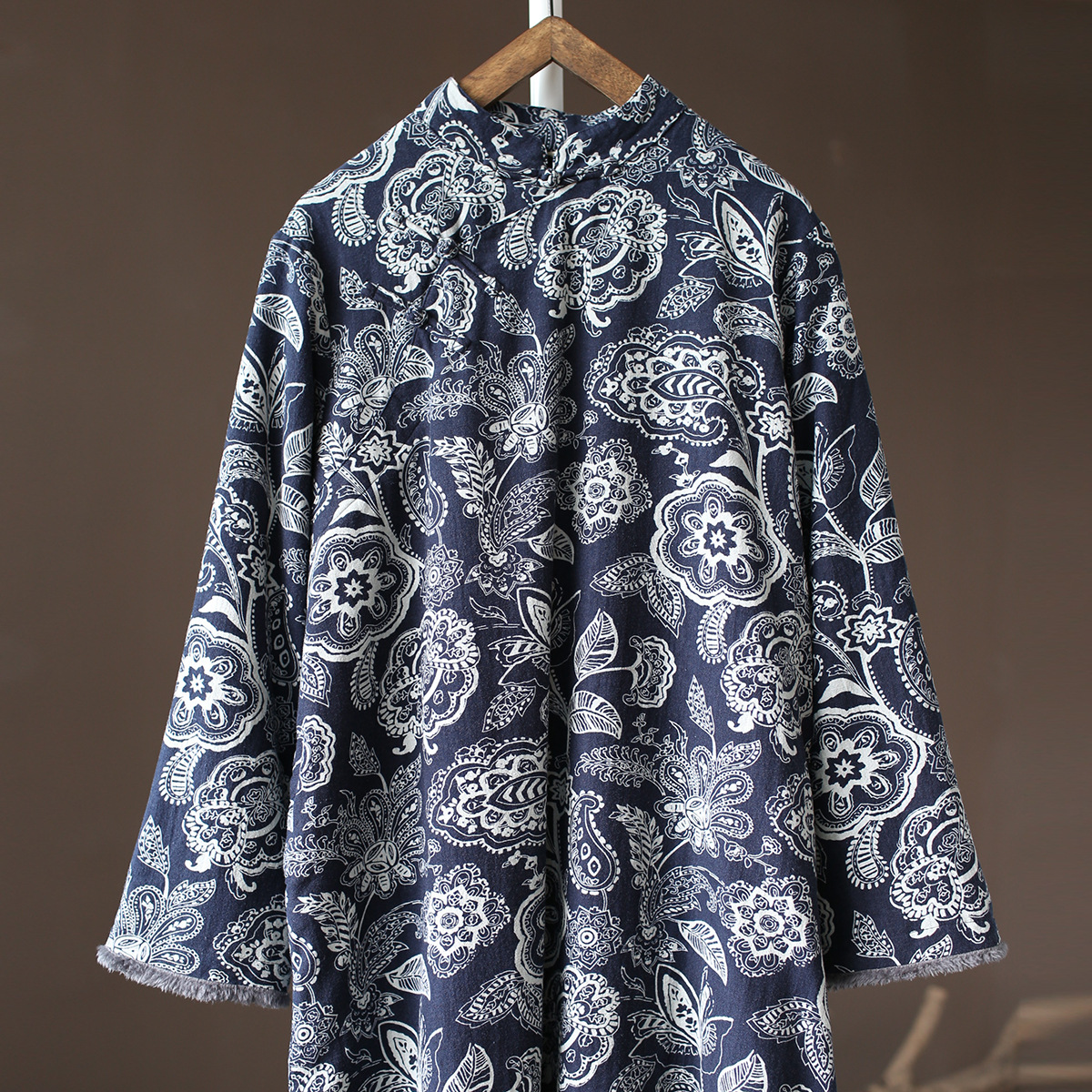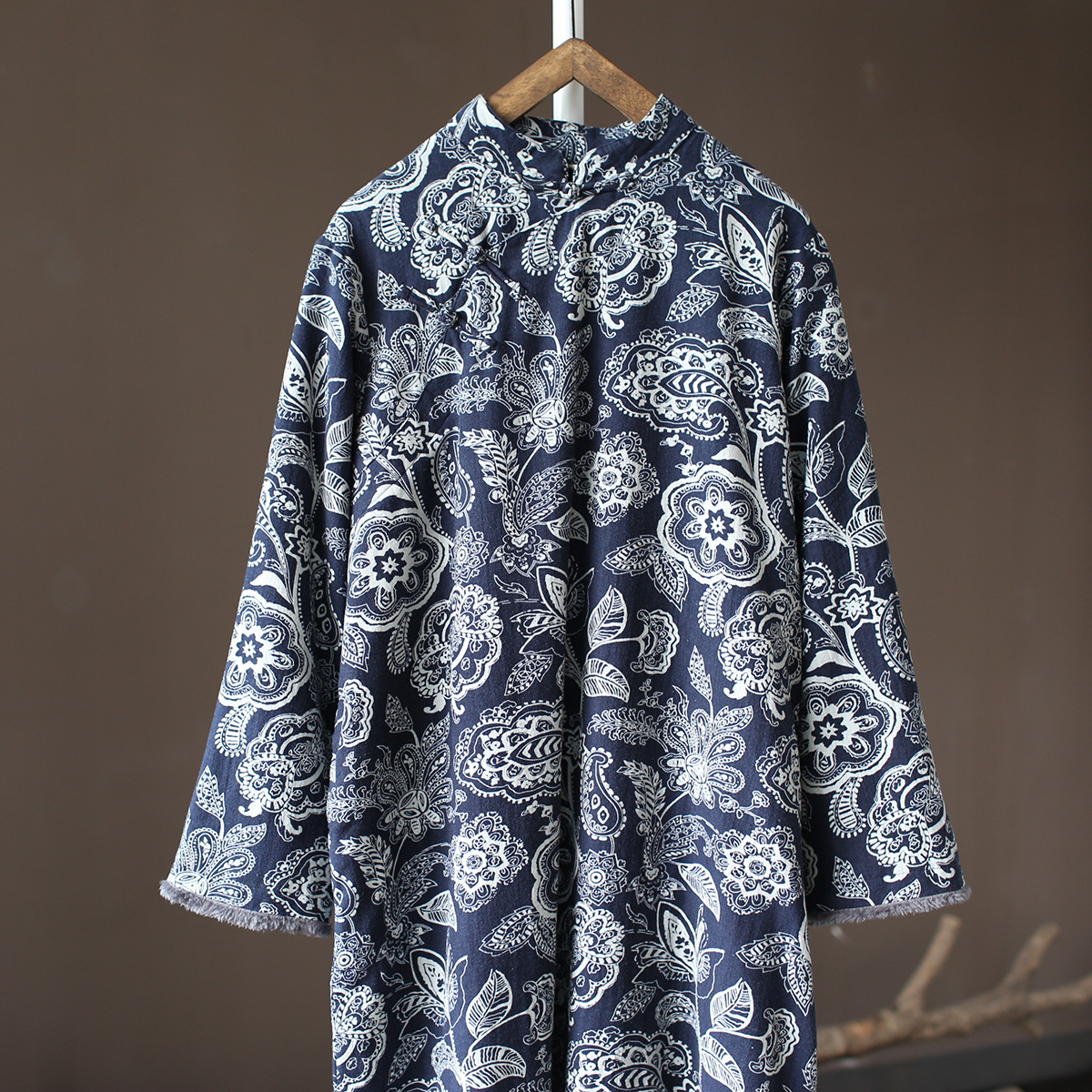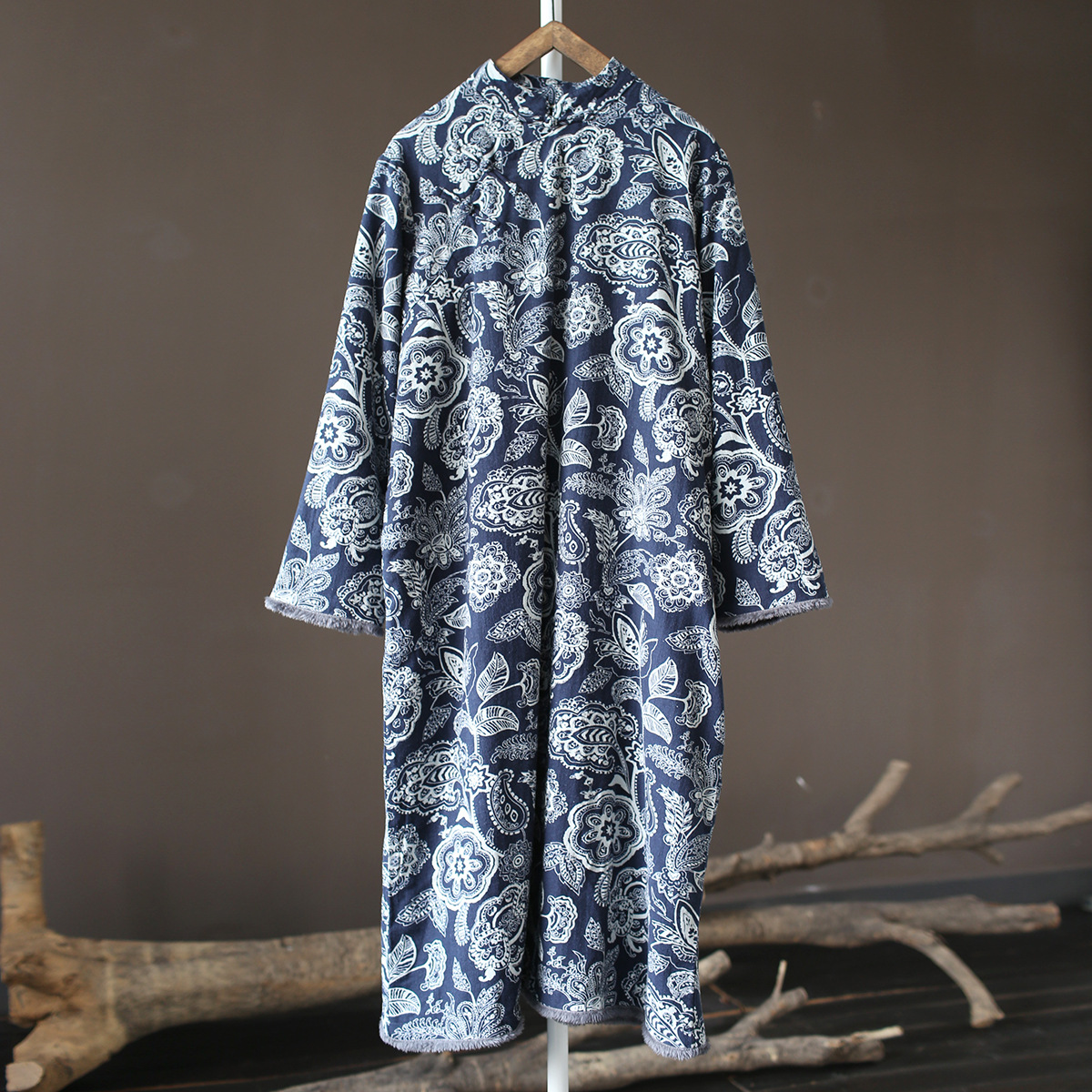 XM-连衣裙青花瓷国风复古秋冬连衣裙加绒加厚印花女装宽松长裙
