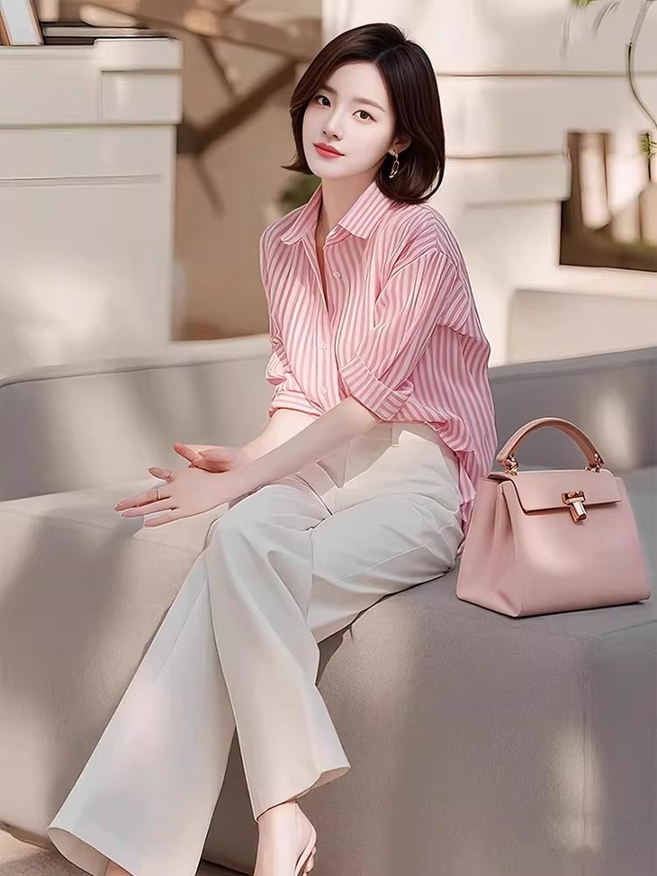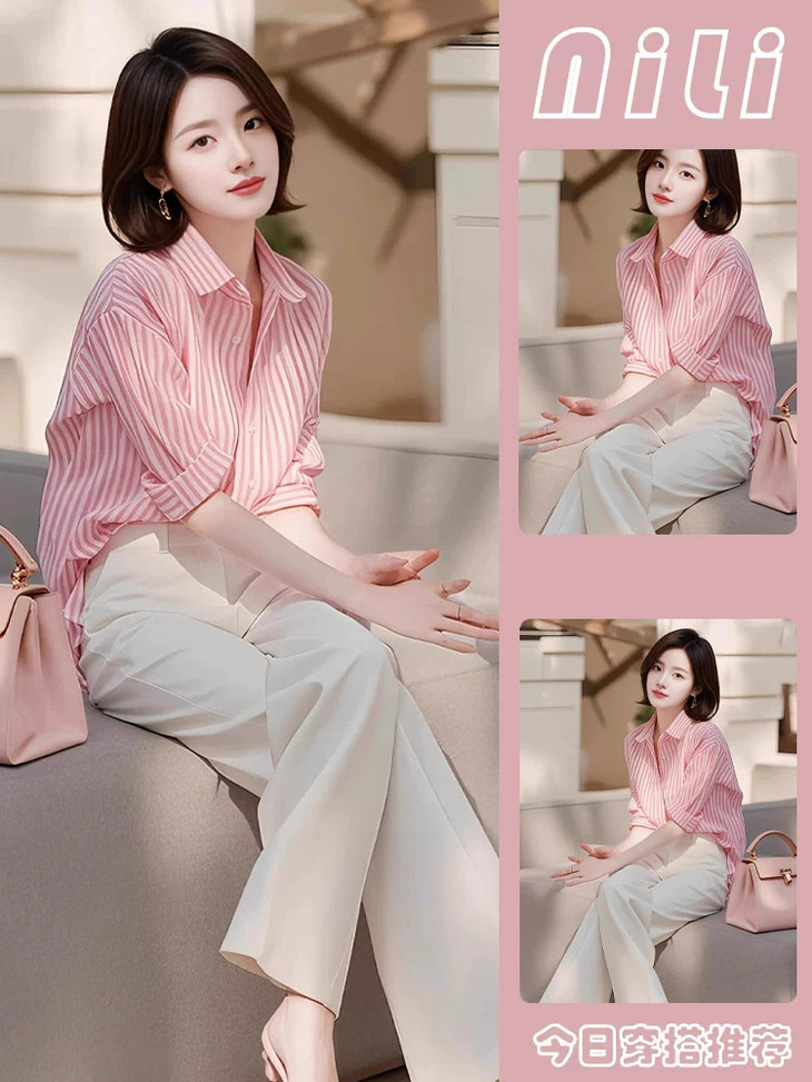 小众设计感气质御姐两件套,时髦减龄条纹衬衫长裤套装 商品图1