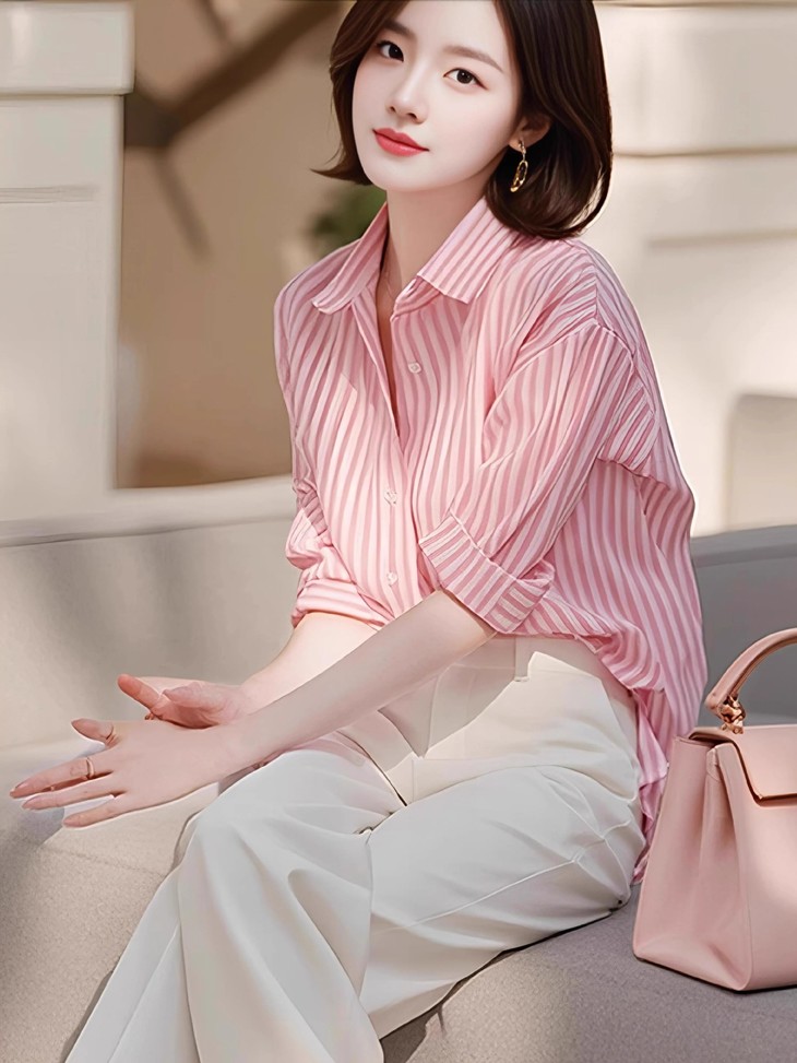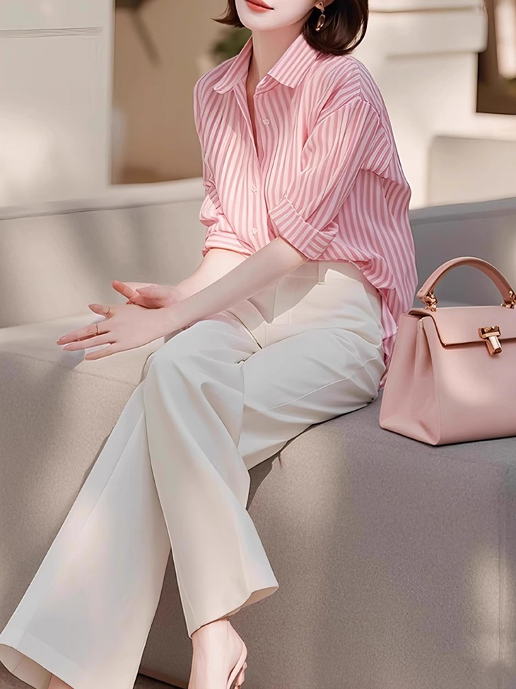小众设计感气质御姐两件套,时髦减龄条纹衬衫长裤套装
