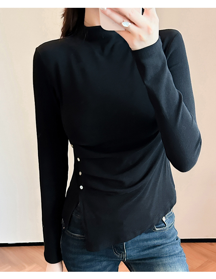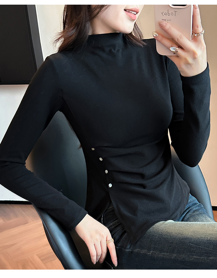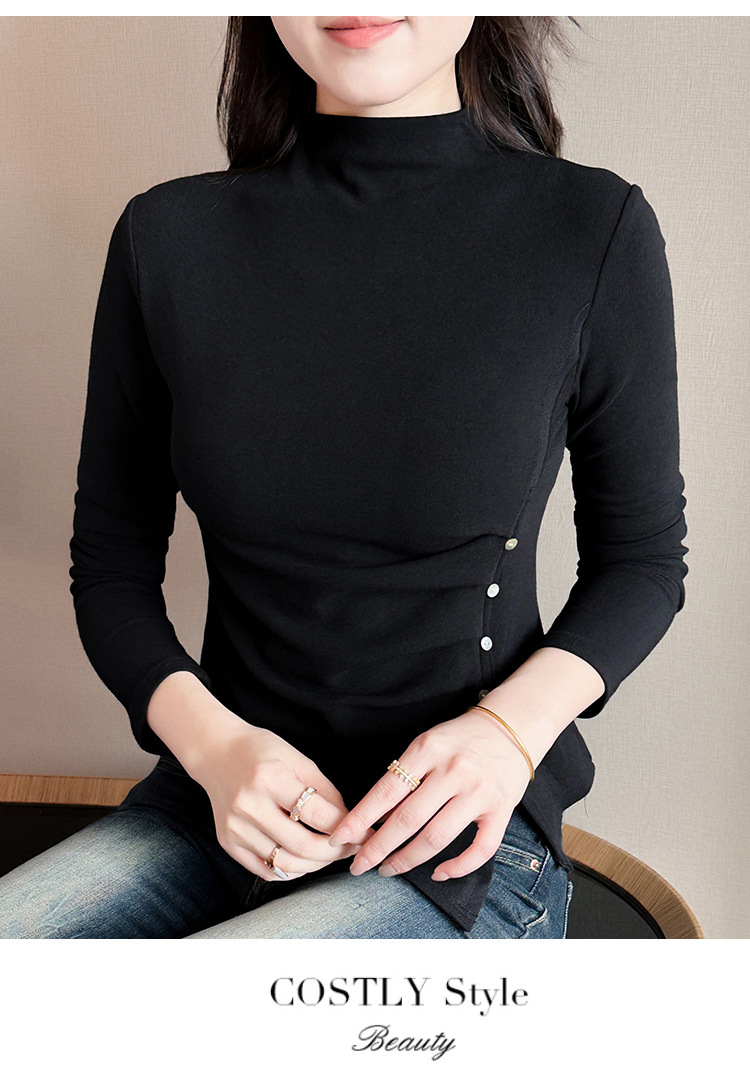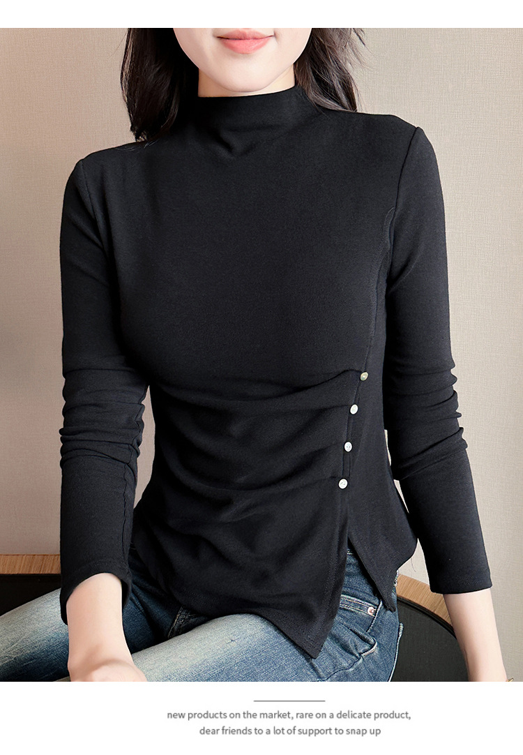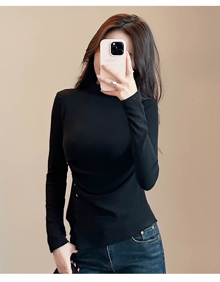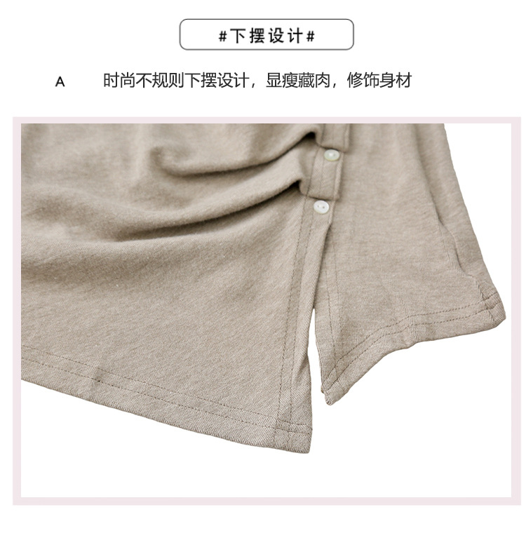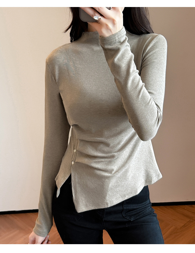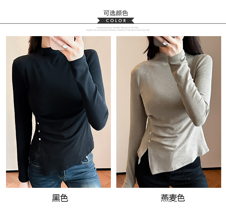 KQL 311H9182磨毛加厚半高领不规则纯色上衣开叉T恤纯色
