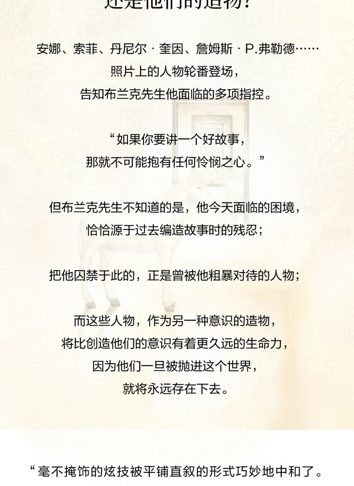 “如果你要讲一个好故事,那就不可能抱有任何怜悯之心。”但布兰克先生不知道的是,他今天面临的困境,恰恰源于过去编造故事时的残忍;把他囚禁于此的,正是曾被他粗暴对待的人物;而这些人物,作为另一种意识的造物,将比创造他们的意识有着更久远的生命力,因为他们一旦被抛进这个世界,就将永远存在下去。
