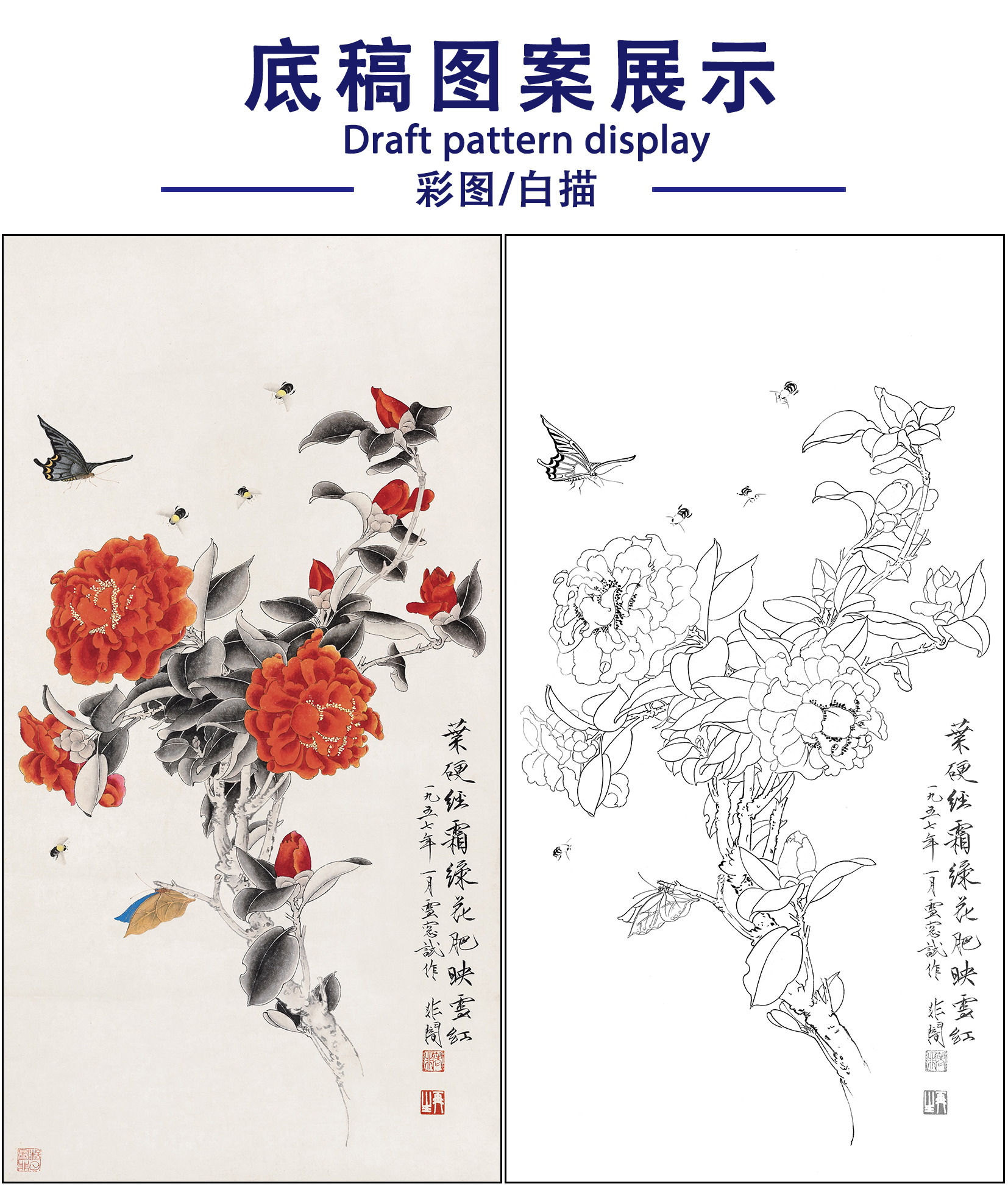工笔画白描底稿于非闇花鸟《山茶蝴蝶》临摹勾线高清打印稿FA39