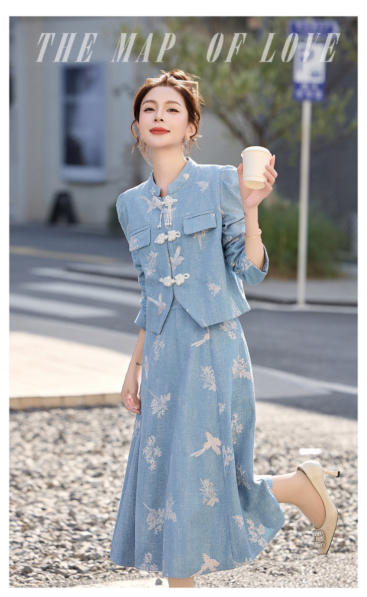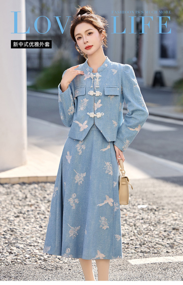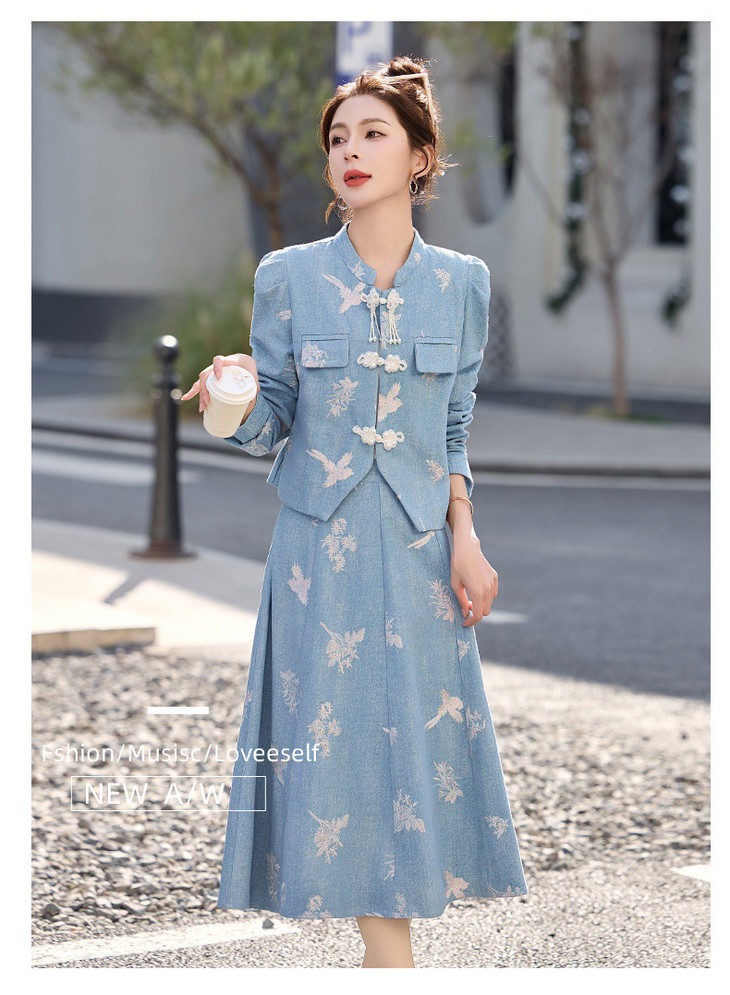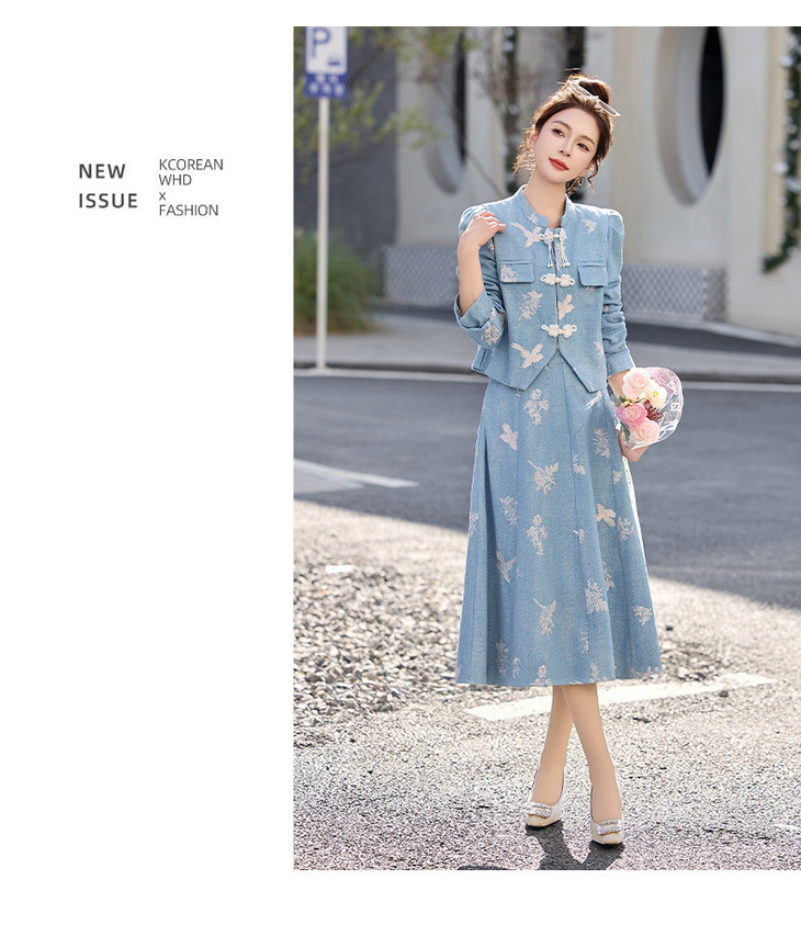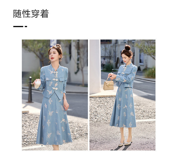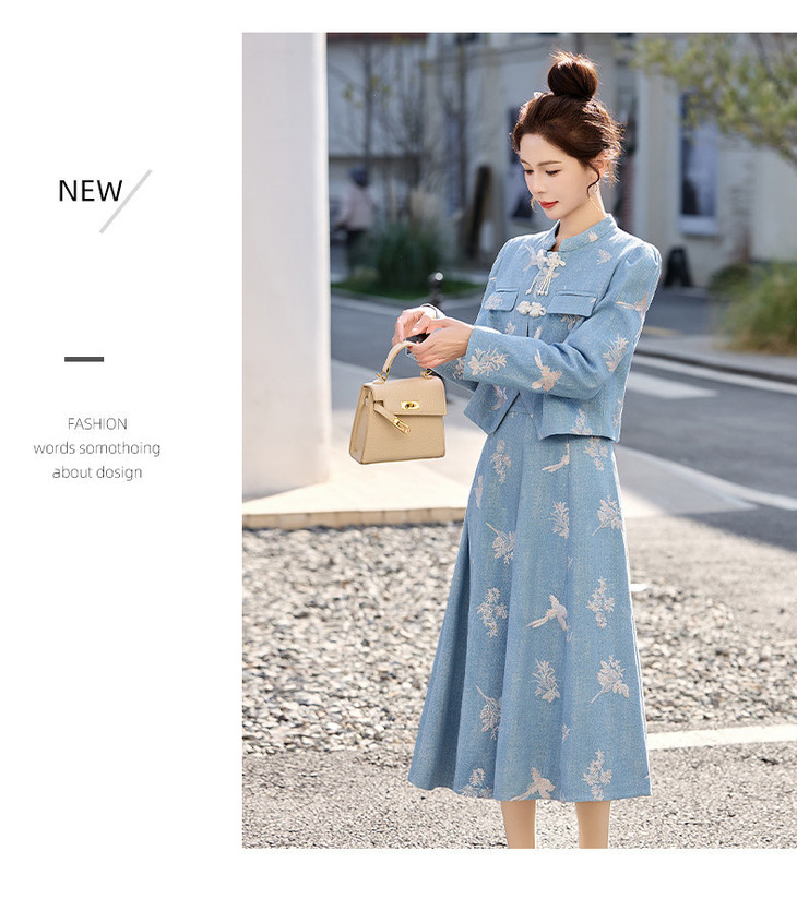 2026春季新款新中式蓝色花卉套装女立领盘扣气质减龄中长裙两件套YQH6111