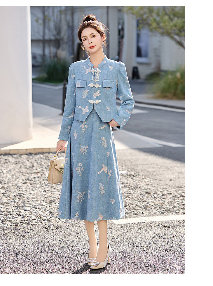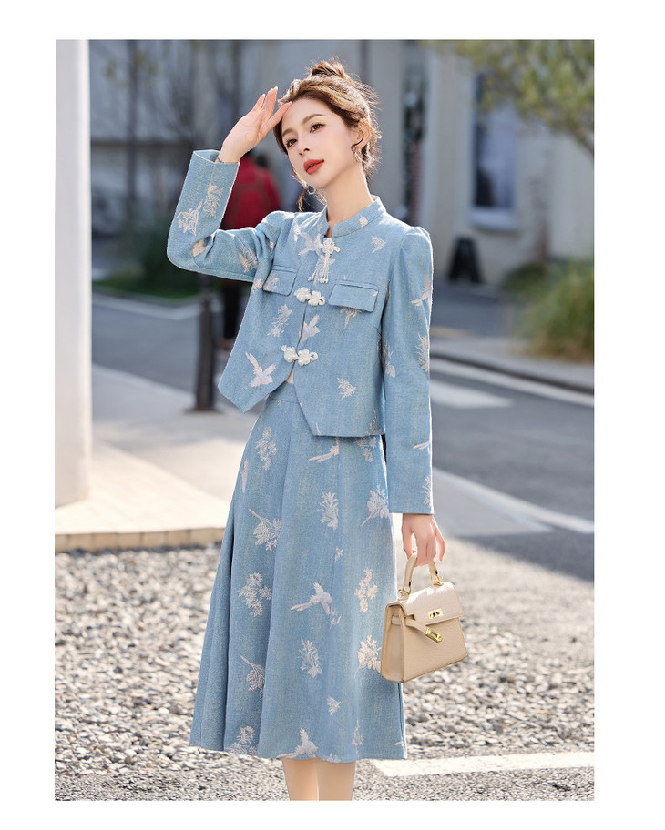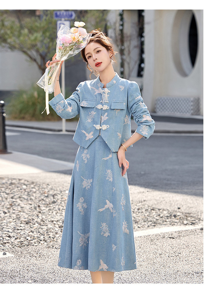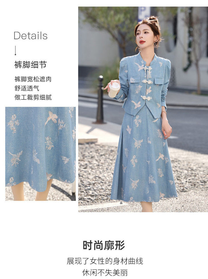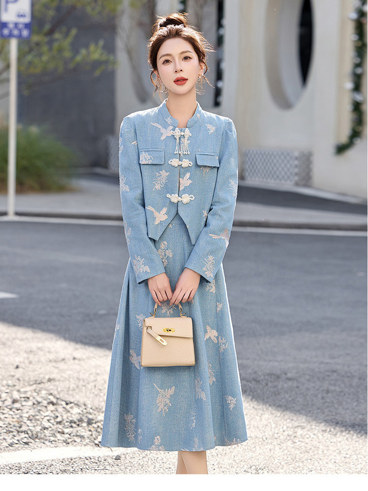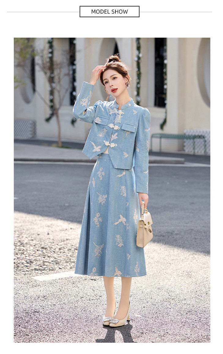 2026春季新款新中式蓝色花卉套装女立领盘扣气质减龄中长裙两件套YQH6111