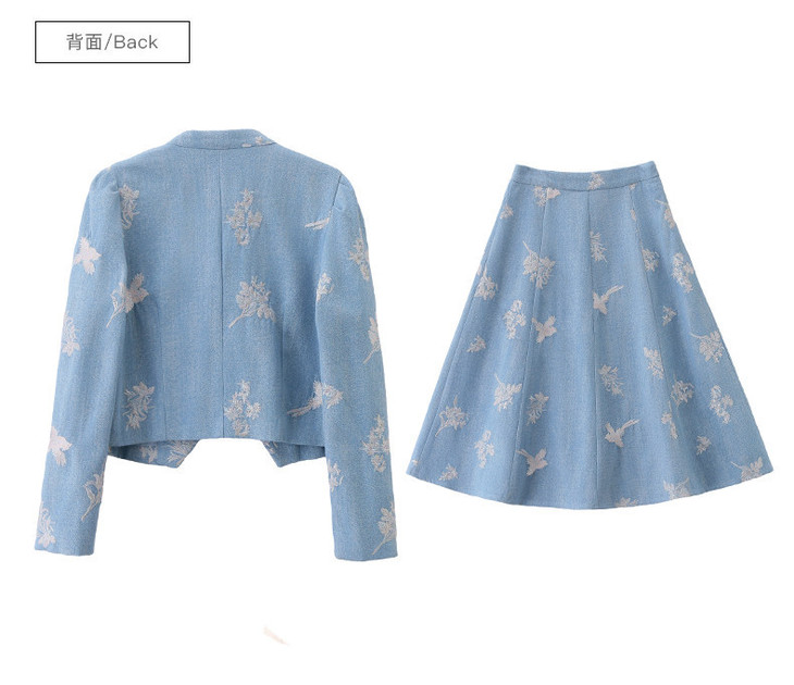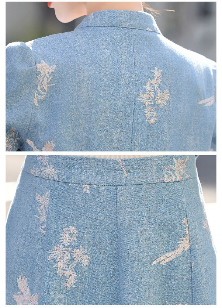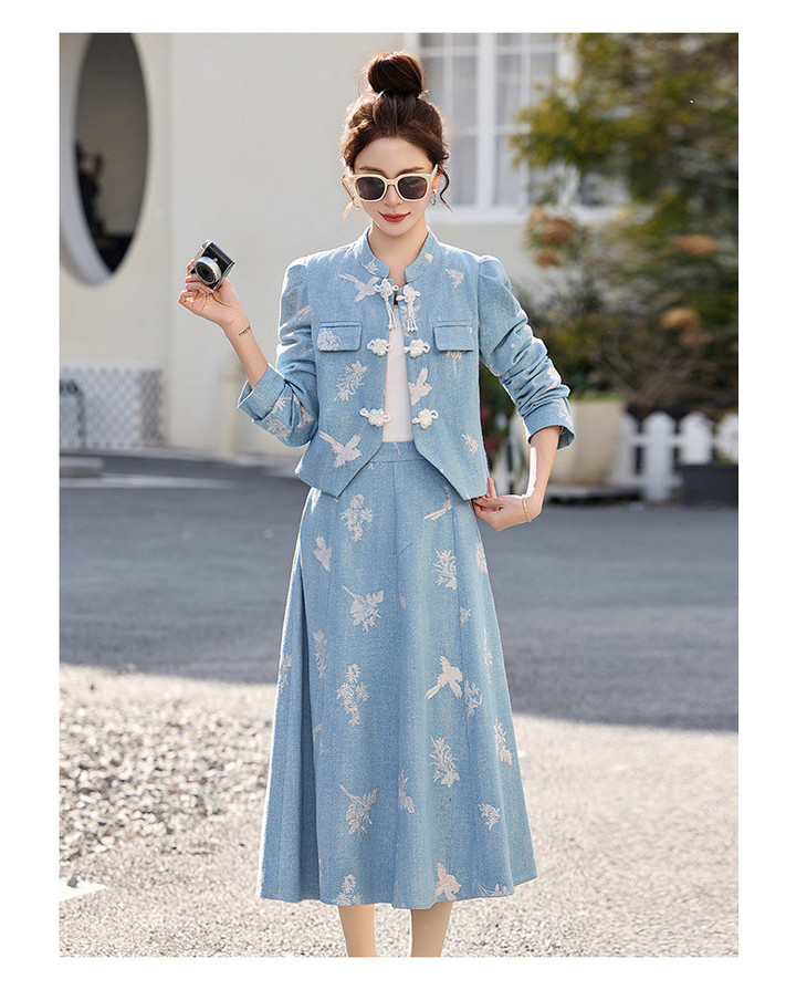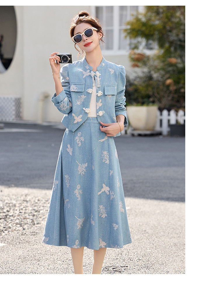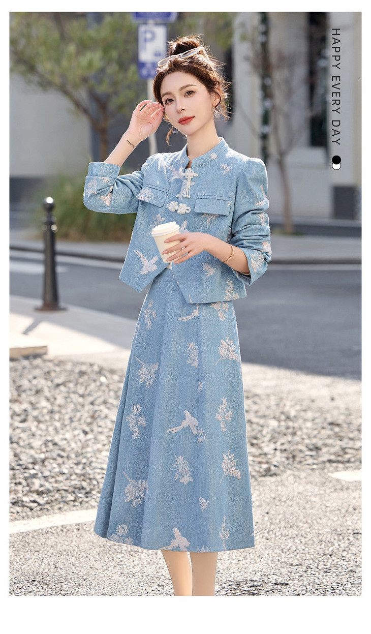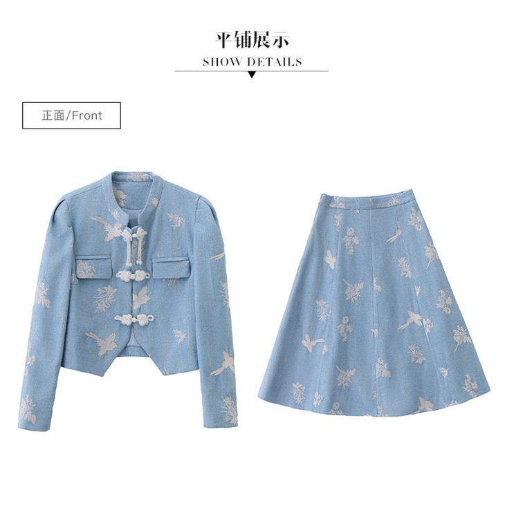 2026春季新款新中式蓝色花卉套装女立领盘扣气质减龄中长裙两件套YQH6111