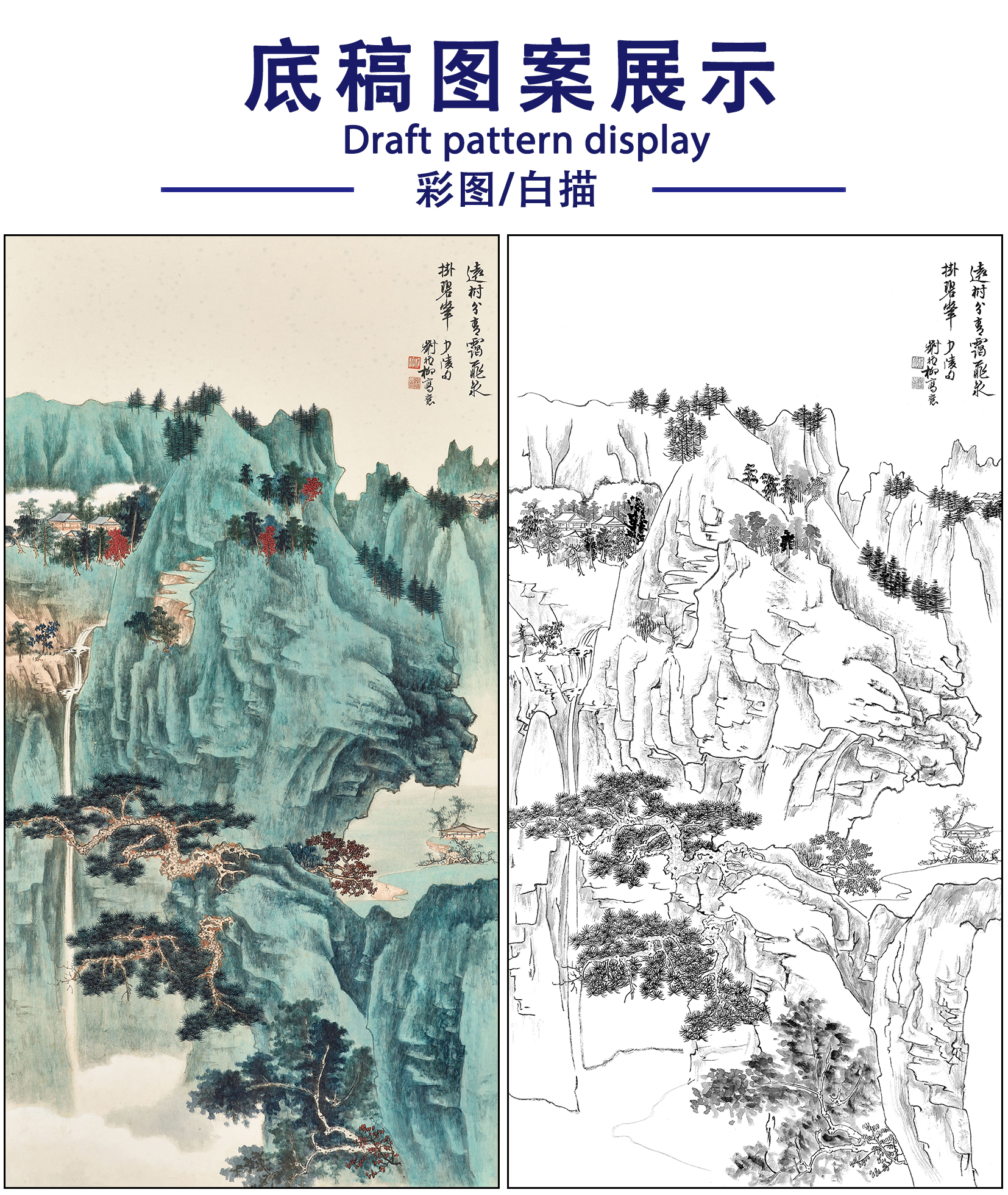 谢稚柳山水工笔画白描底稿《碧峰飞泉》临摹勾线高清打印稿XZ42