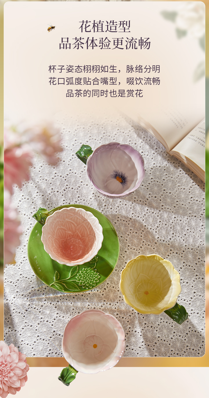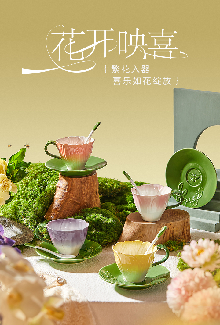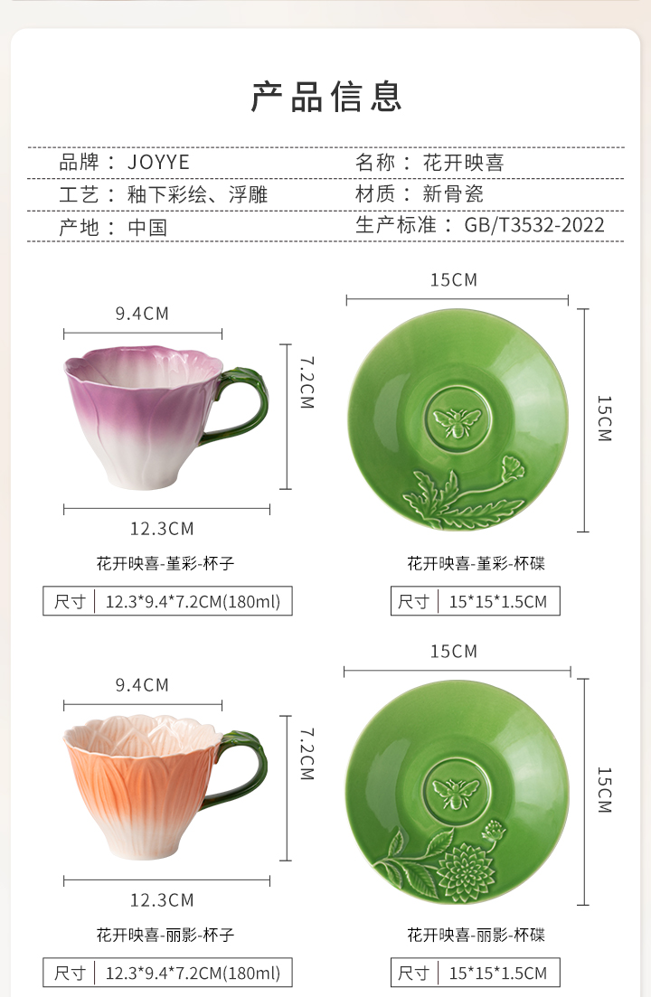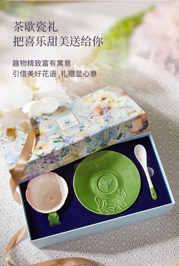 JOYYE花开映喜-釉下彩浮雕花高颜值创意杯子女下午茶杯碟套装陶瓷带勺礼盒
