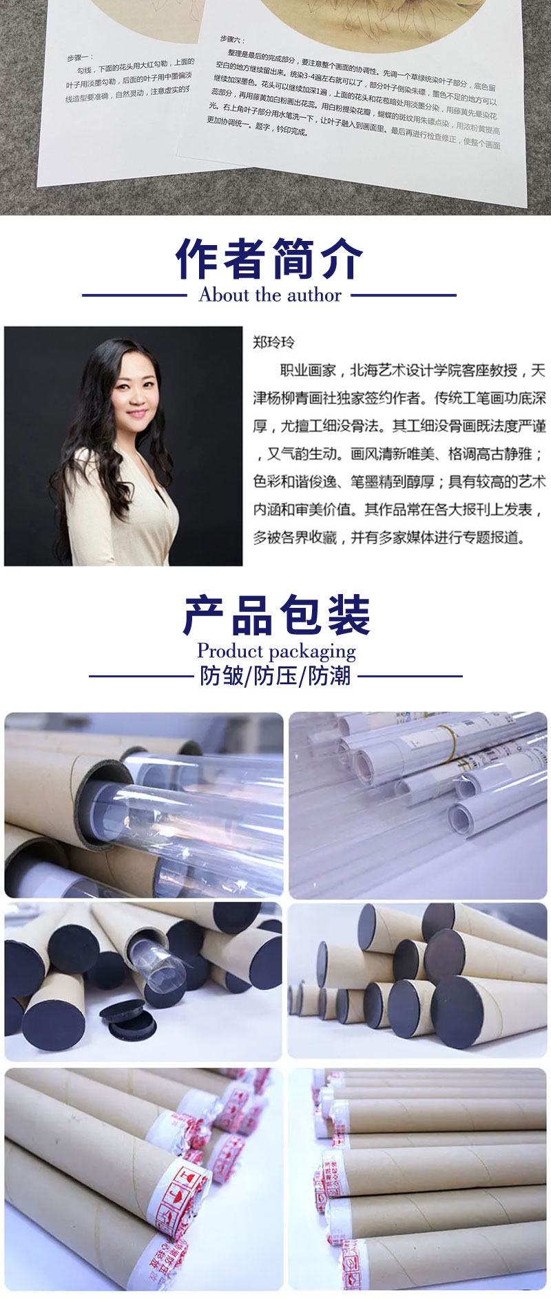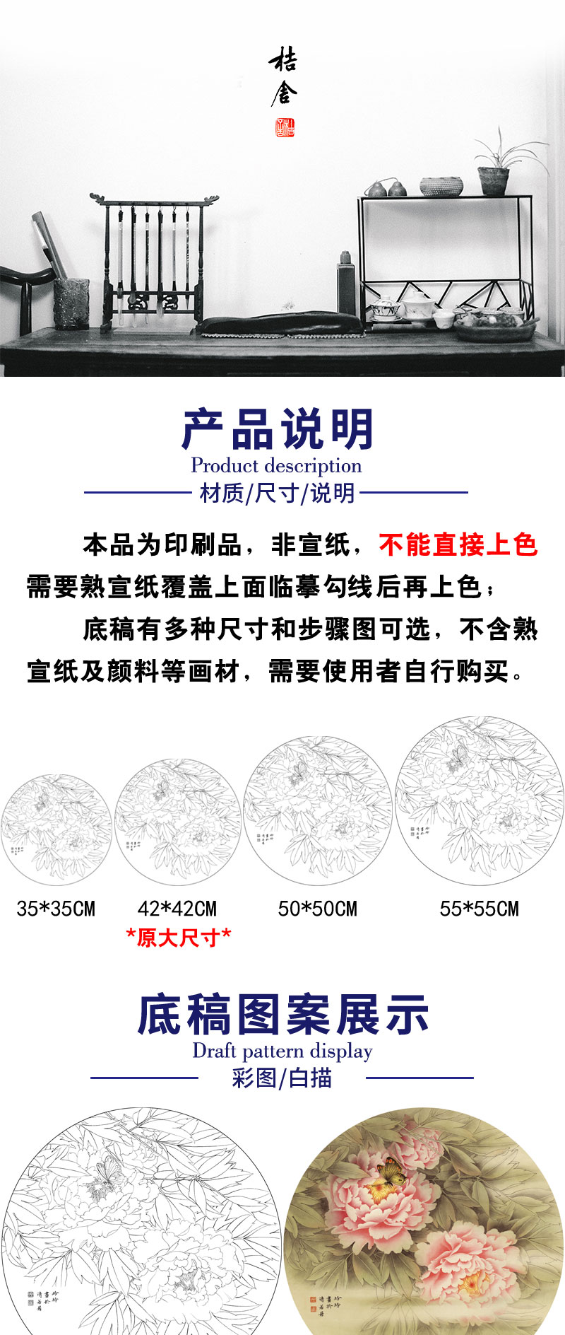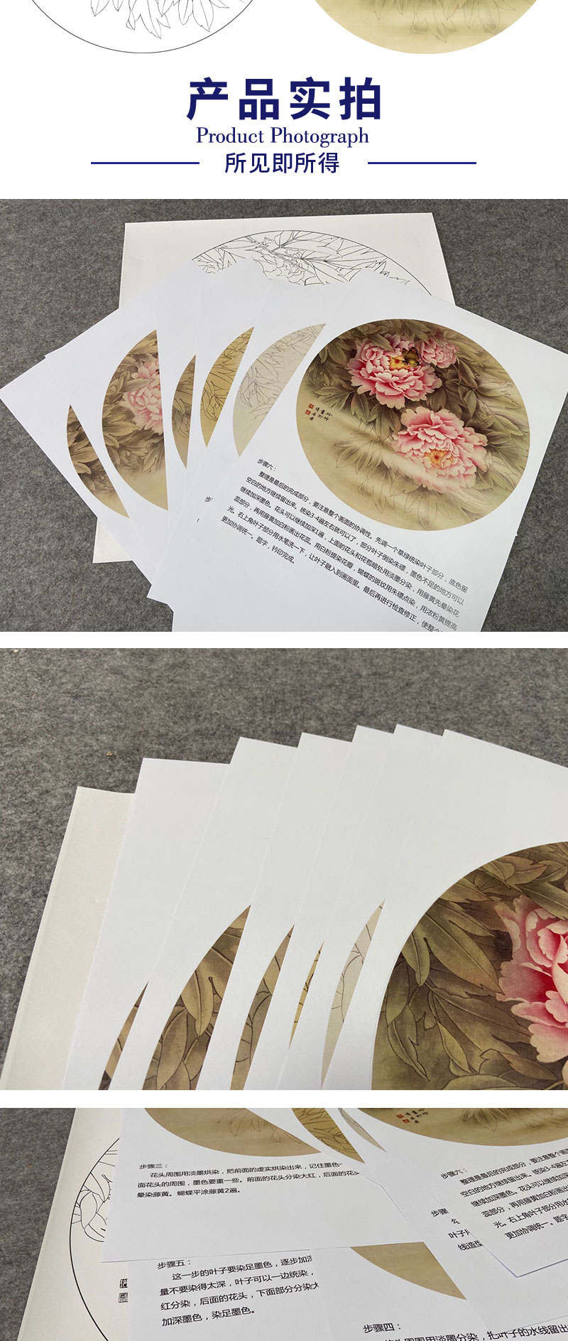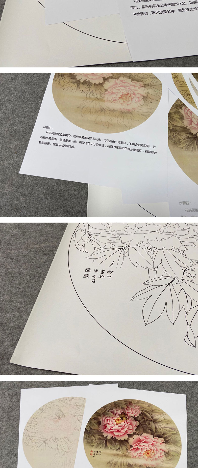 【有步骤、大彩图】郑玲玲工笔画白描底稿圆形小品《牡丹蝴蝶图》初学者临摹花鸟线稿ZL11