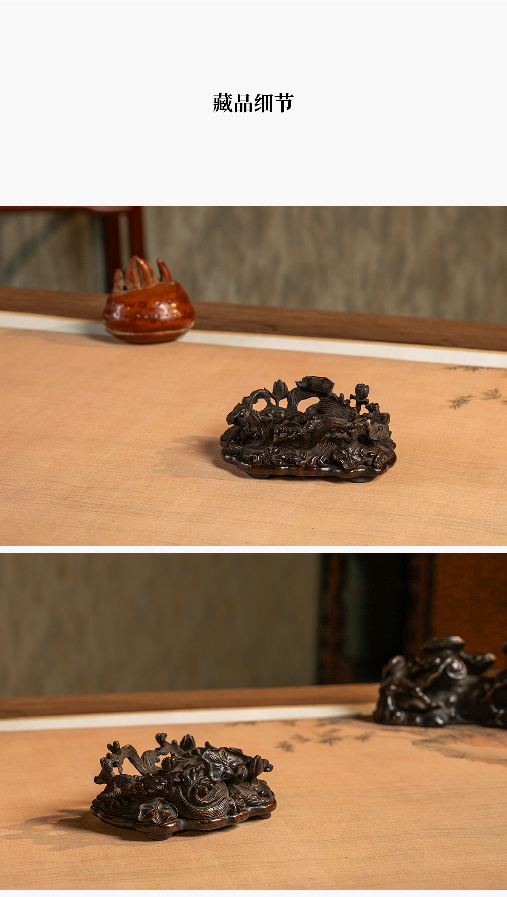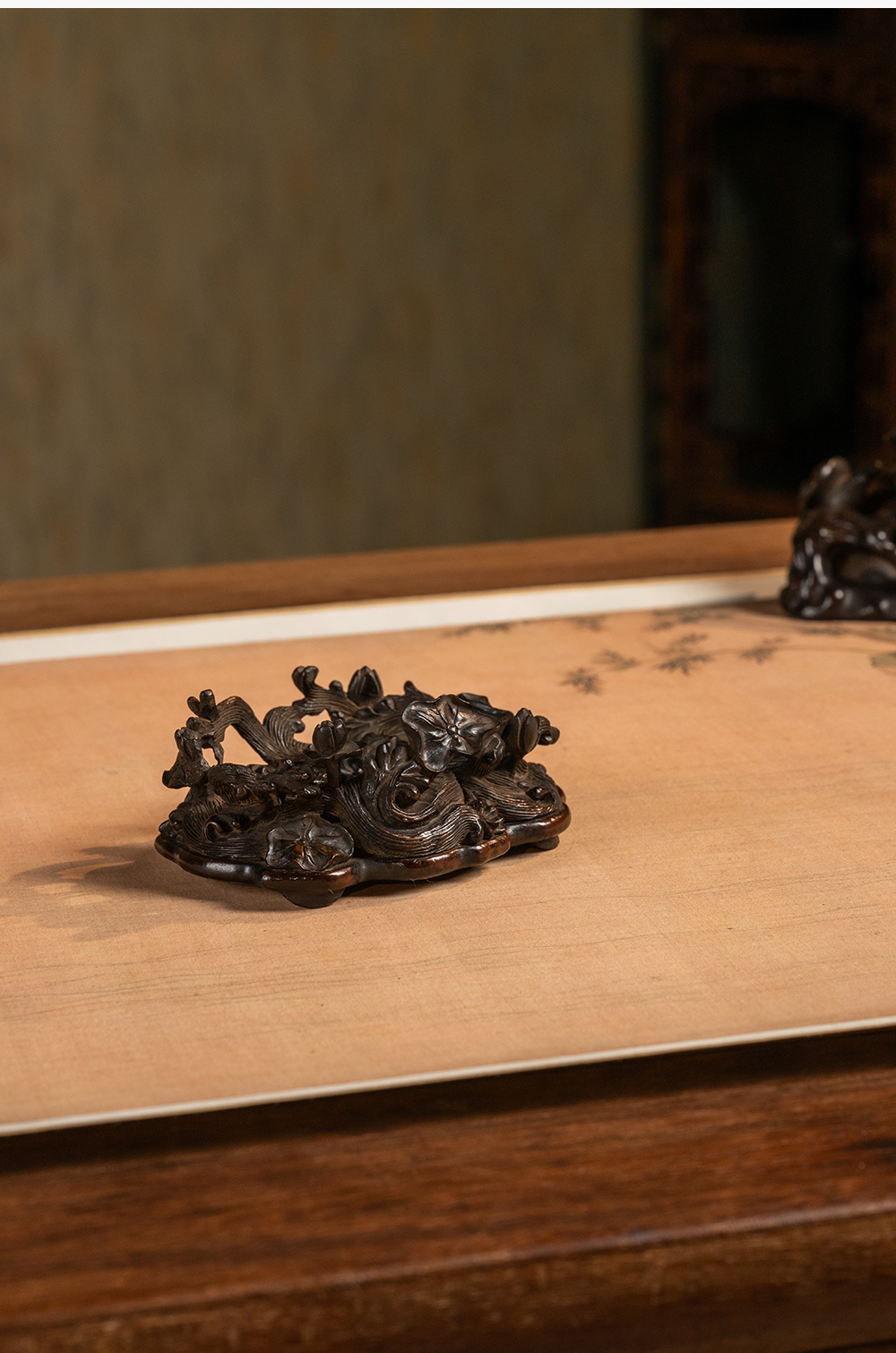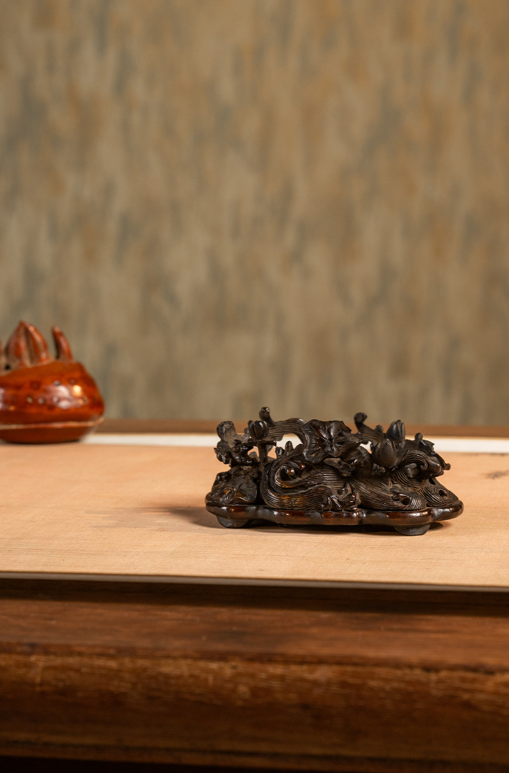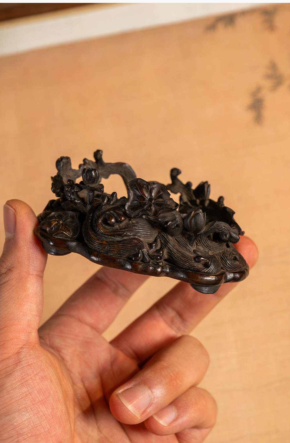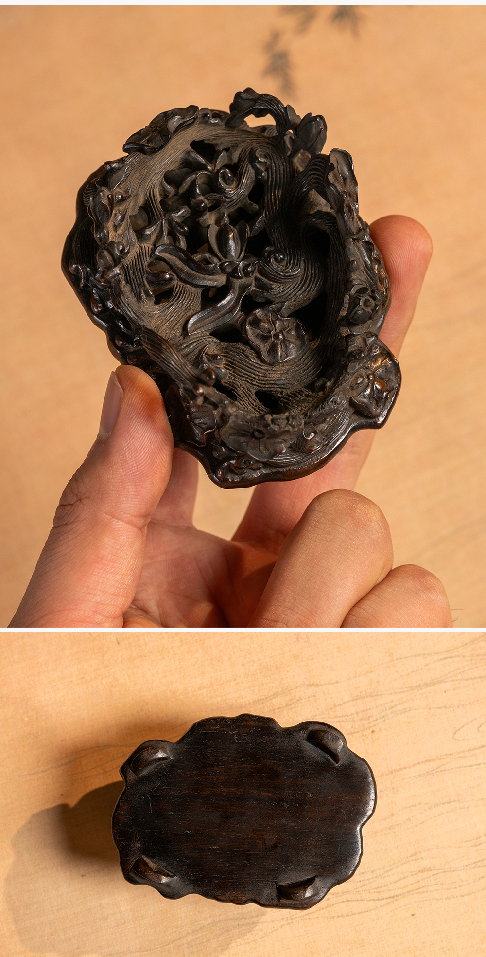 清 红木透雕海水荷花纹器座