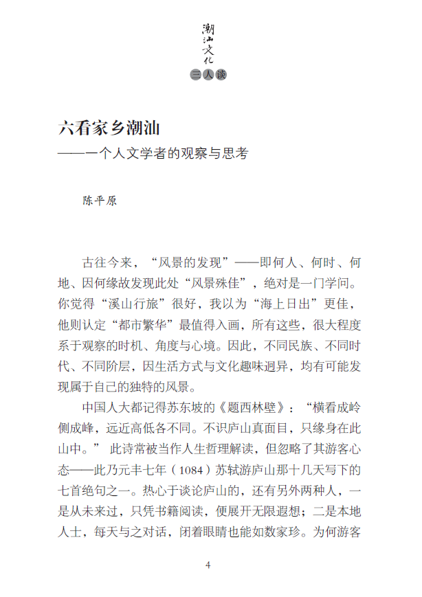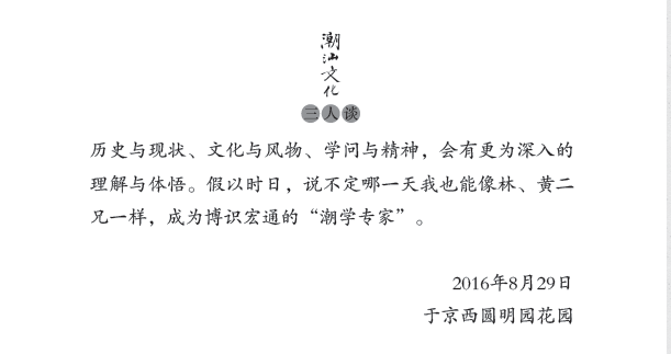 三个各有专长的潮籍学者,精选若干谈论潮汕文化的文章,涉及本土文化、海外移民、潮学研究等多个方面,从不同角度关注、发掘、阐释潮汕文化的内涵。