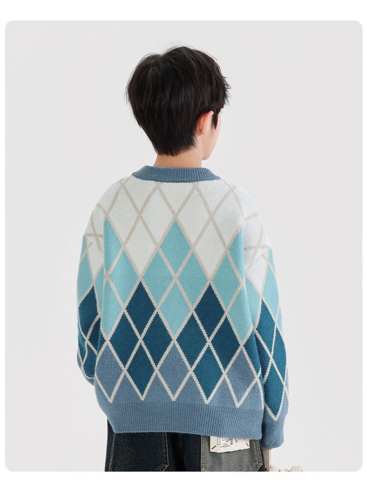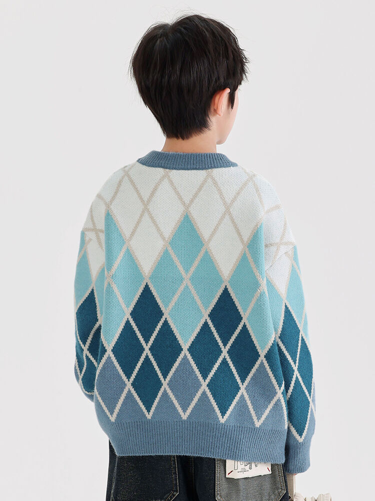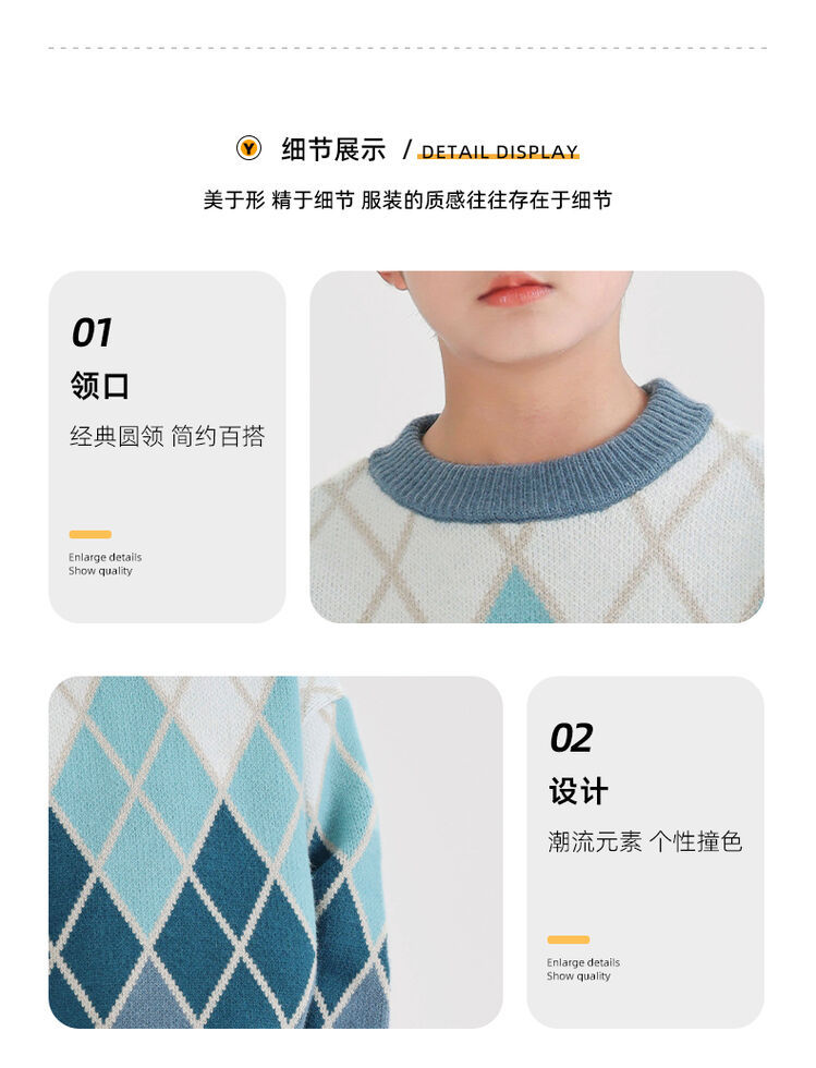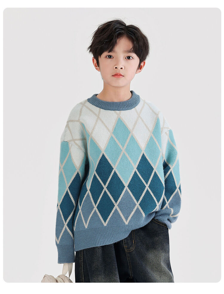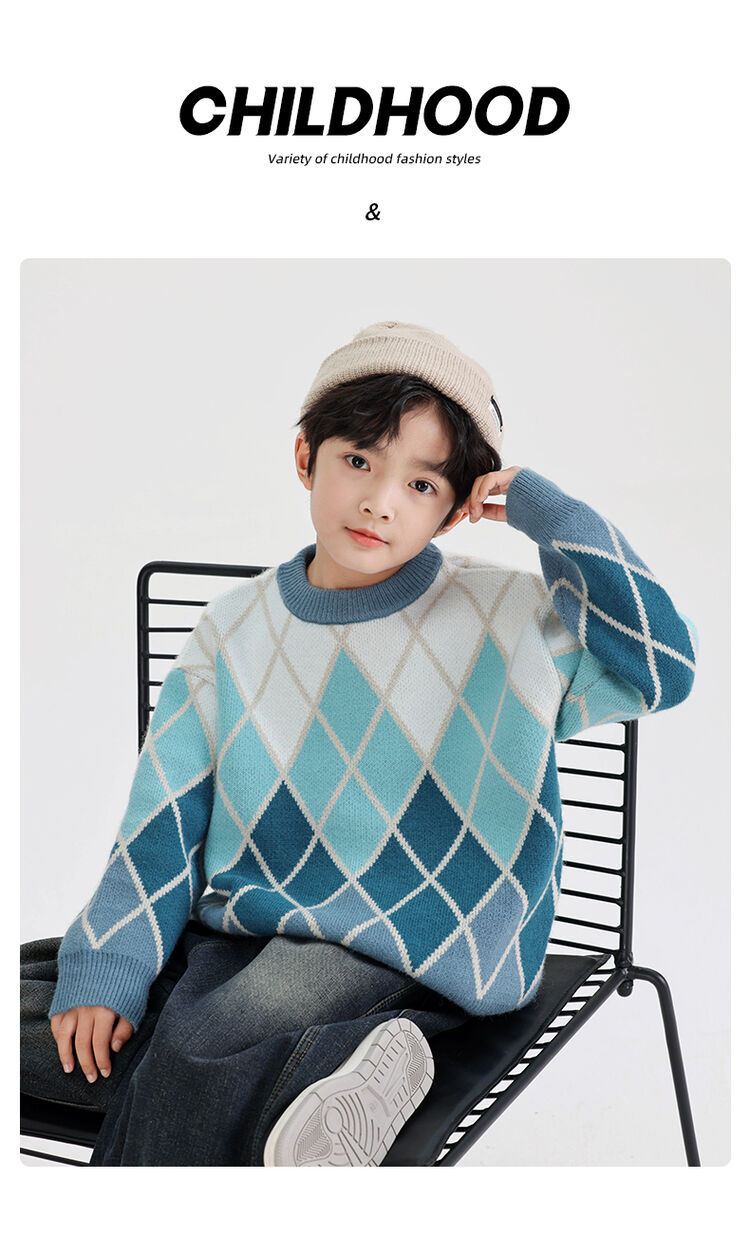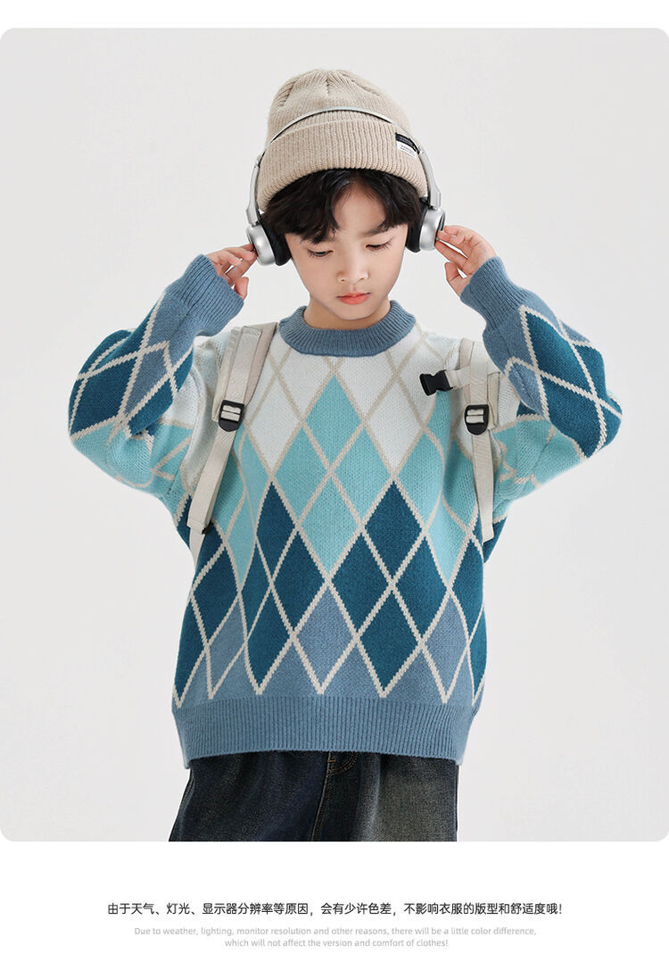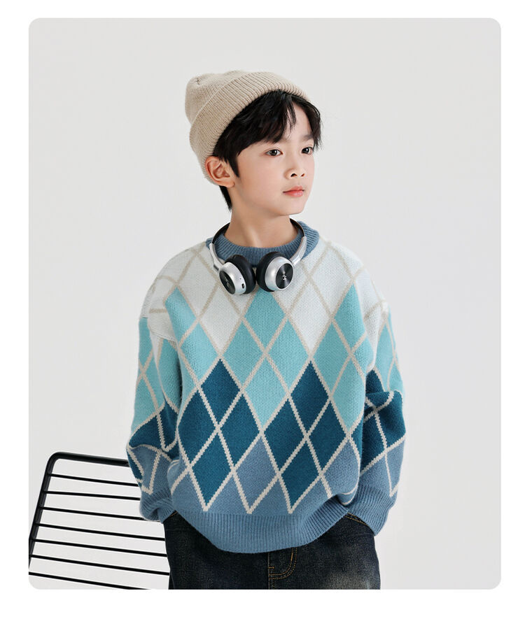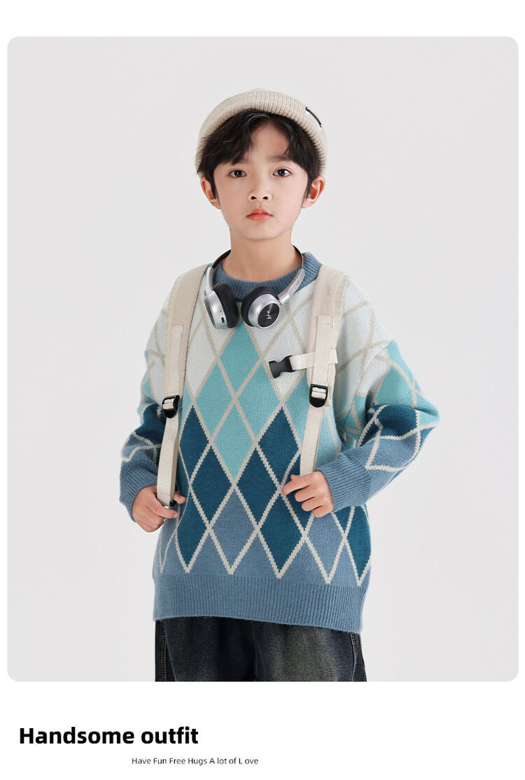 【柔软舒适面料,精致菱形线条,时尚设计,让孩子穿出自信!】秋冬男童菱形格毛衣 秋冬新款中大童韩版 休闲洋气圆领针织衫潮-QQ