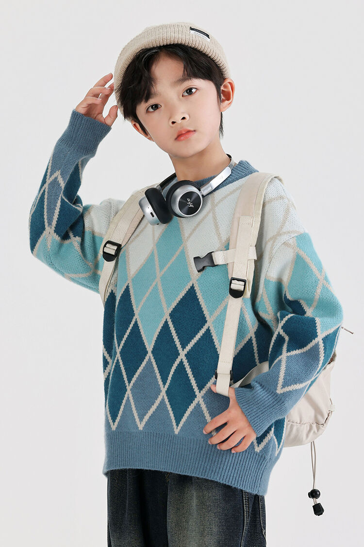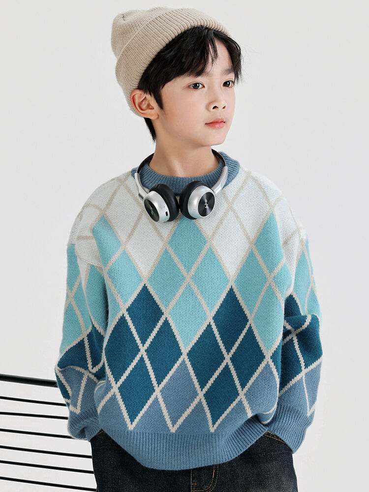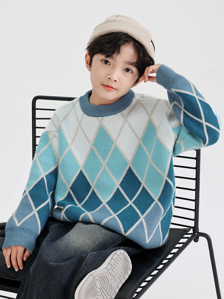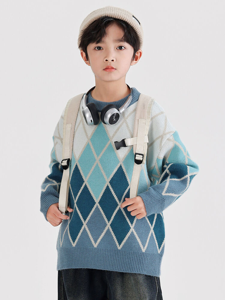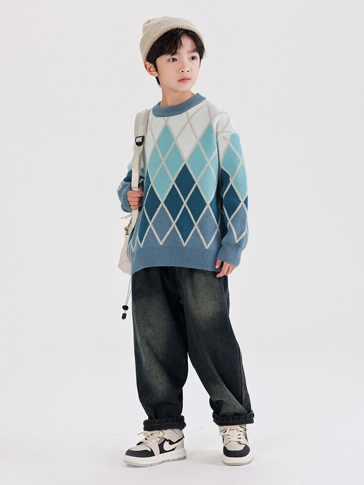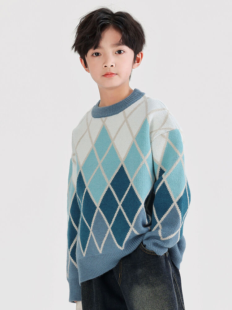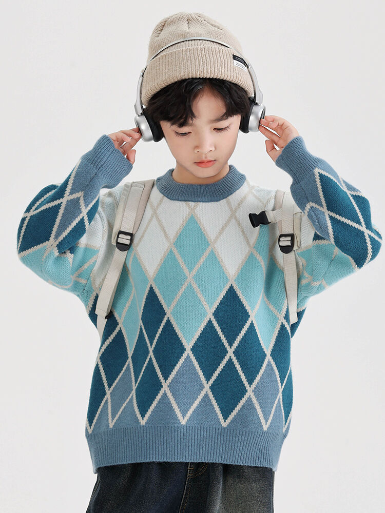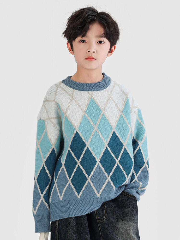 【柔软舒适面料,精致菱形线条,时尚设计,让孩子穿出自信!】秋冬男童菱形格毛衣 秋冬新款中大童韩版 休闲洋气圆领针织衫潮-QQ