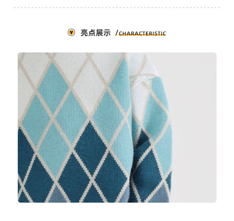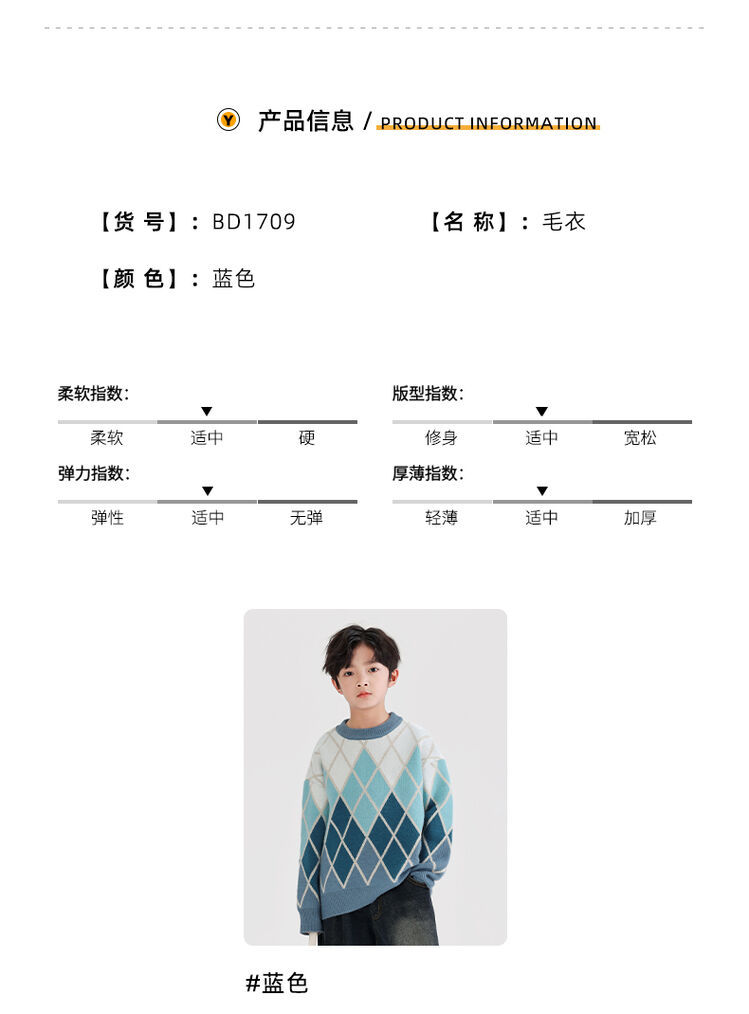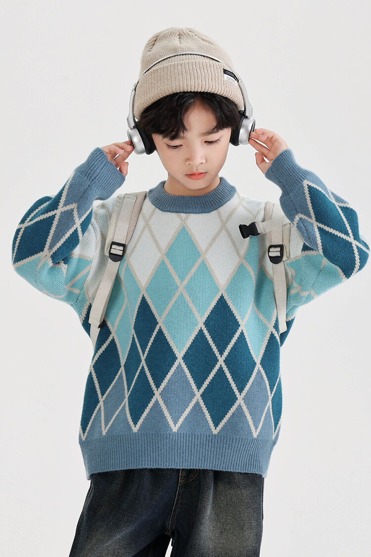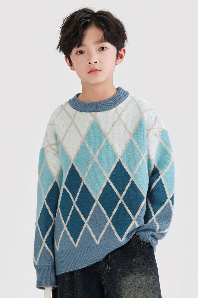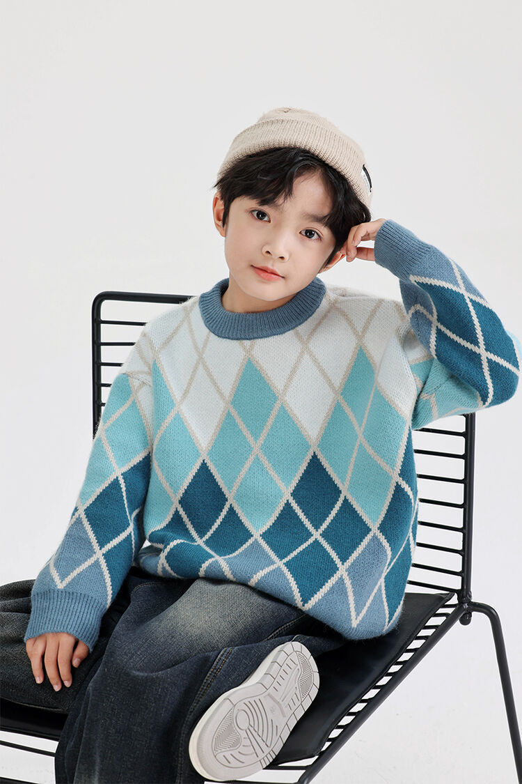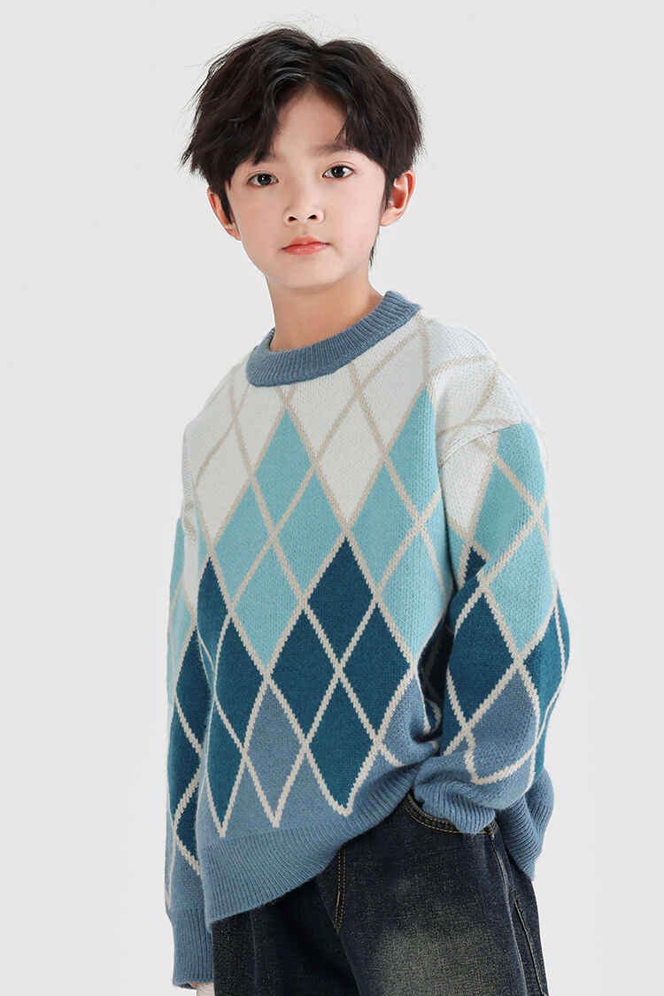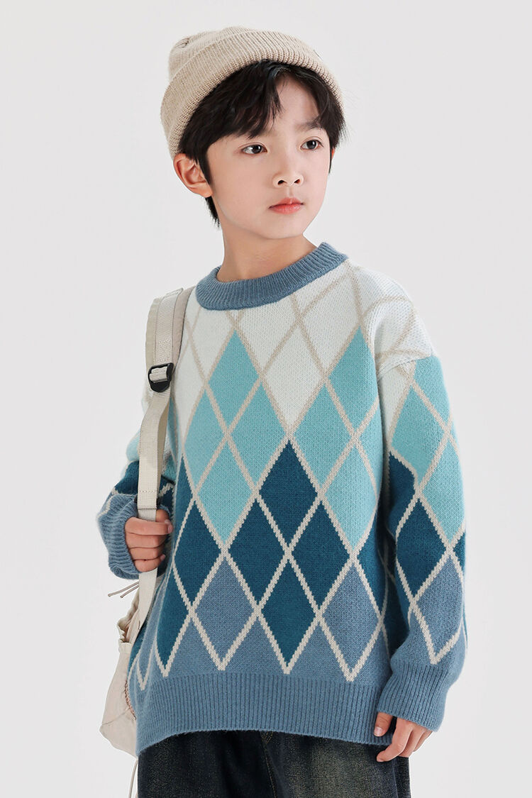 【柔软舒适面料,精致菱形线条,时尚设计,让孩子穿出自信!】秋冬男童菱形格毛衣 秋冬新款中大童韩版 休闲洋气圆领针织衫潮-QQ
