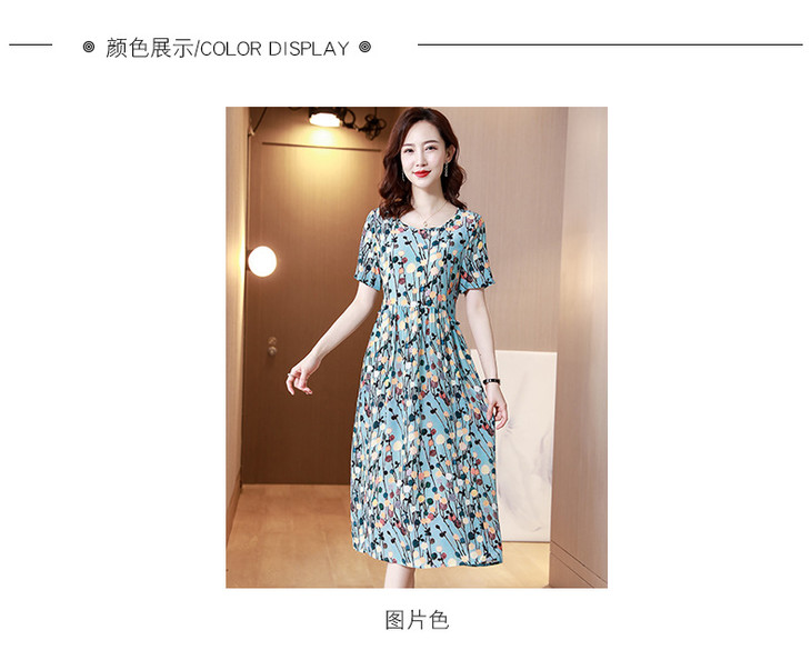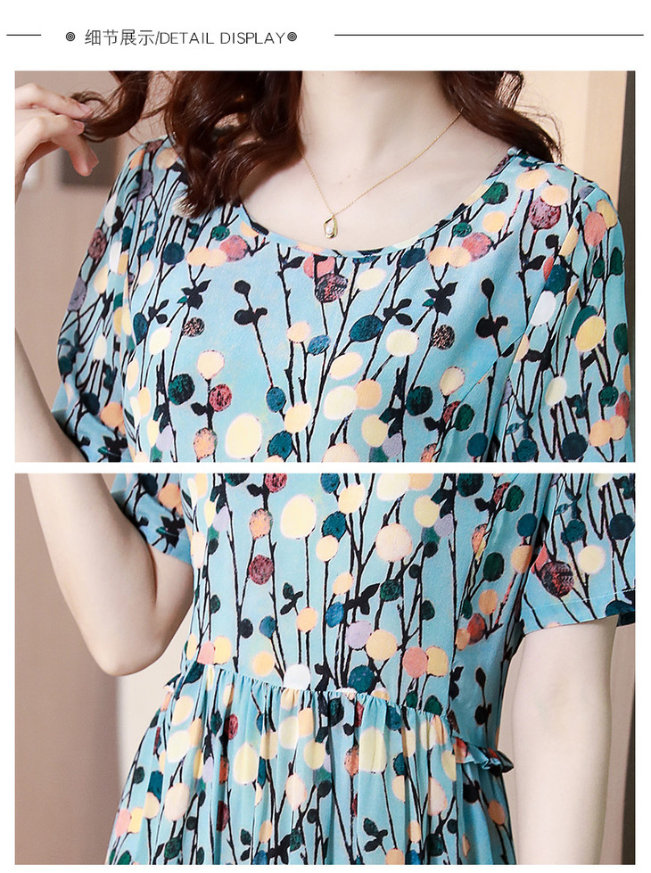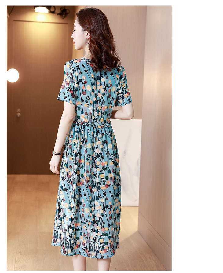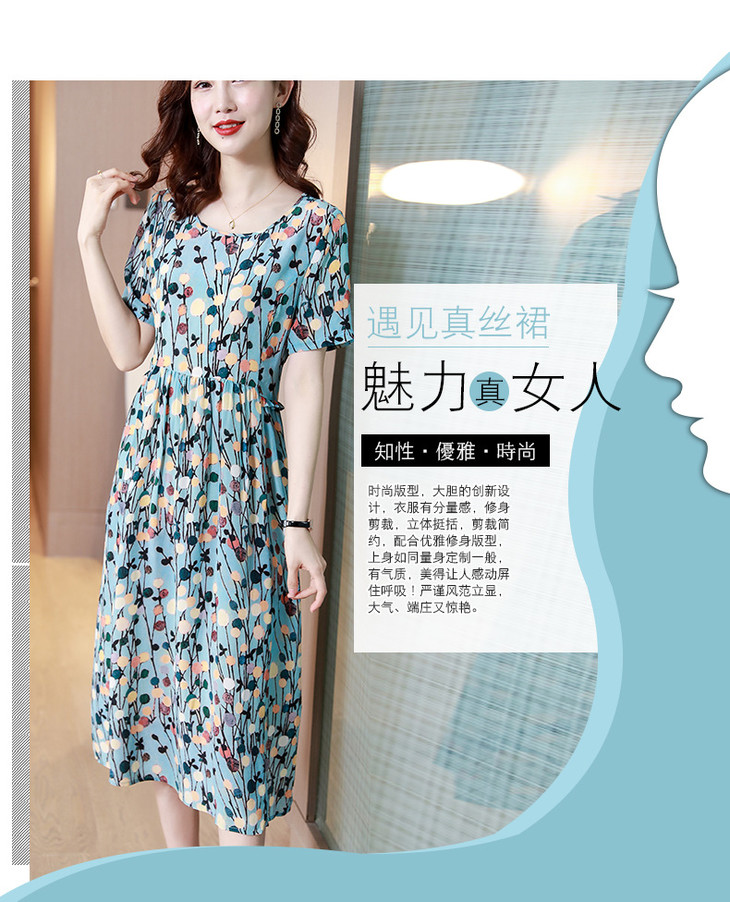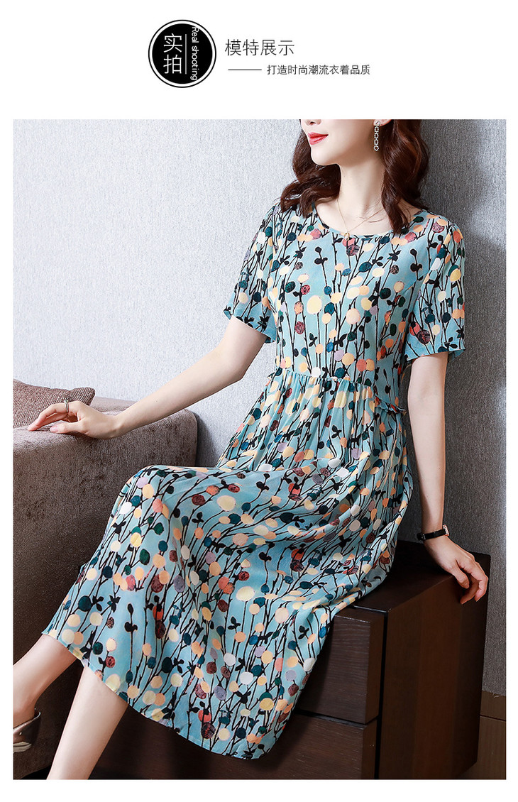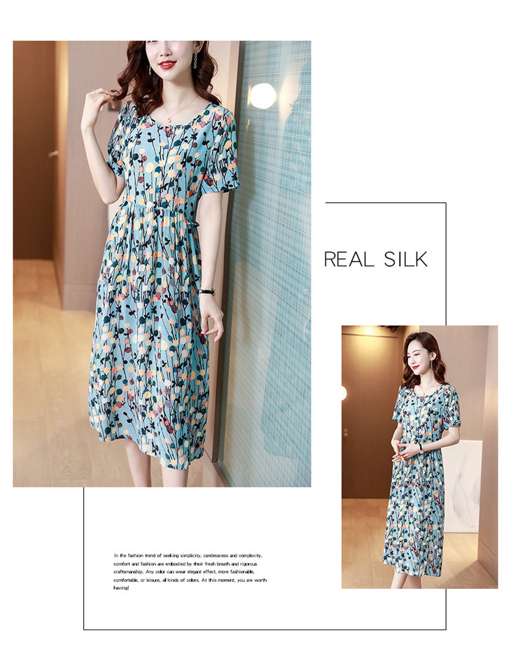 KQLFS85918新款时尚优雅气质宽松圆领短袖中长款真丝碎花连衣裙