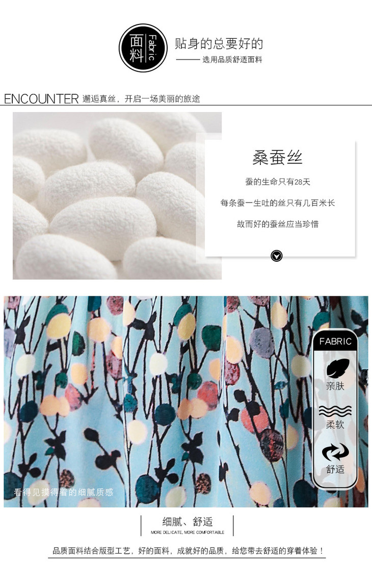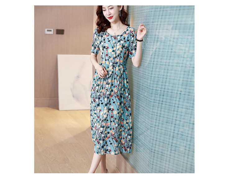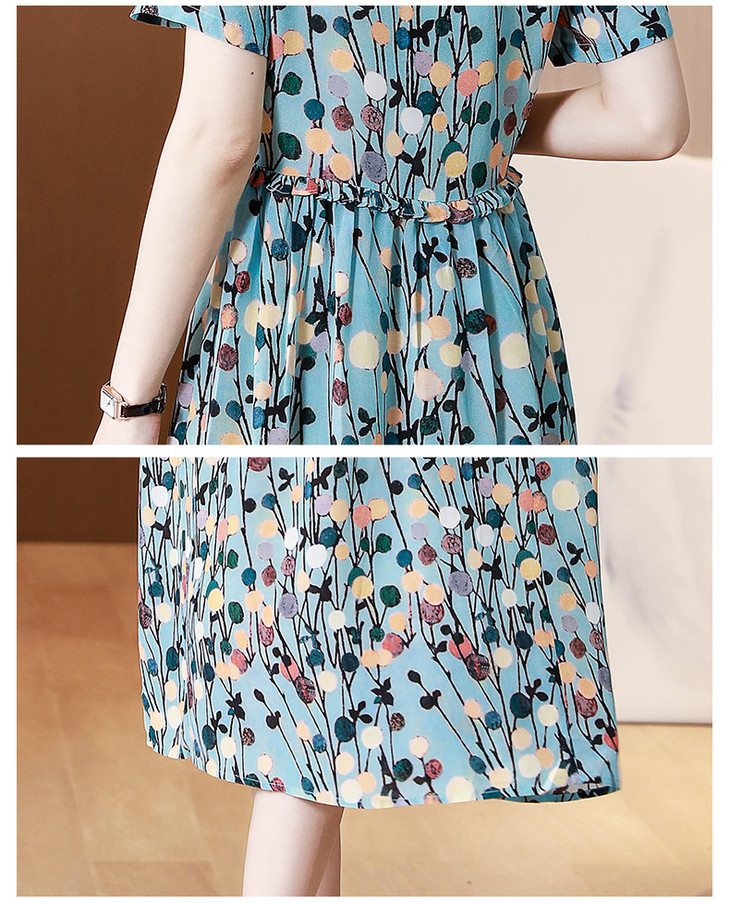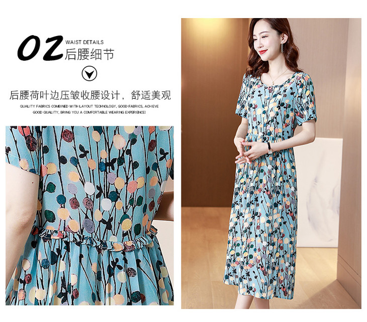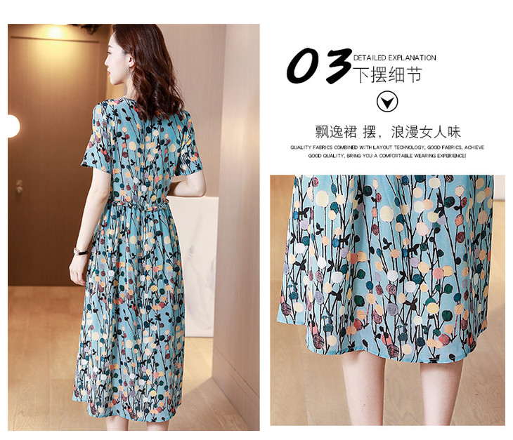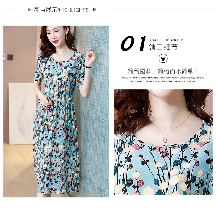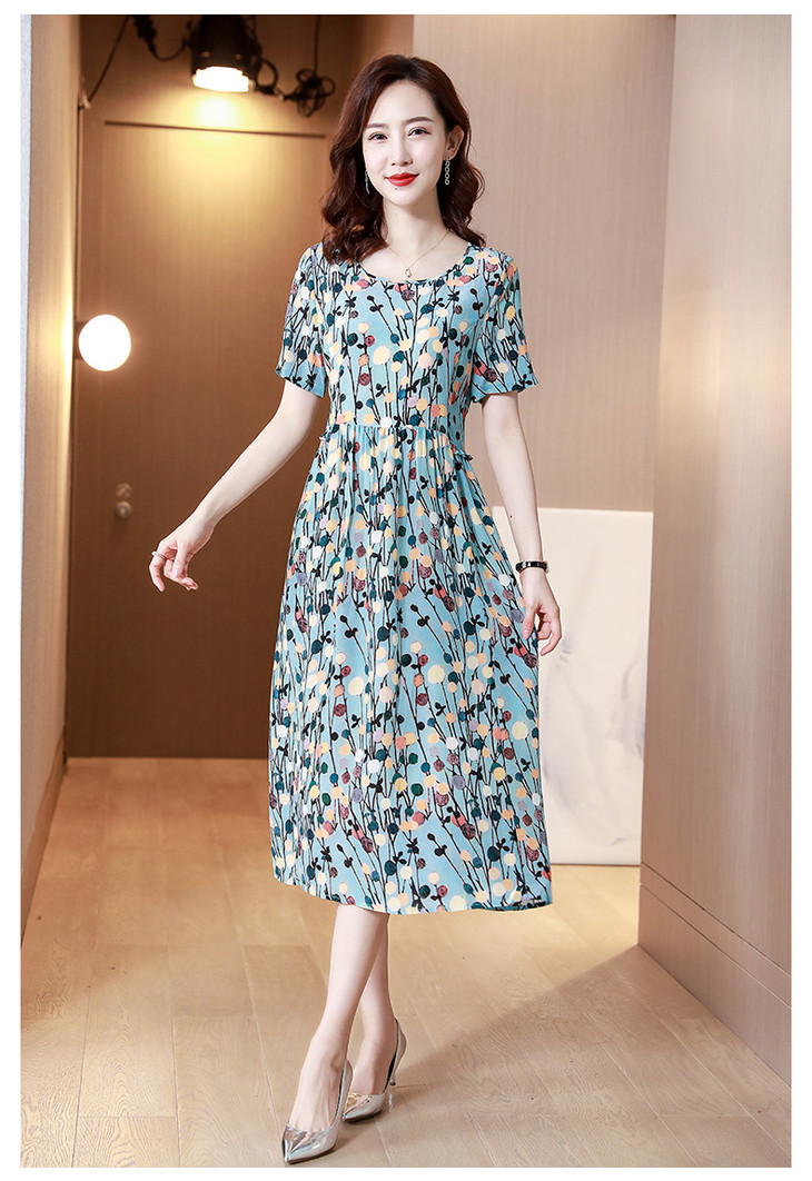 KQLFS85918新款时尚优雅气质宽松圆领短袖中长款真丝碎花连衣裙