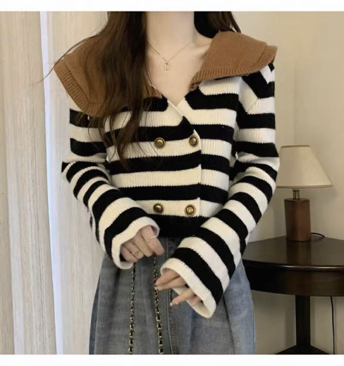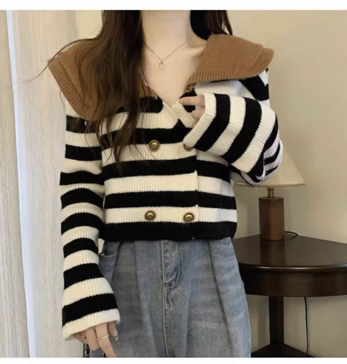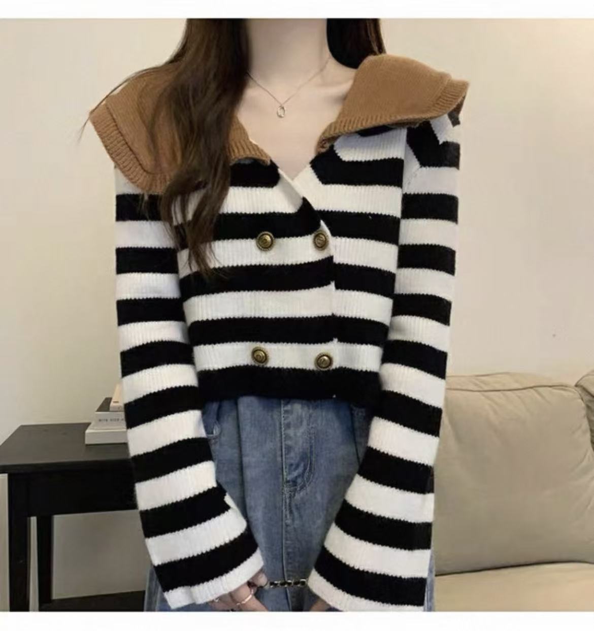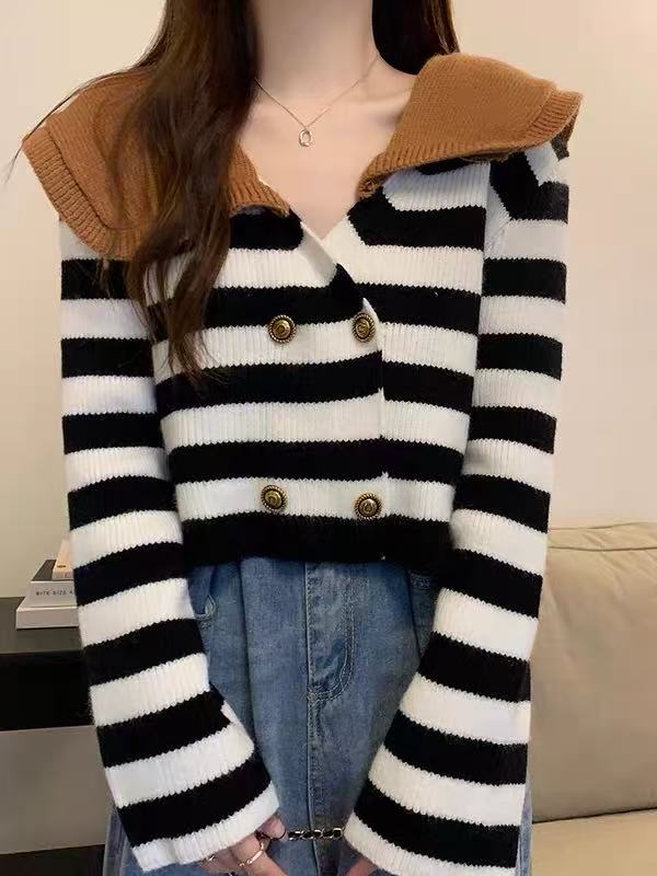 【孤品捡漏】G42黑白条拼咖色翻领短款针织毛衣-喜出