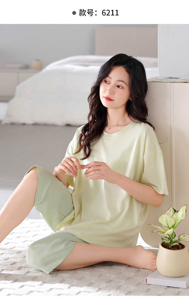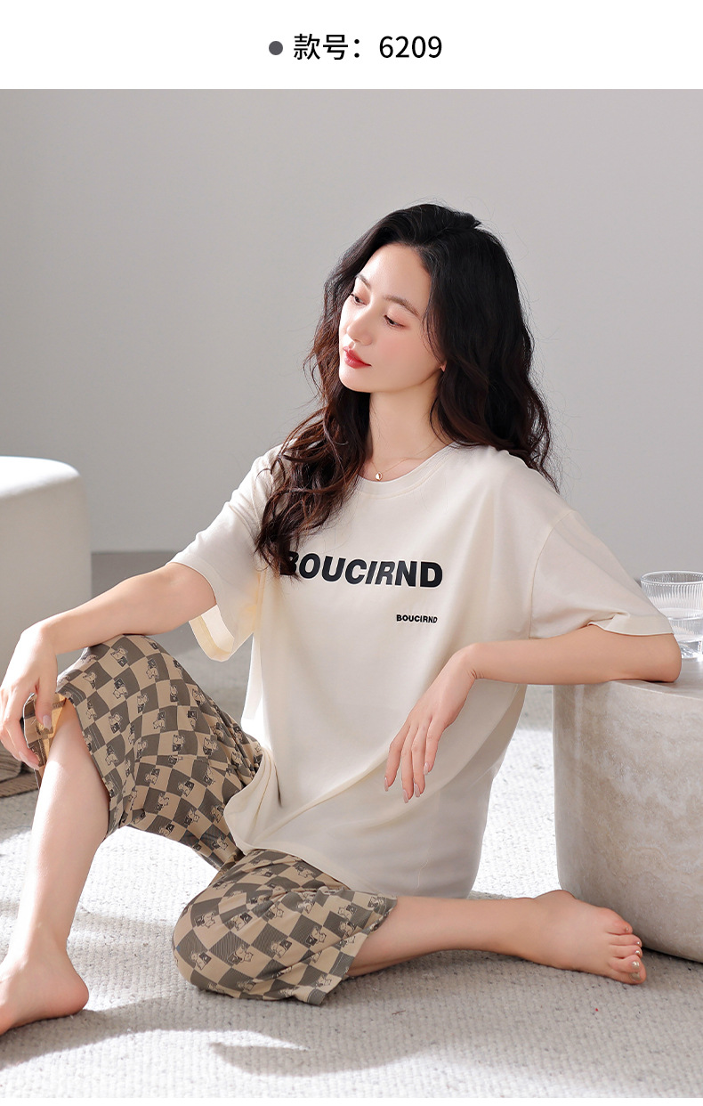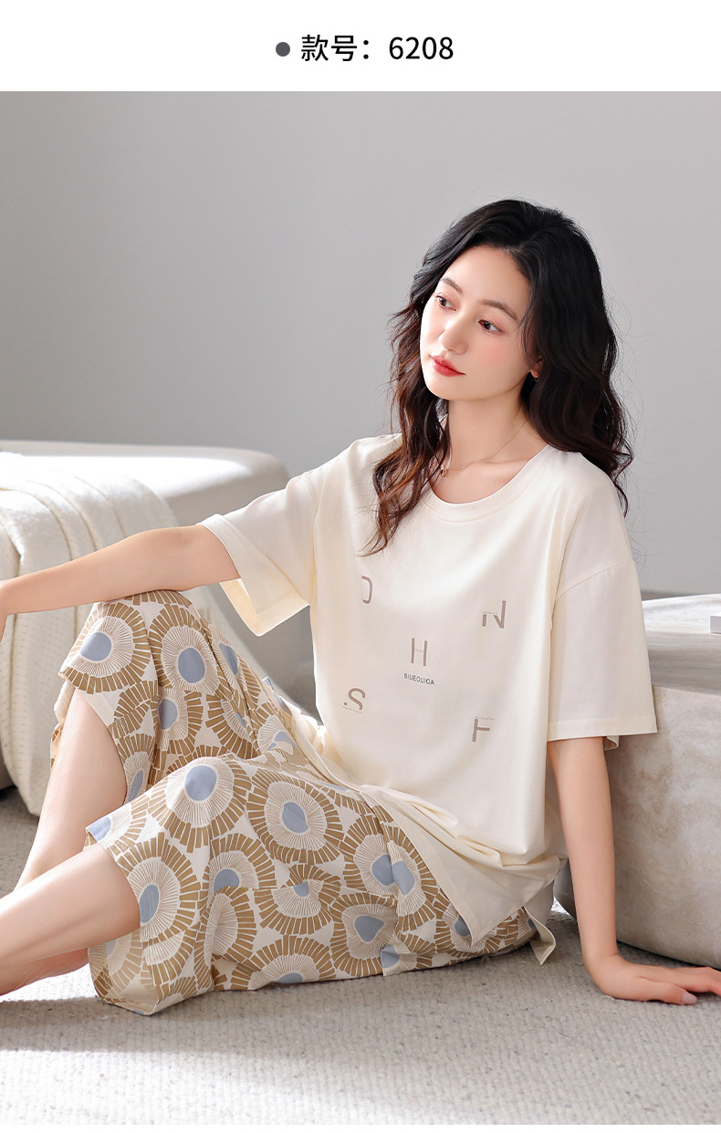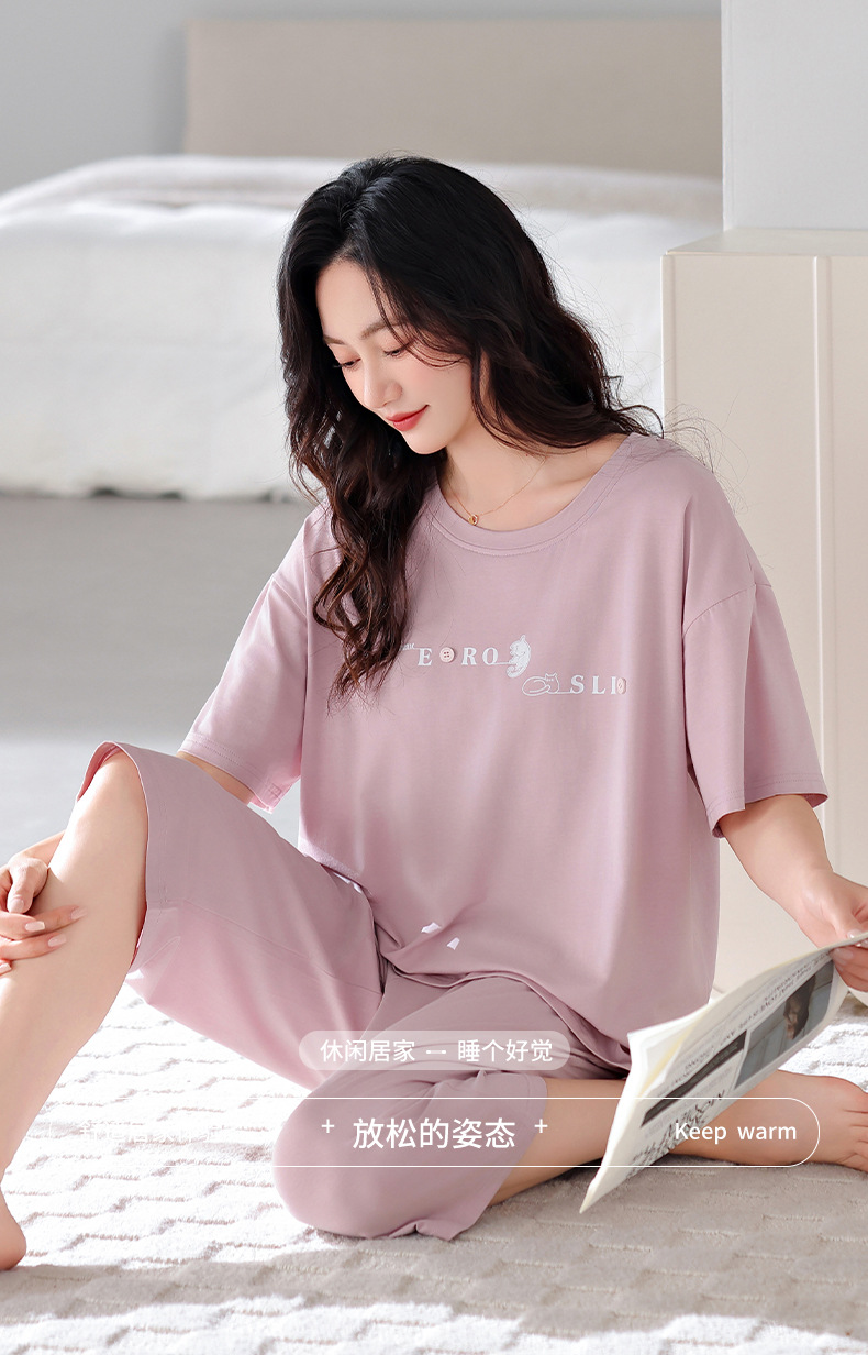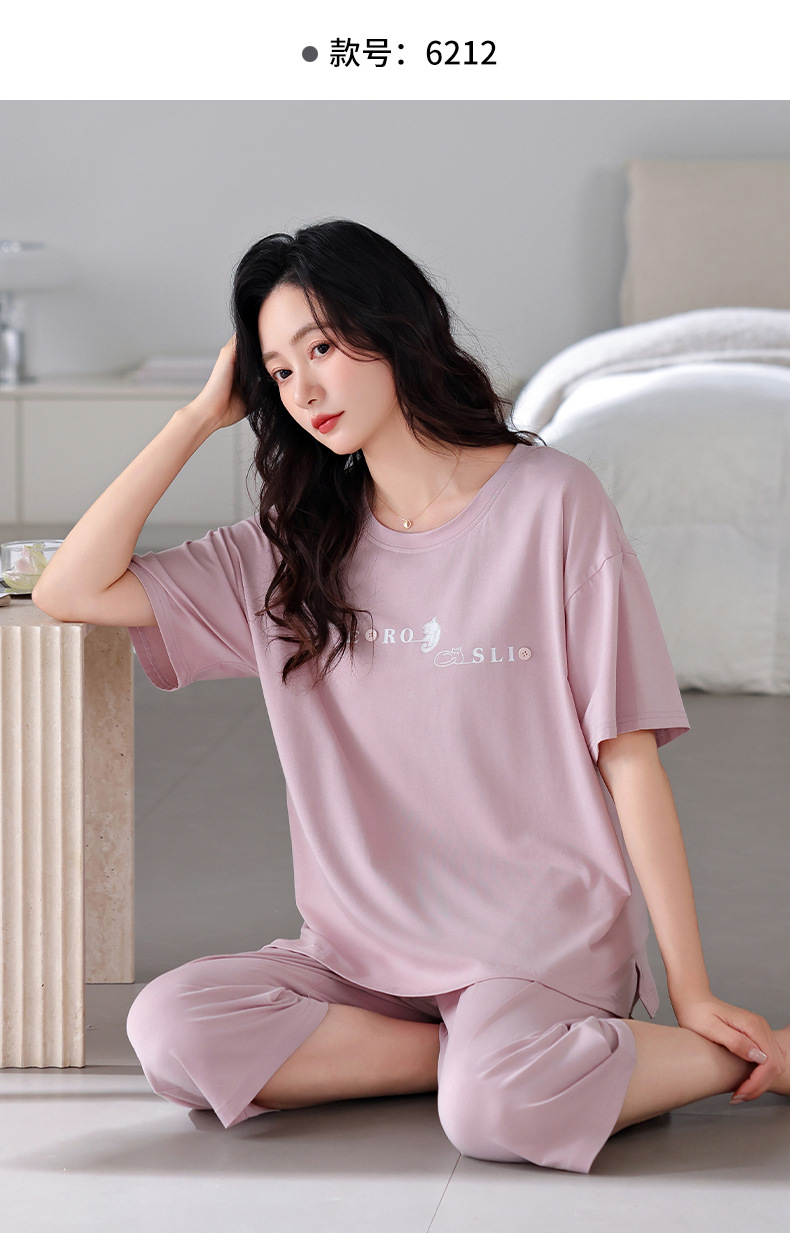 丁摩 睡衣女款夏胸垫薄款短袖七分裤家居服可外穿【棉+莫代尔】睡衣女夏5ZF-6212