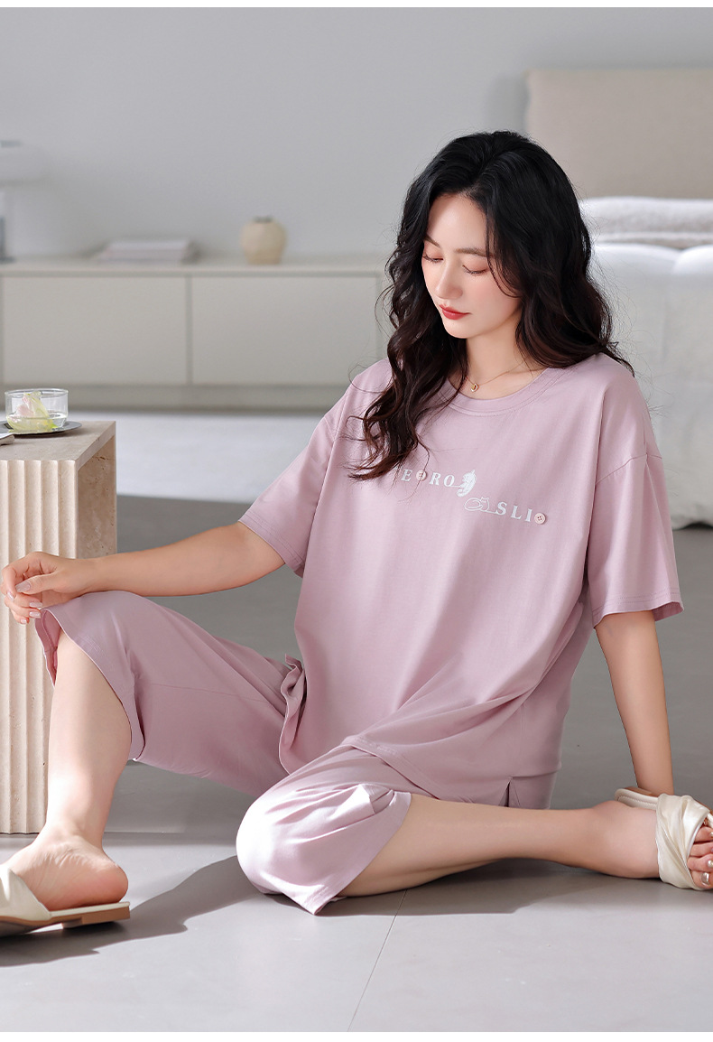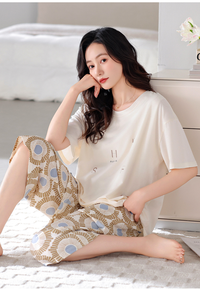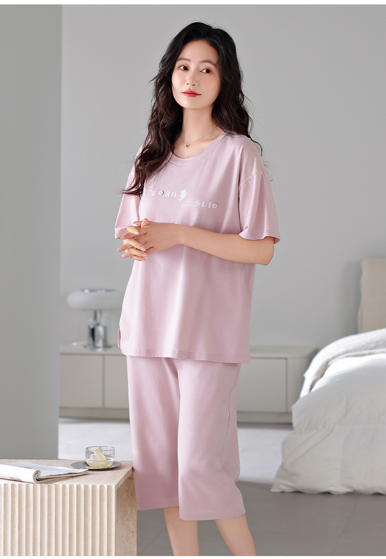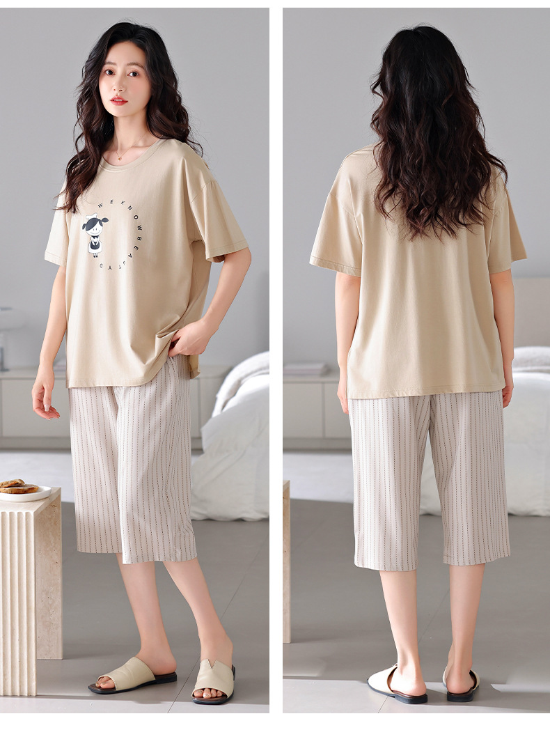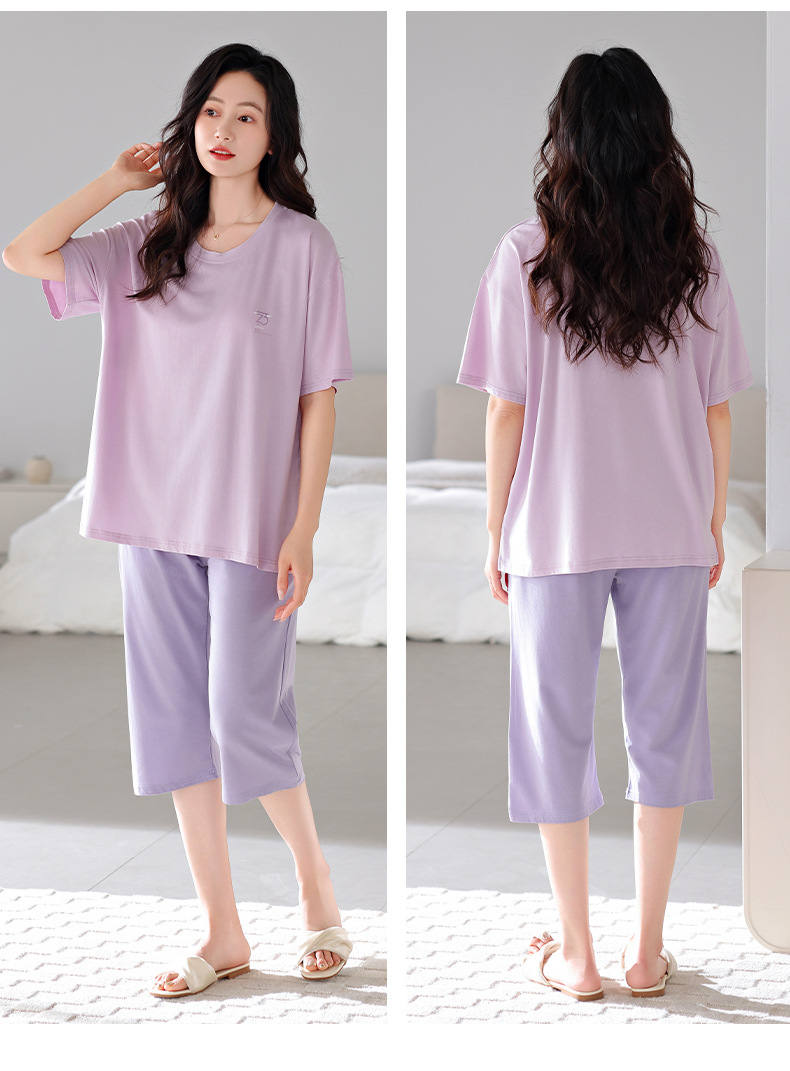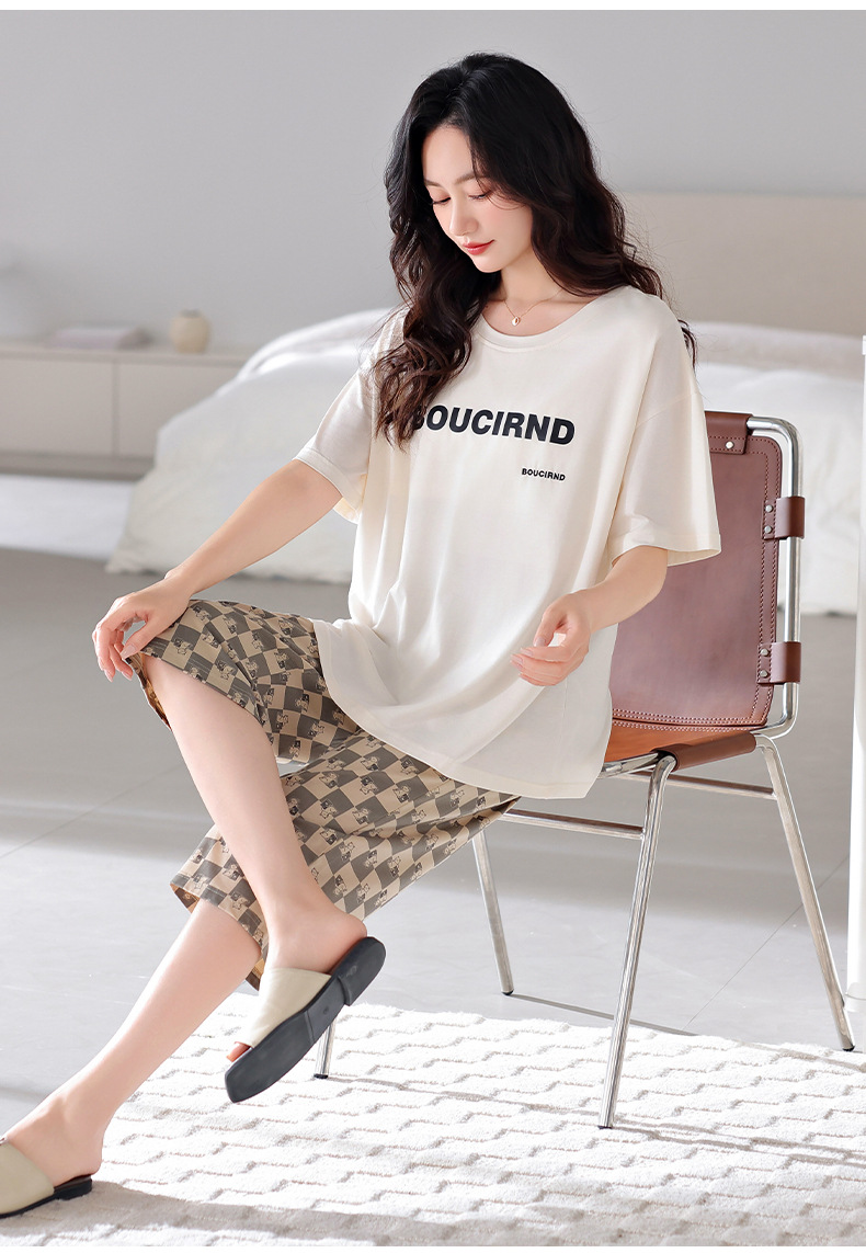 丁摩 睡衣女款夏胸垫薄款短袖七分裤家居服可外穿【棉+莫代尔】睡衣女夏5ZF-6212