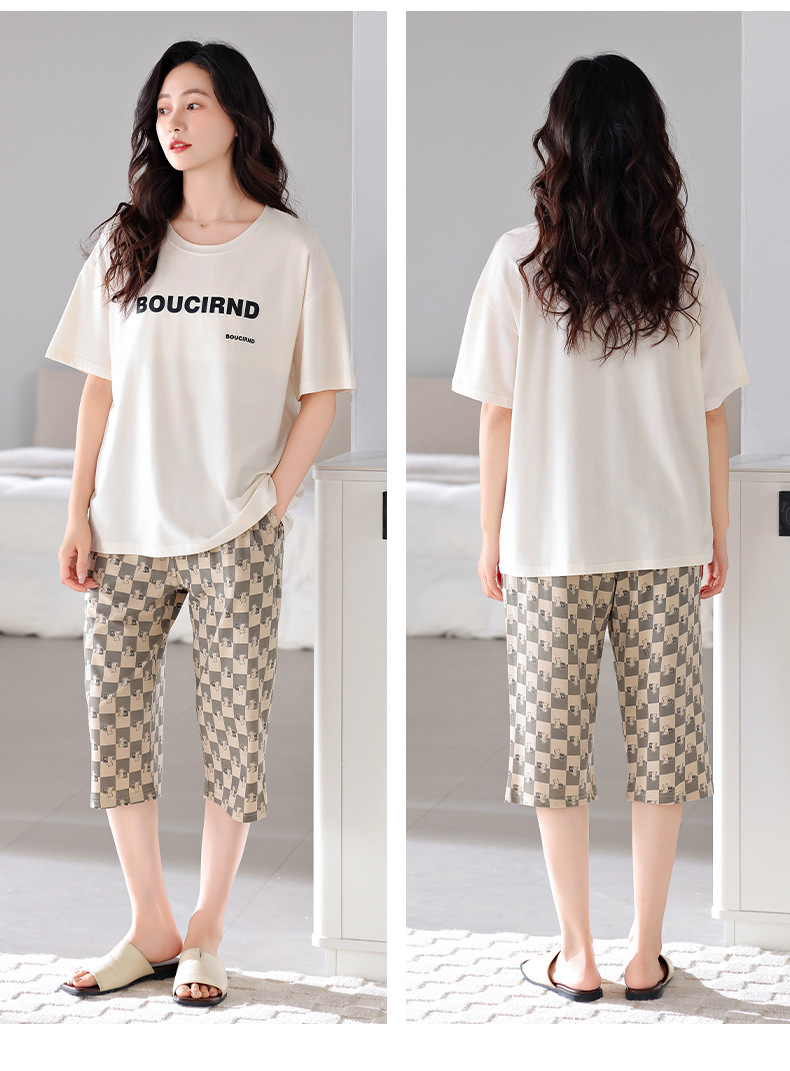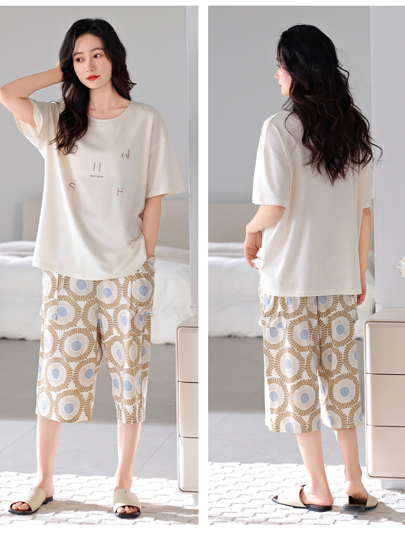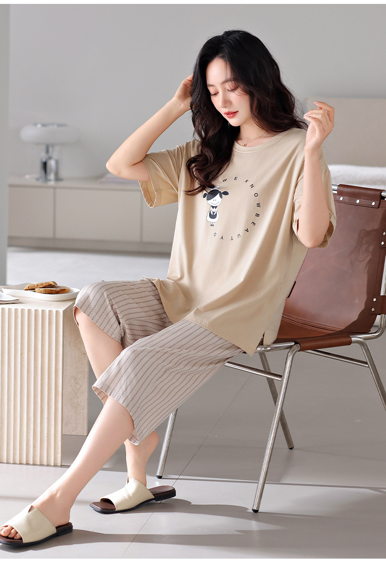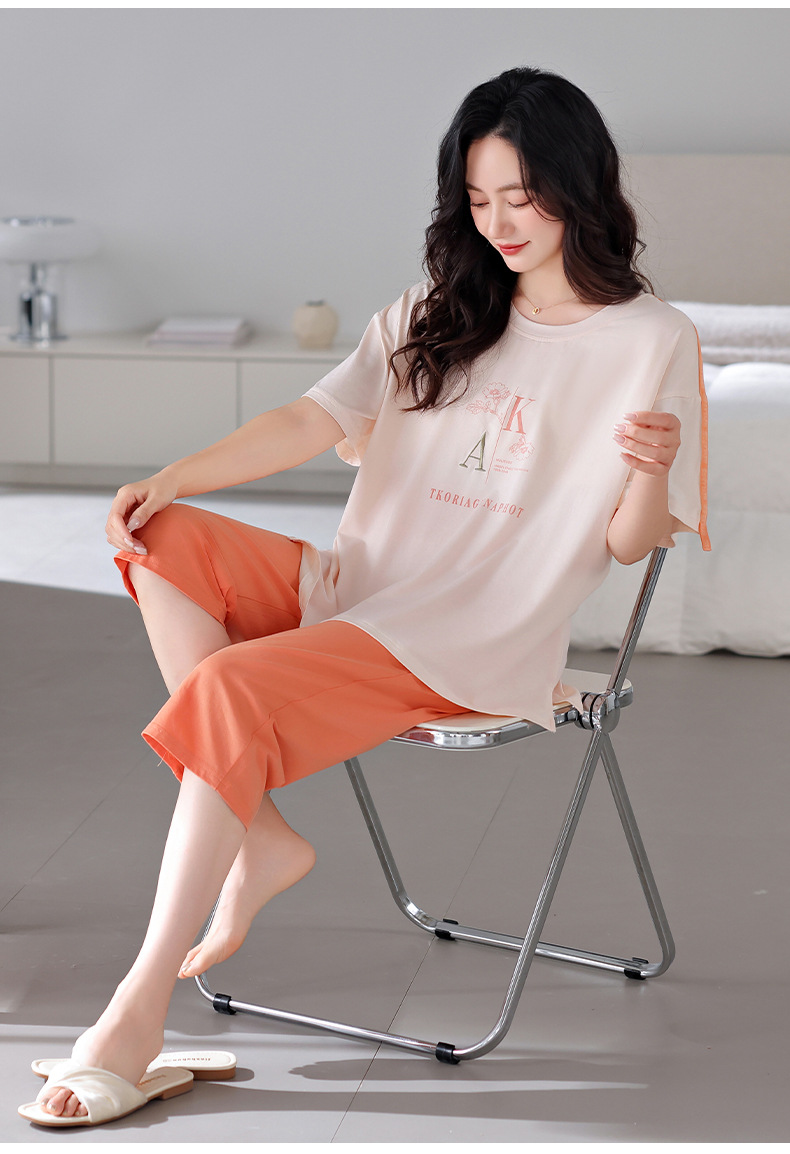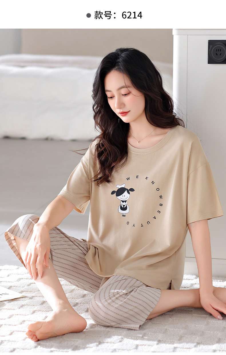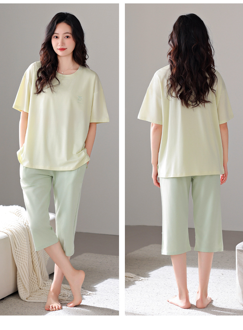 丁摩 睡衣女款夏胸垫薄款短袖七分裤家居服可外穿【棉+莫代尔】睡衣女夏5ZF-6212