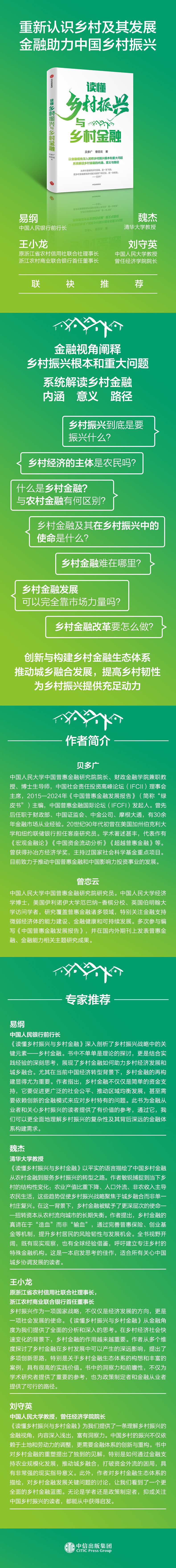 1.问题导向,正本清源。实施乡村振兴战略是建设现代化经济体系的重要基础,是建设美丽中国的关键举措,是实现全体人民共同富裕的然选择。本书以乡村振兴战略为大背景,广纳海内外发展经验线索,直击乡村经济发展过程中常常存在困惑甚至误解的问题,探求本质,正本清源。2.作者专业。本书领衔作者贝多广是国内知名金融专家,拥有头部金融机构和监管机构工作背景,近年来致力于推动中国普惠金融和影响力投资发展,经常为党政机关、企业中高层管理者授课。第二作者曾恋云,为中国人民大学中国普惠金融研究院研究员,研究覆盖普惠金融诸多领域,特别关注金融支持微弱经济体的能力建设、金融健康和可持续发展。本书是作者及其团队多年研究成果的重要结晶。