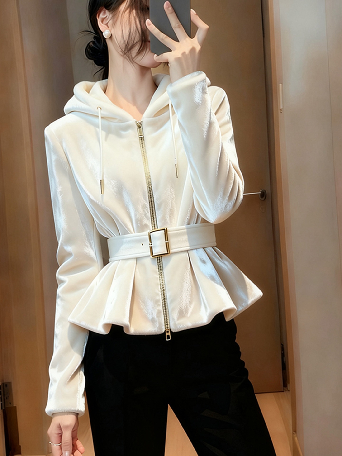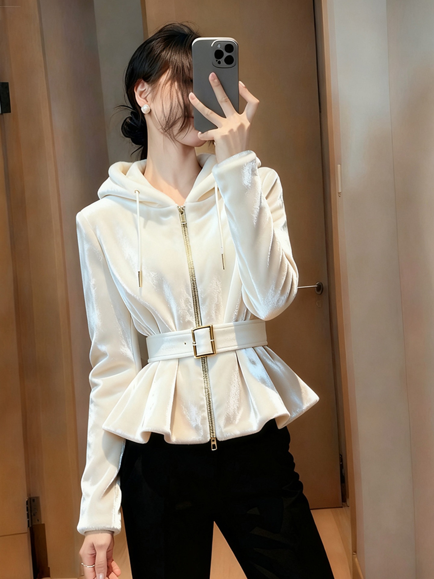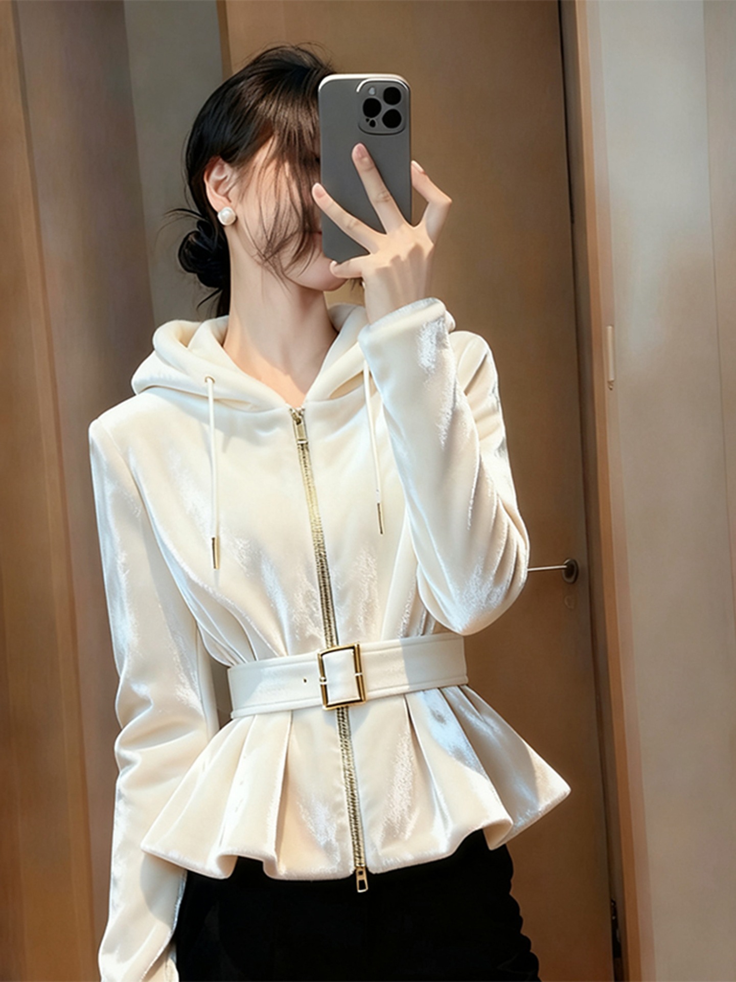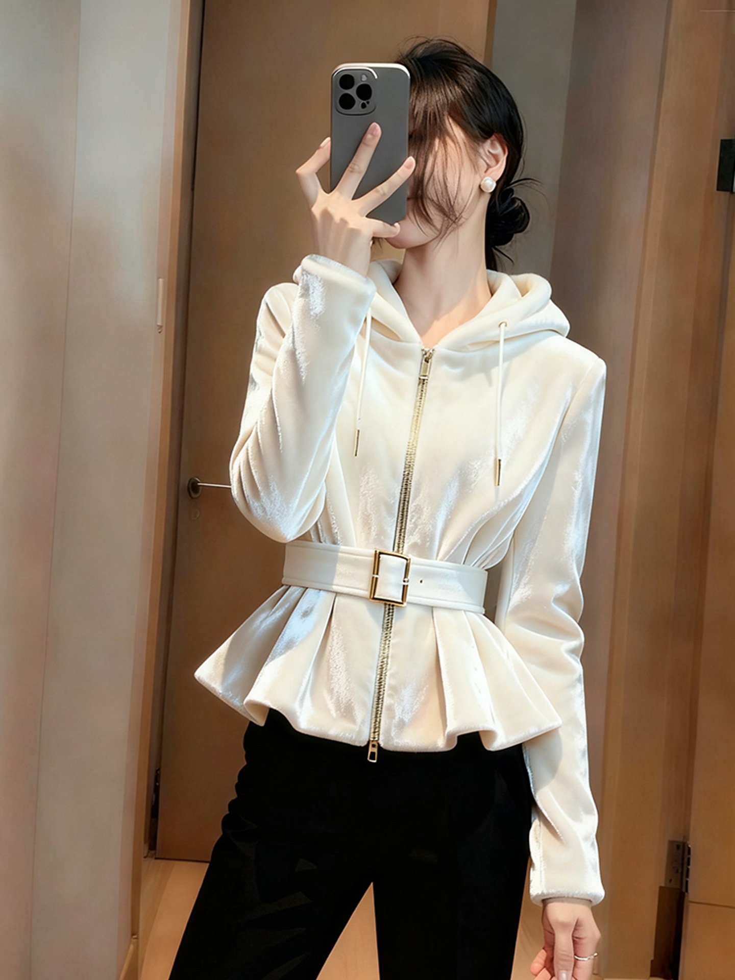 XMZ1521白色连帽丝绒外套女2025新款秋冬独特漂亮巨好看气质高端收腰上衣