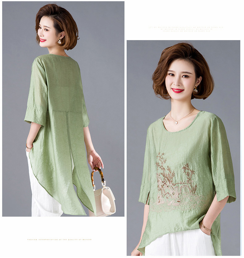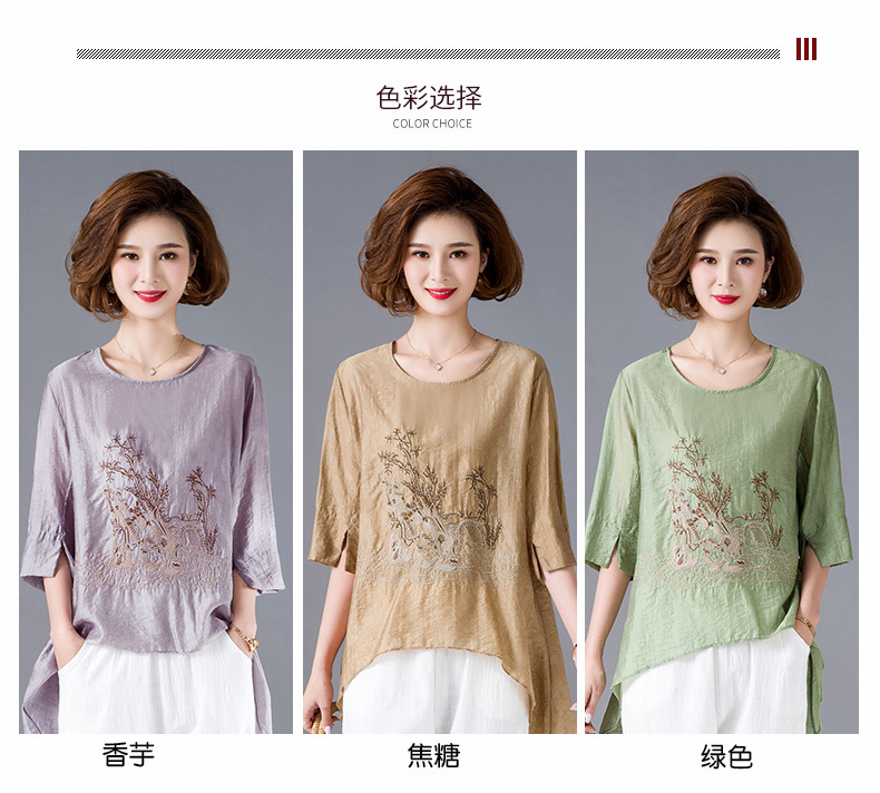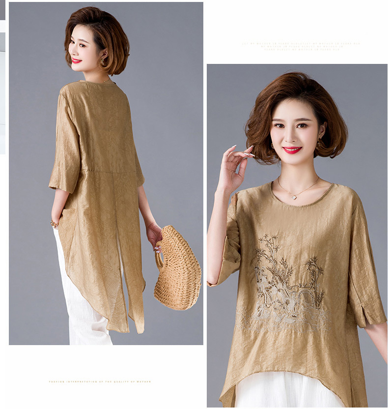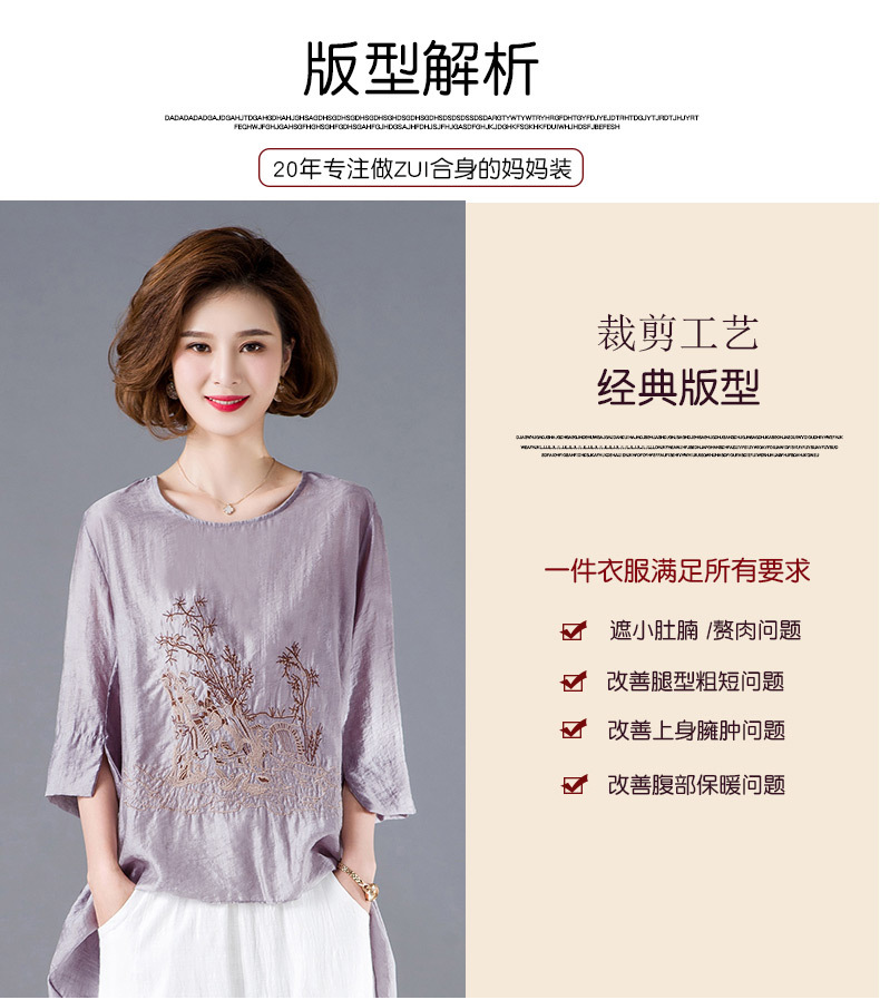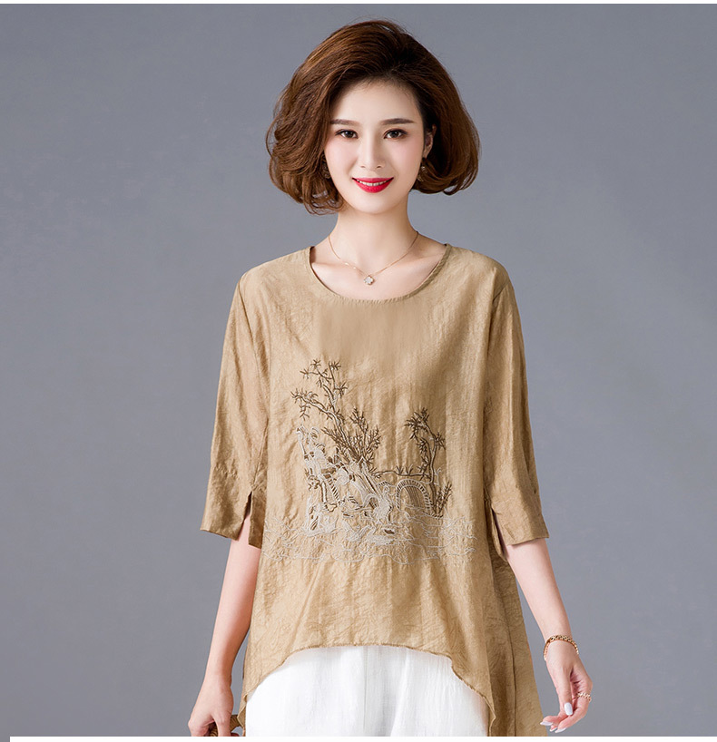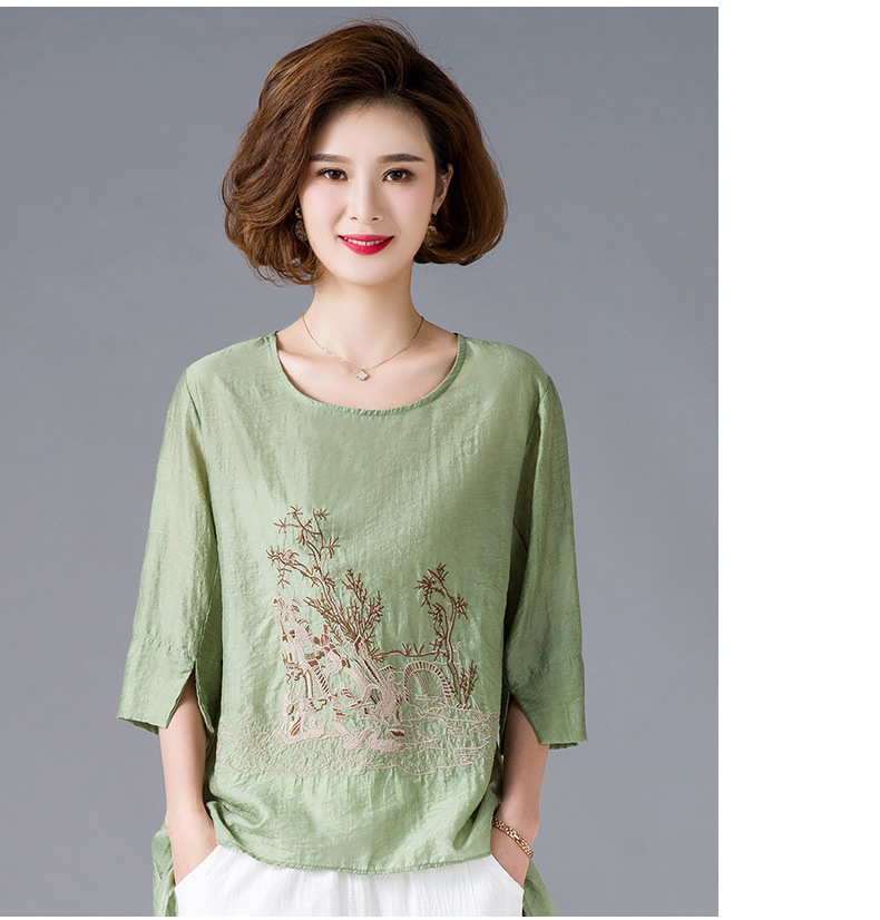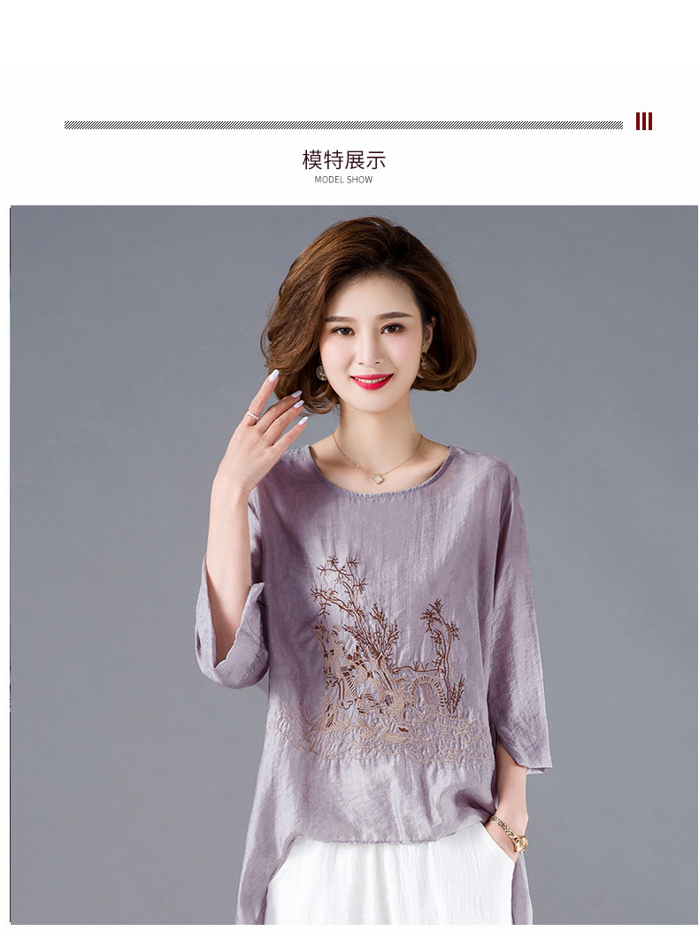 MQ-CF1981夏装中长款短袖纯苎麻圆领绣花上衣YY