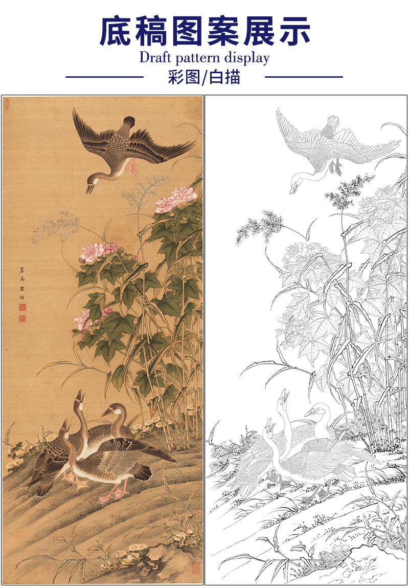 丘鉴花鸟工笔画白描底稿《芙蓉芦雁图》临摹勾线高清打印稿MD18