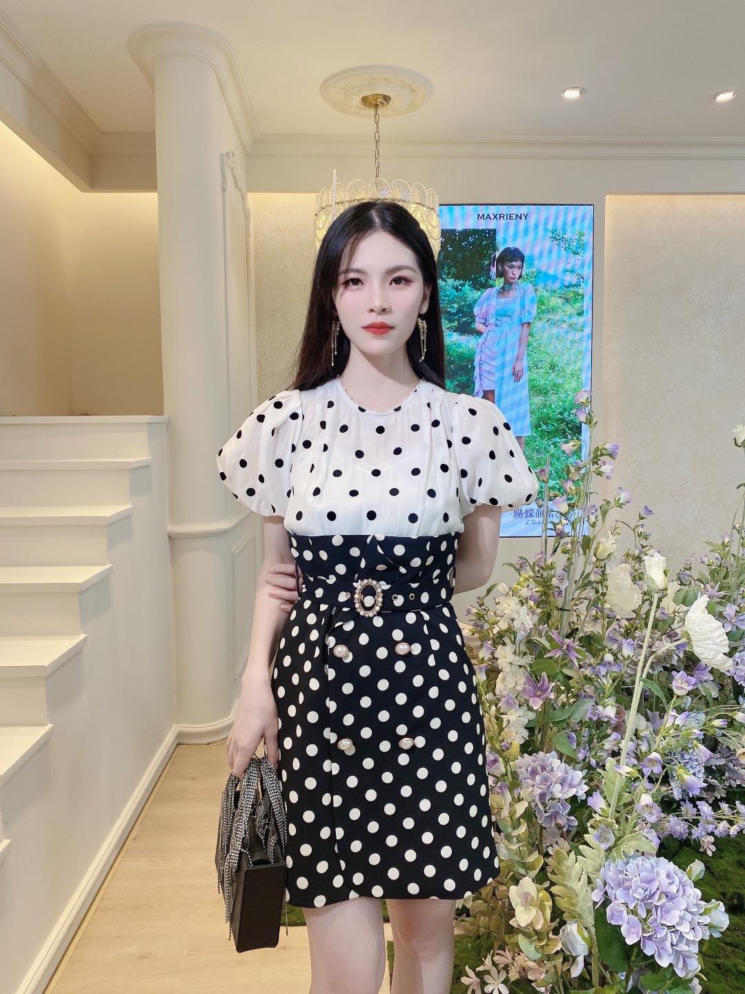 MAXRIENY复古夏季波点泡泡袖雪纺裙黑白撞色半身裙女连衣裙显瘦(货号:MS87DR309D00)