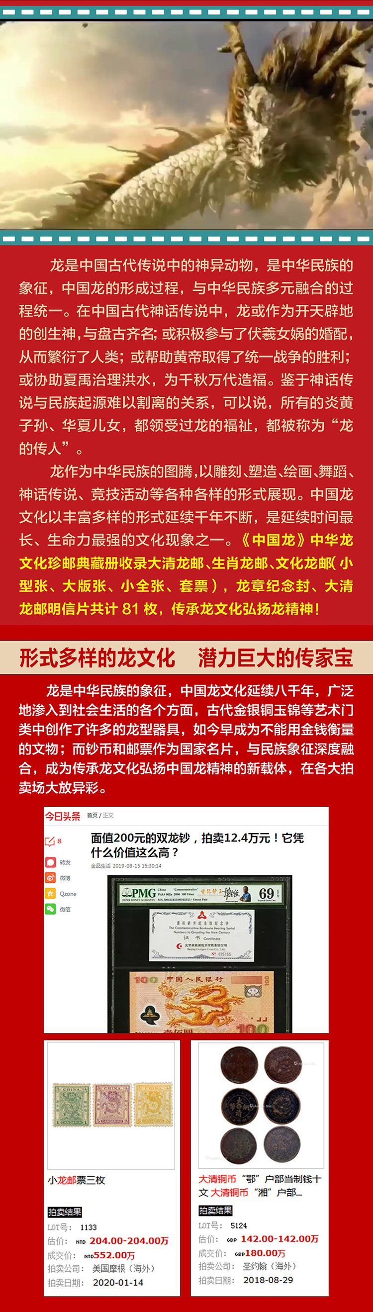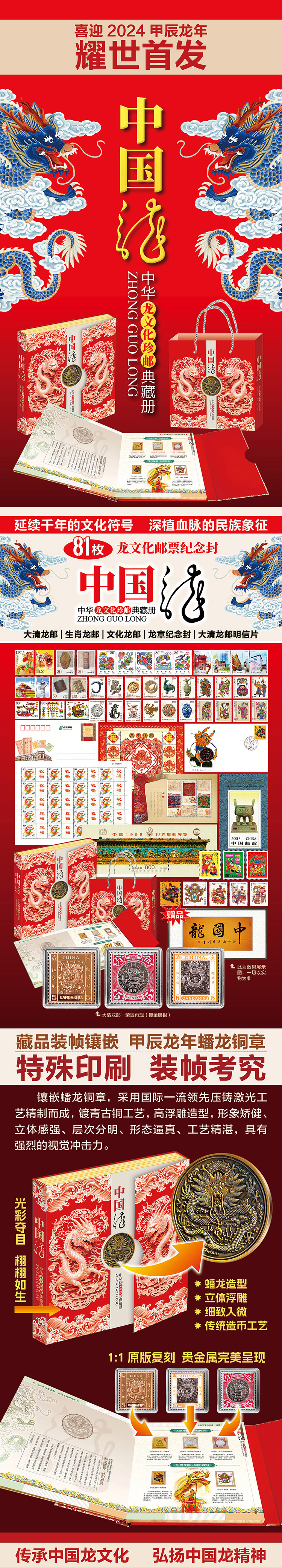 中华龙文化珍邮典藏册 镶嵌蟠龙铜章 用压铸激光工艺精制而成 镀青古铜工艺 高浮雕造型 立体感强 层次分明 形态逼真 工艺精湛