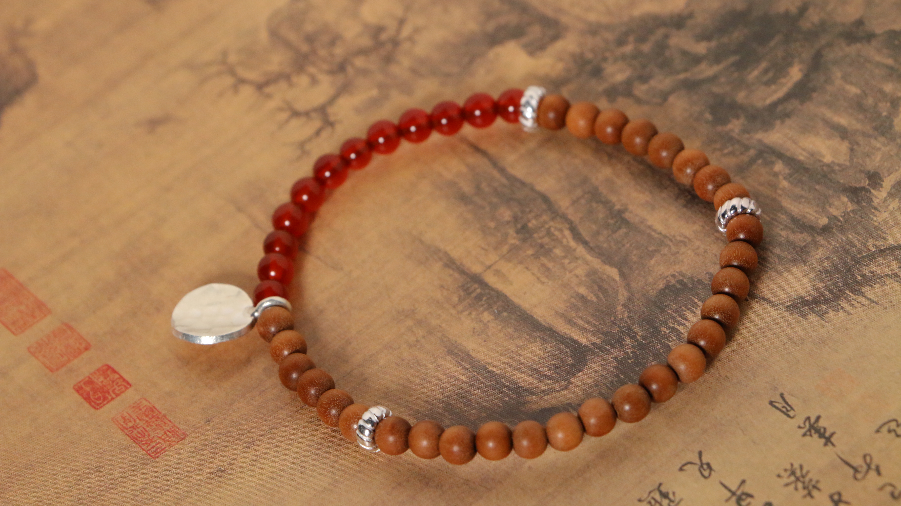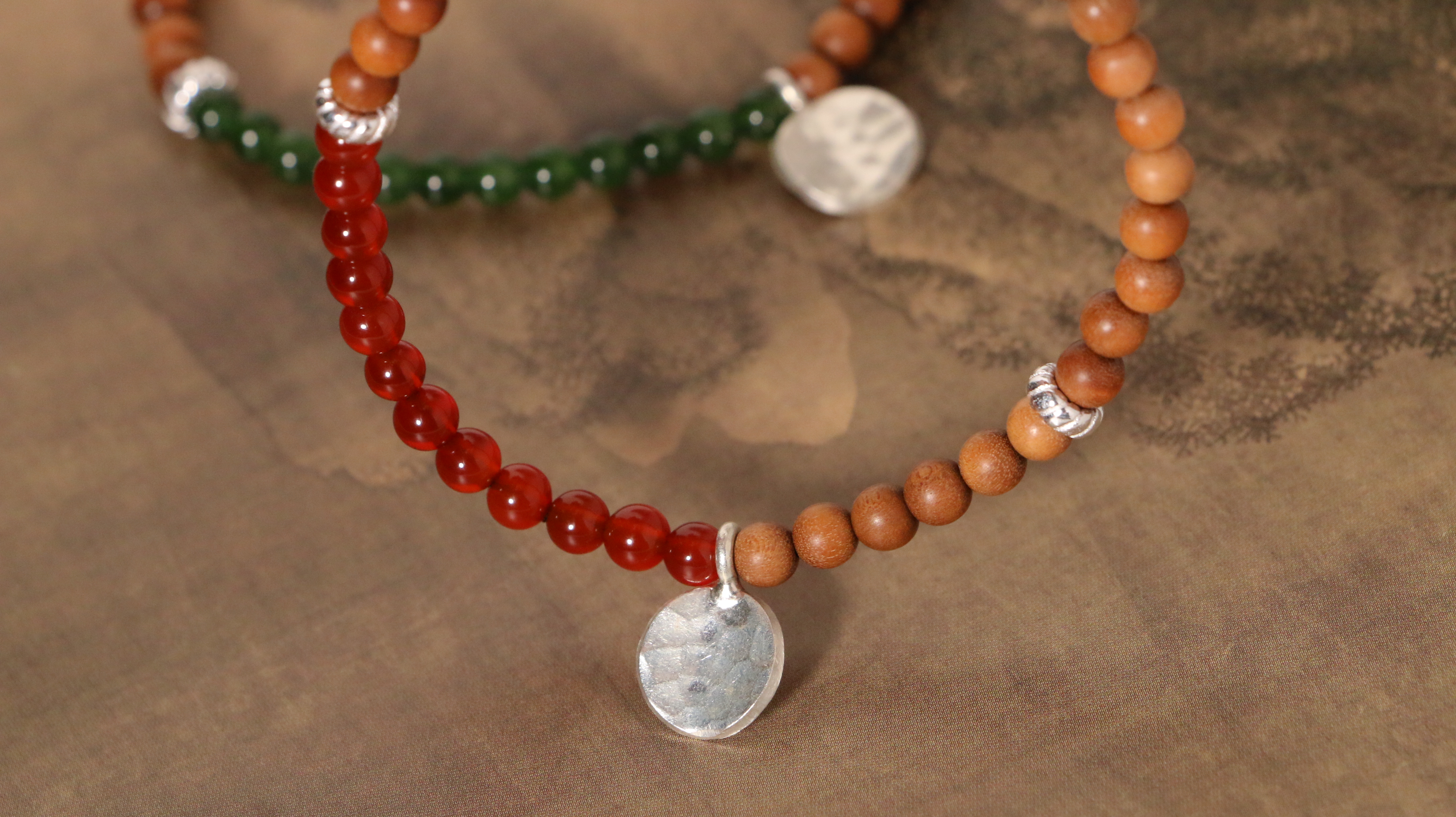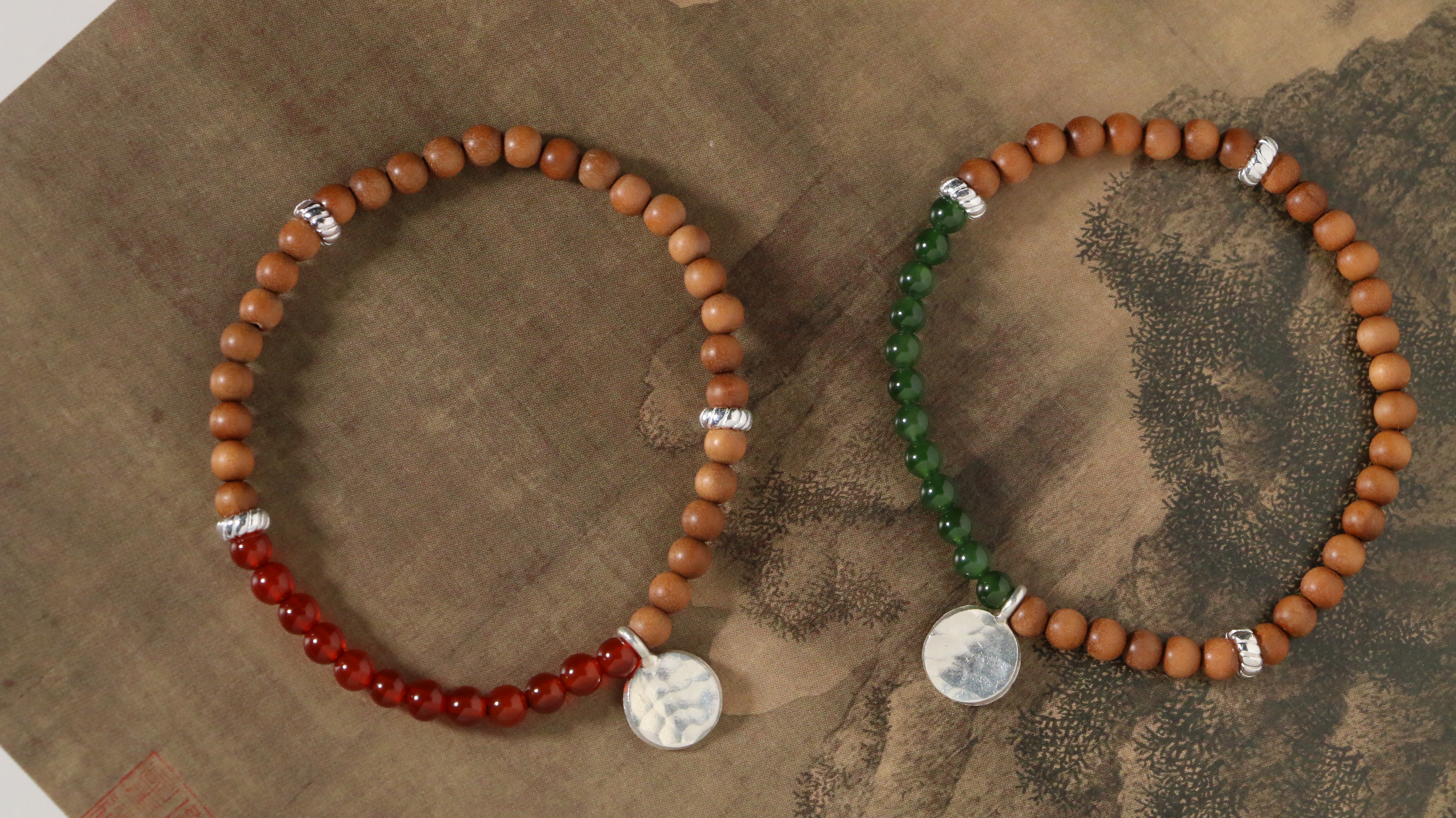 这两款手串,以质朴檀香为基底,搭配独特银饰坠片。