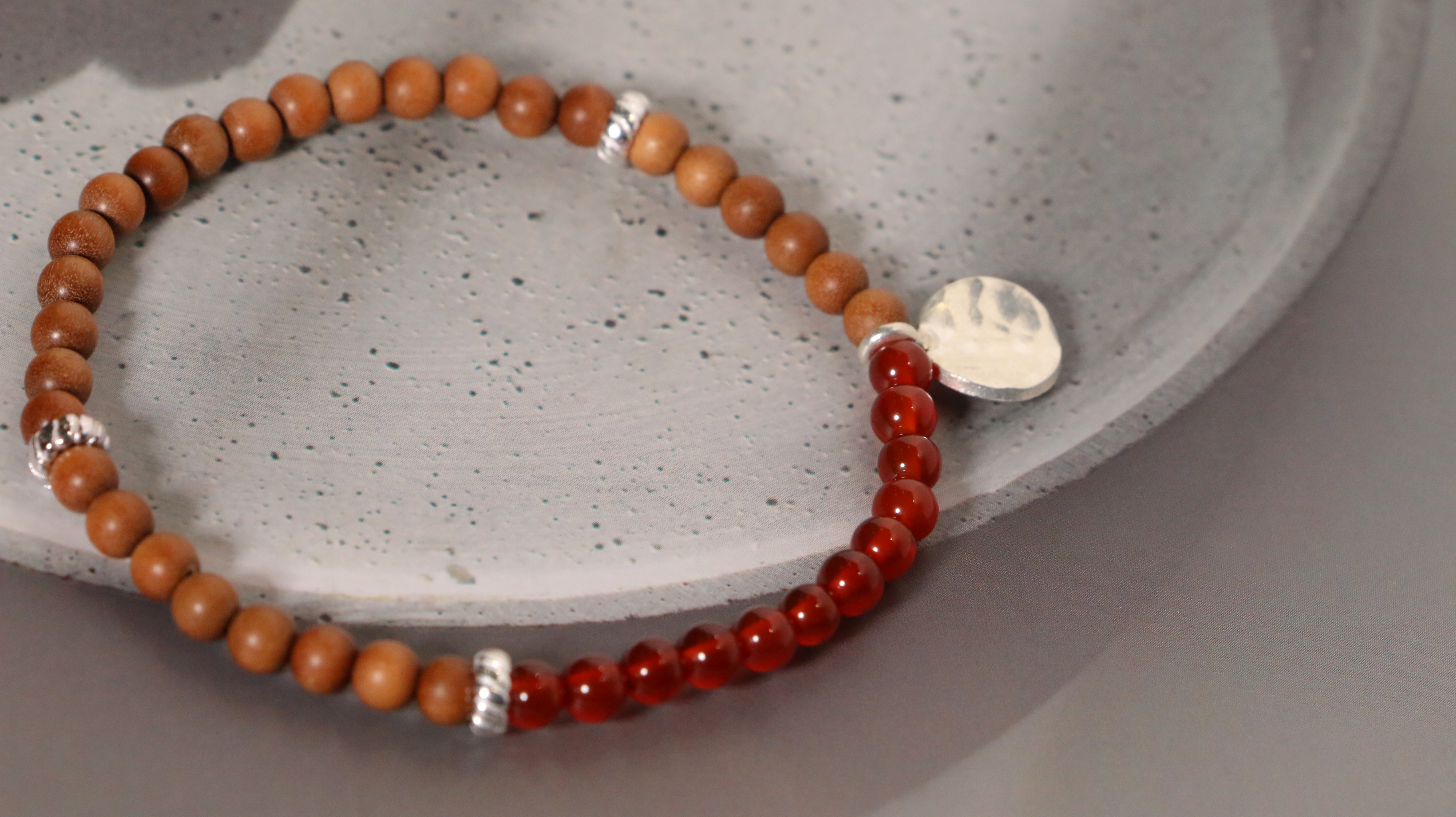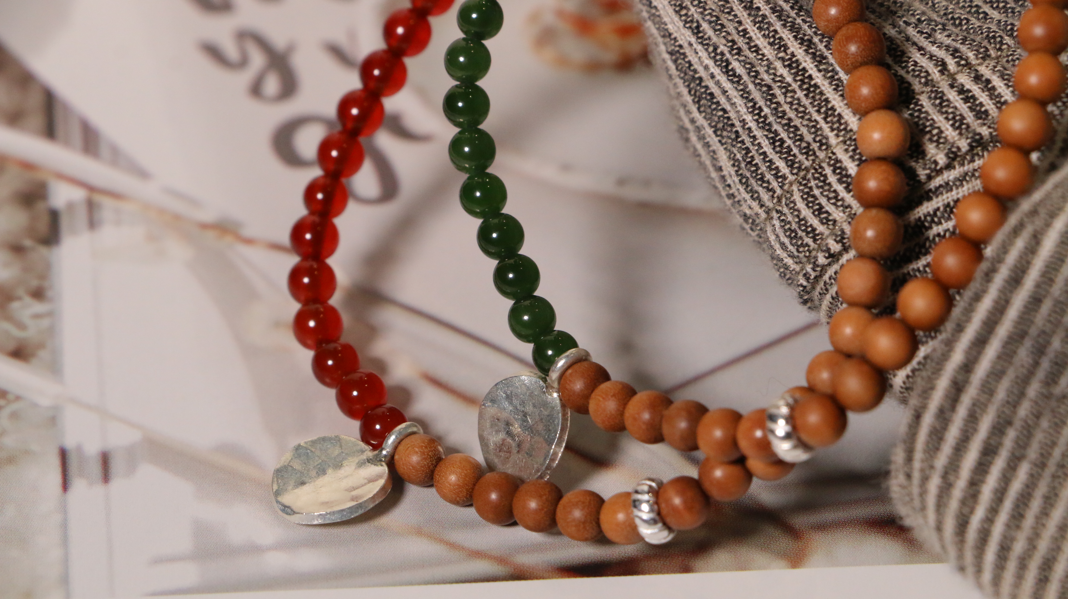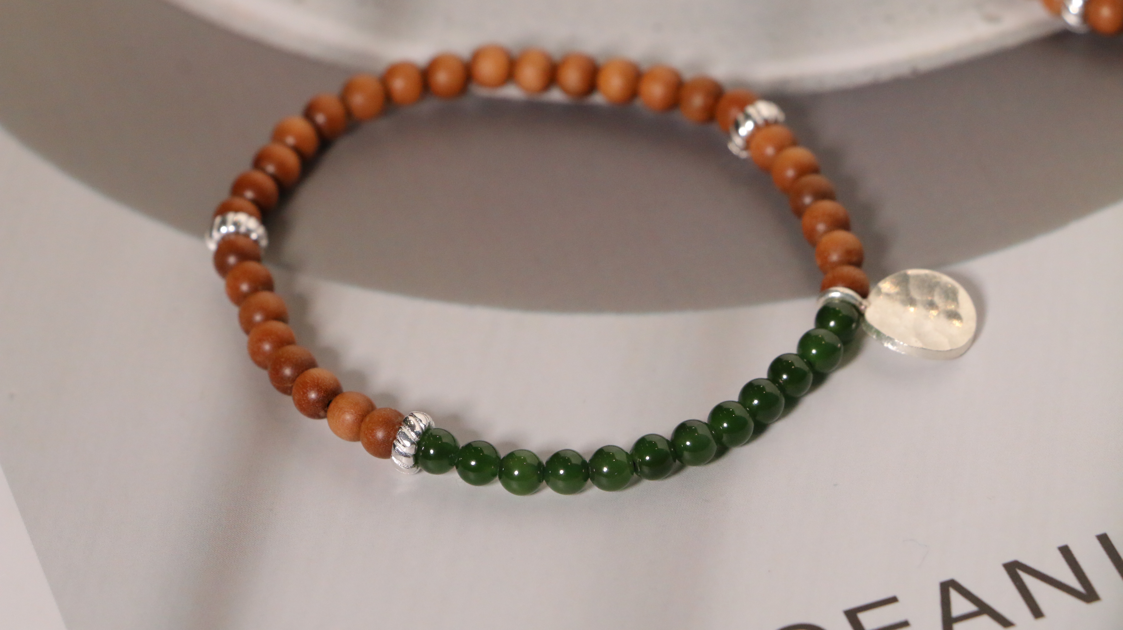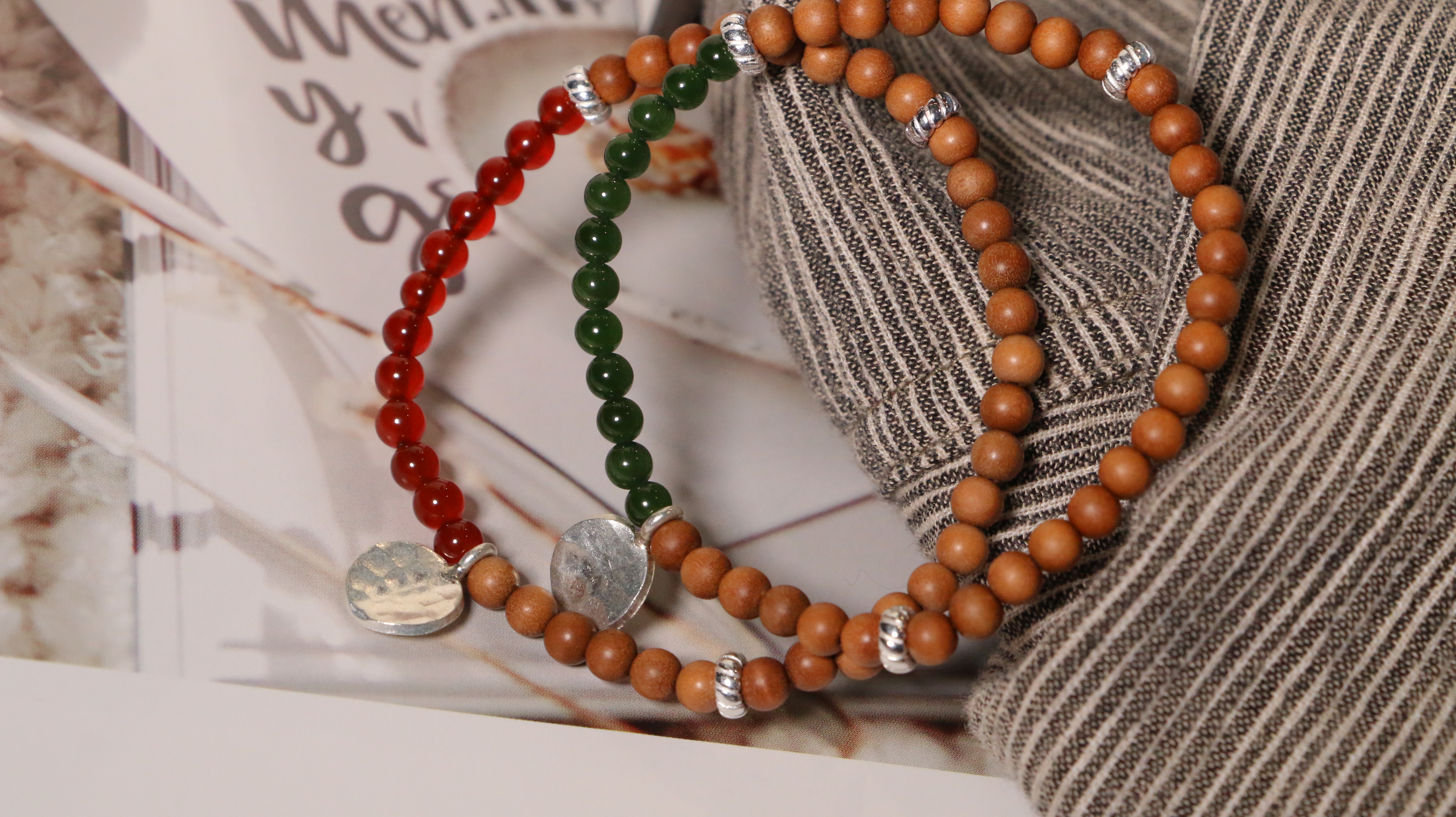 这两款手串,以质朴檀香为基底,搭配独特银饰坠片。