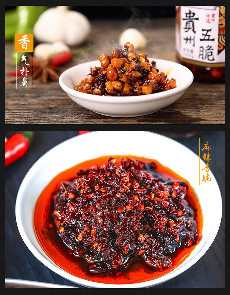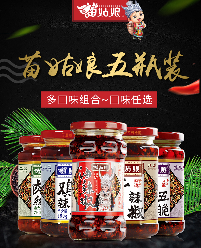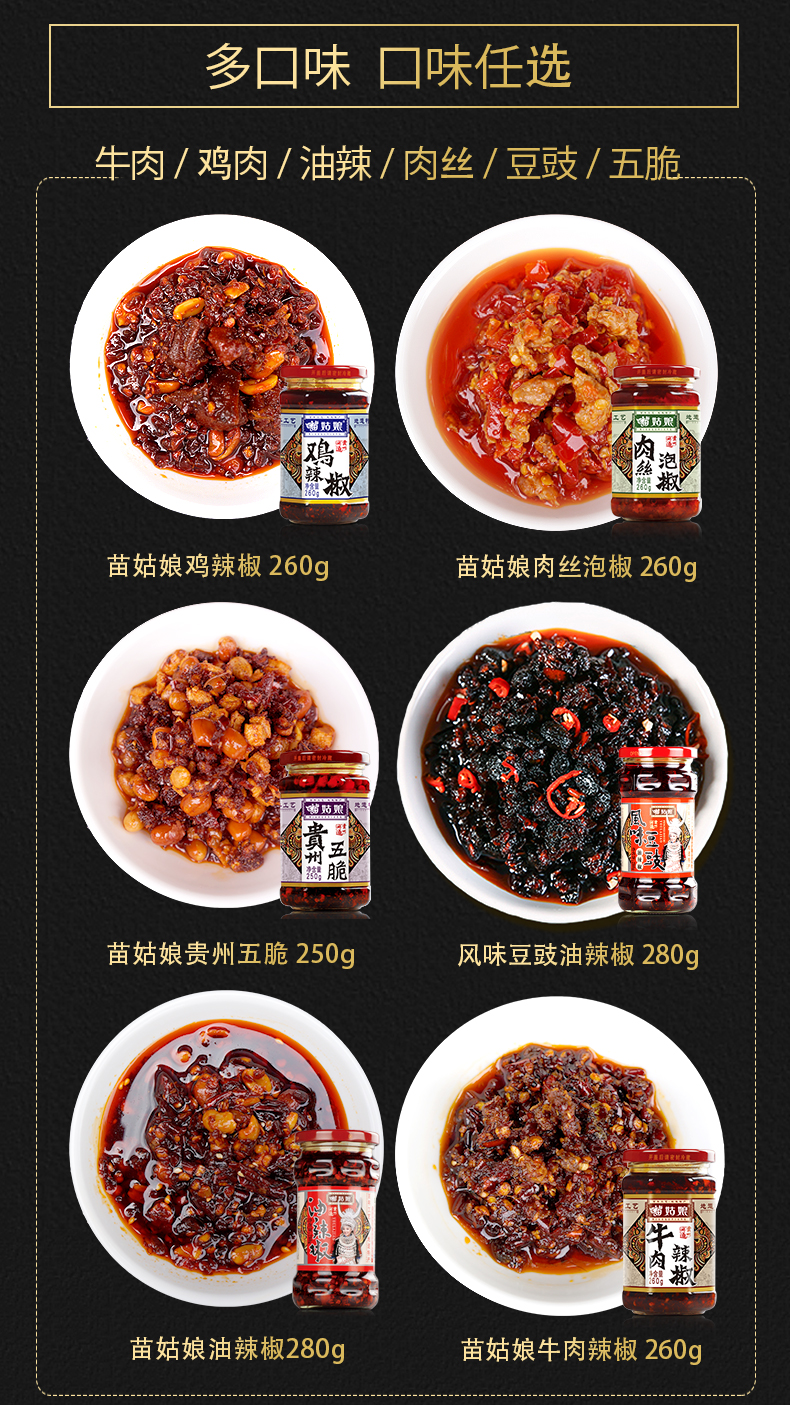 【苗姑娘五子登科】 辣椒酱组合 鸡辣椒260g+牛肉辣椒260g+肉丝泡椒260g+精制油辣椒260g+贵州五脆250g