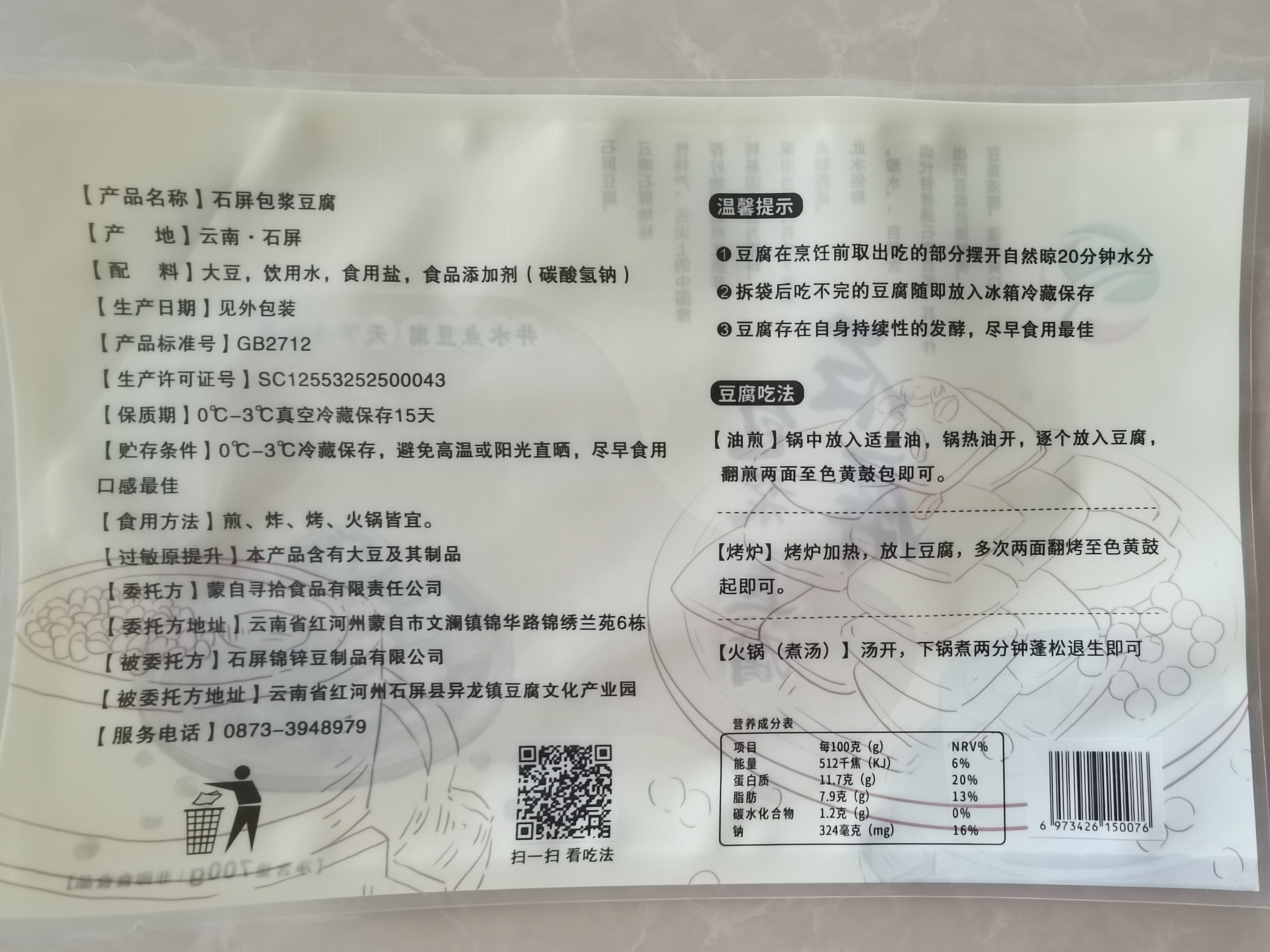 1.云南石屏县天然井水点制,代替化学石膏水,更健康,包浆豆腐可油煎、炸、烤,成型后还可用来煲汤。每天现做现发。