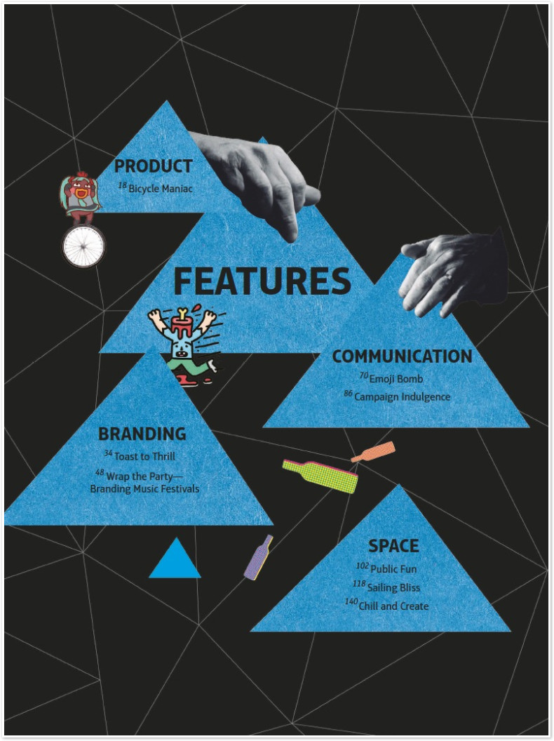 【FEATURES】视觉专题详细译码娱乐生活类品牌的传播设计,包括有自行车的创意、酒瓶包装、音乐节品牌、表情设计、公共娱乐空间、航海文化以及咖啡创意社区等